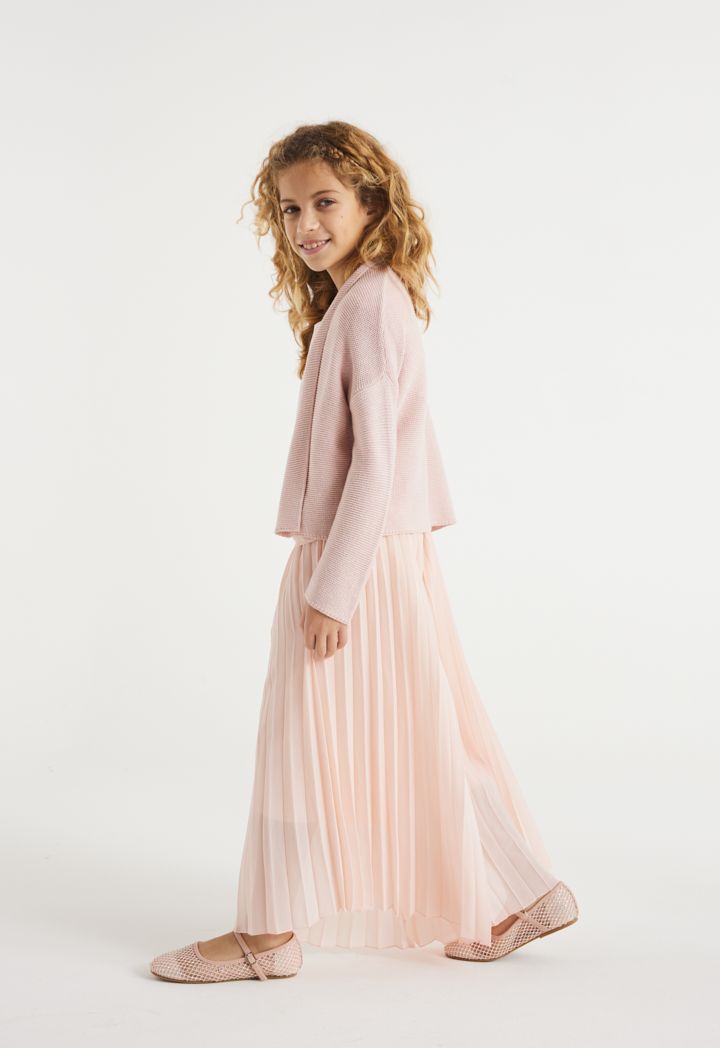 A lurex knitted jacket that features an open neck, an open body and long sleeves.