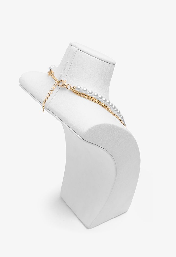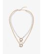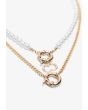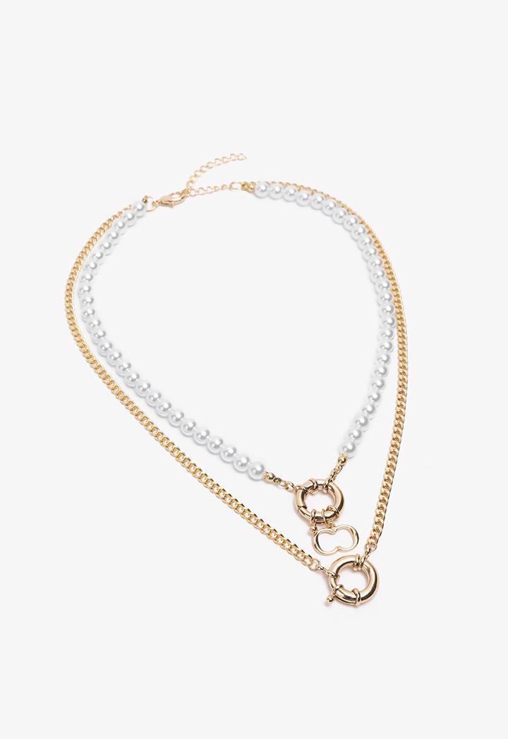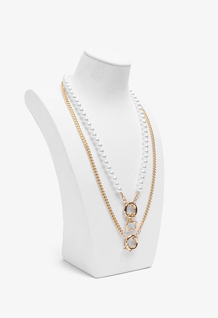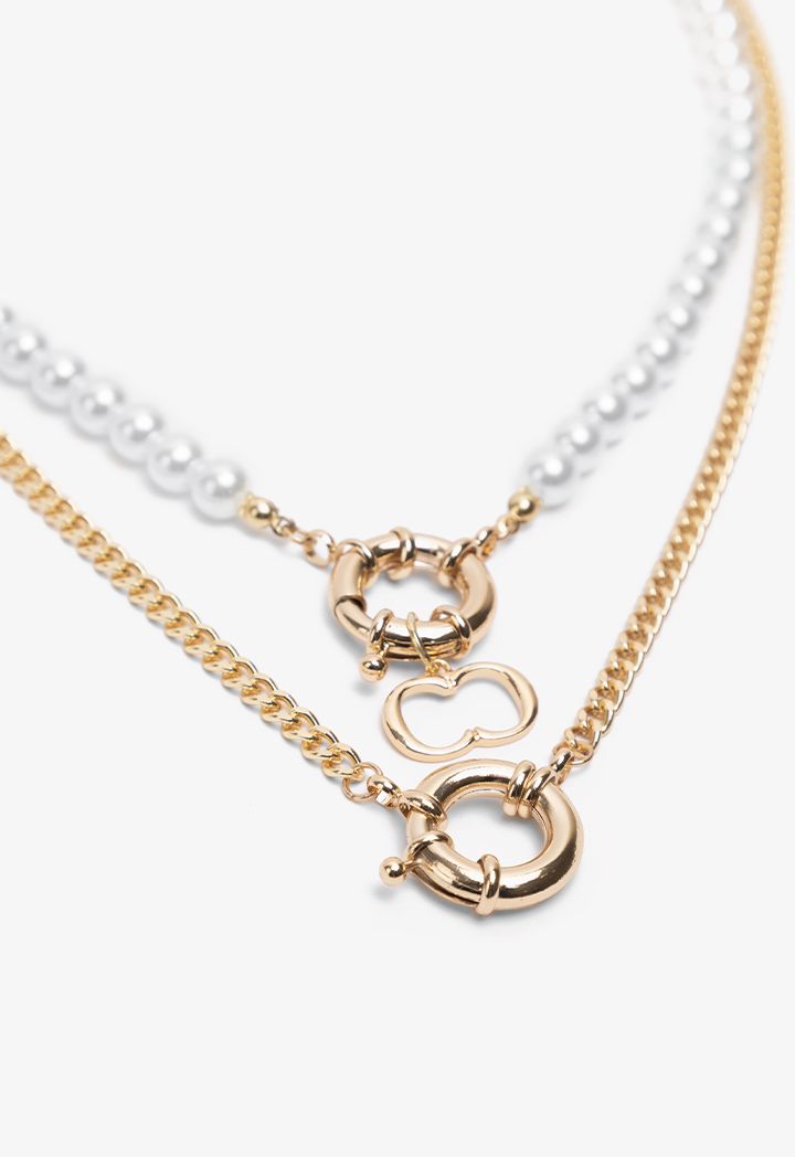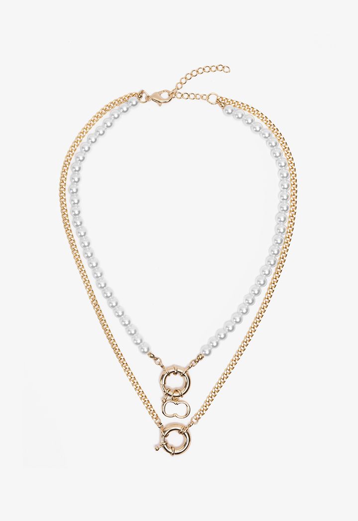 Include this monogram chain and faux pearls necklace in your looks for a luxurious touch.