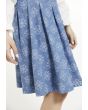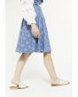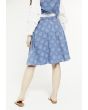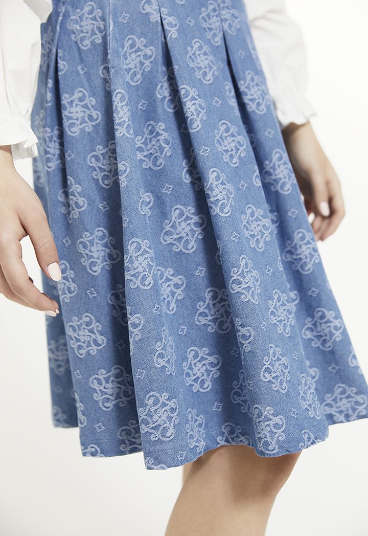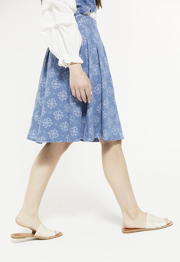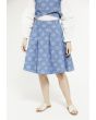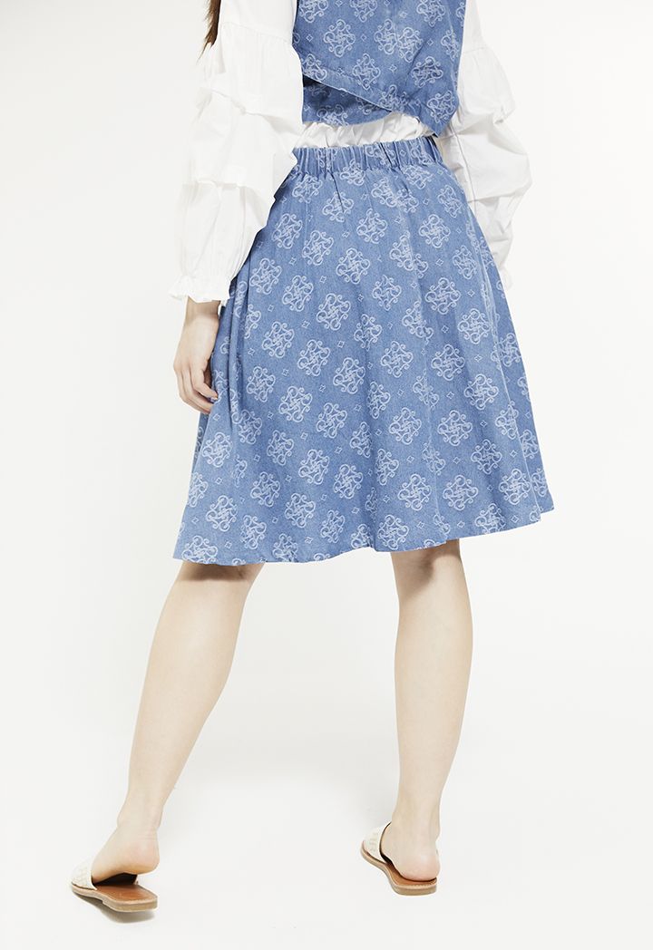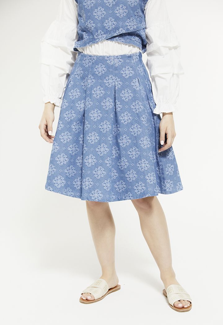 A denim skirt that supports a gathered waist, monogram design and a side zipper.