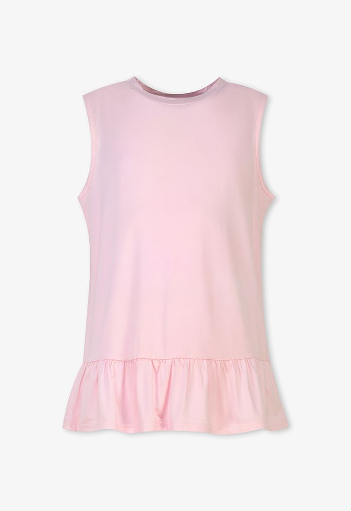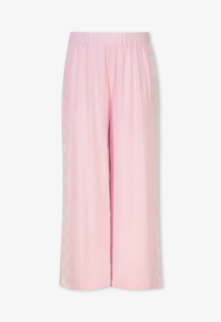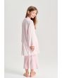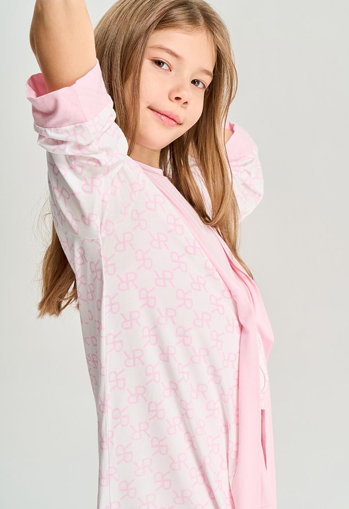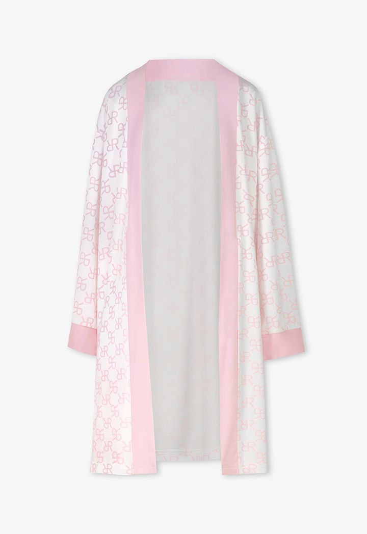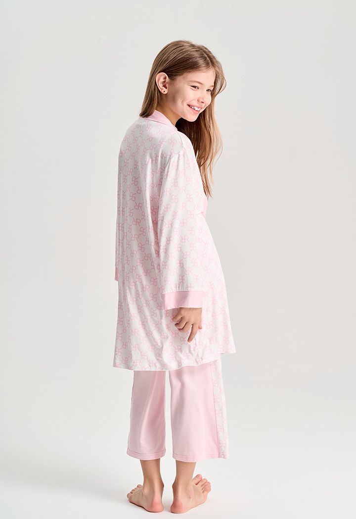 Design : Top: Solid, Ruffled Hem. Robe: Monogram Print. Trousers: Straight Cut, Side Pockets