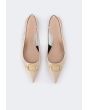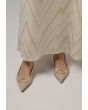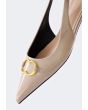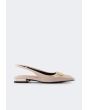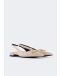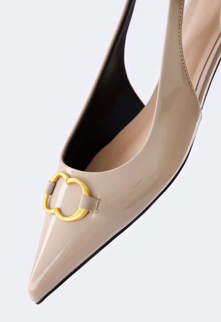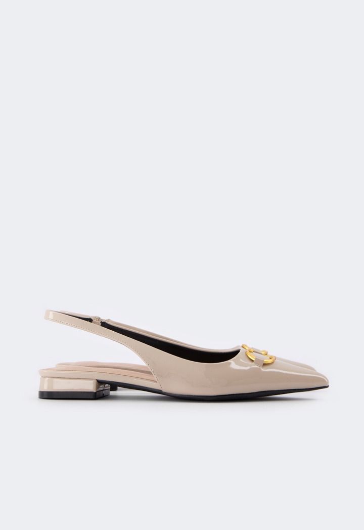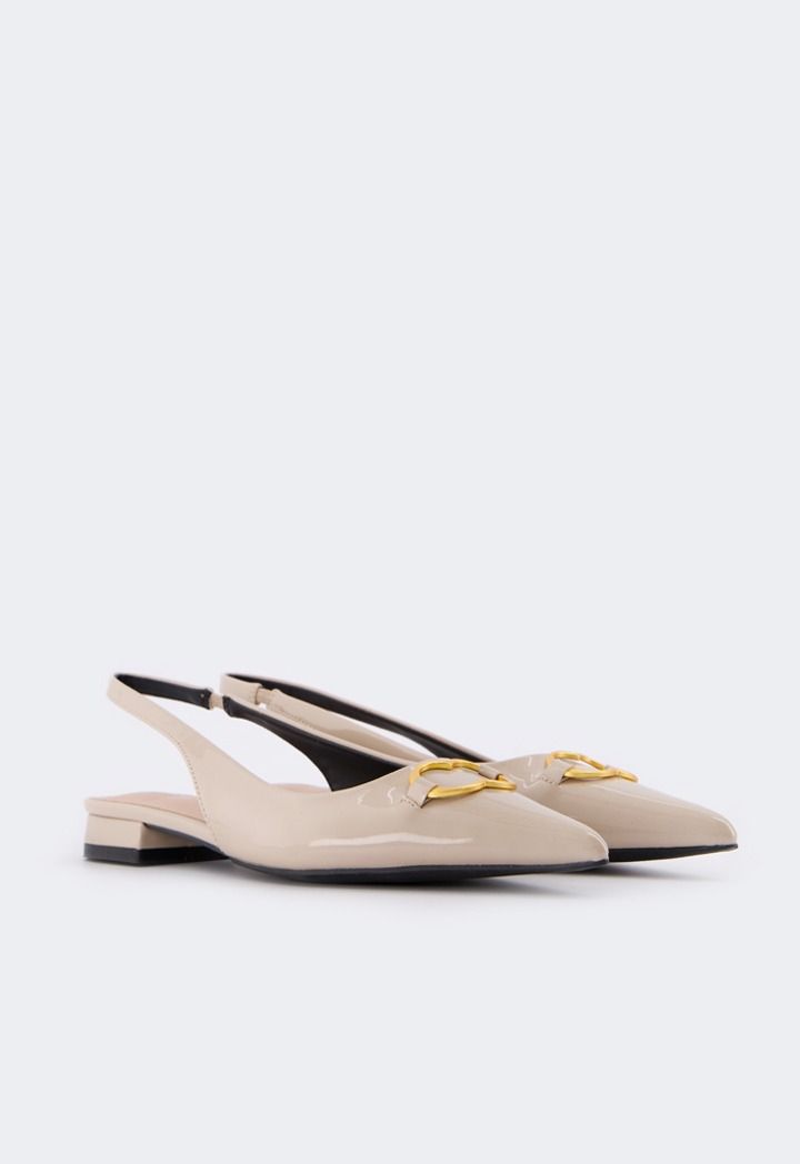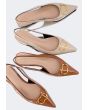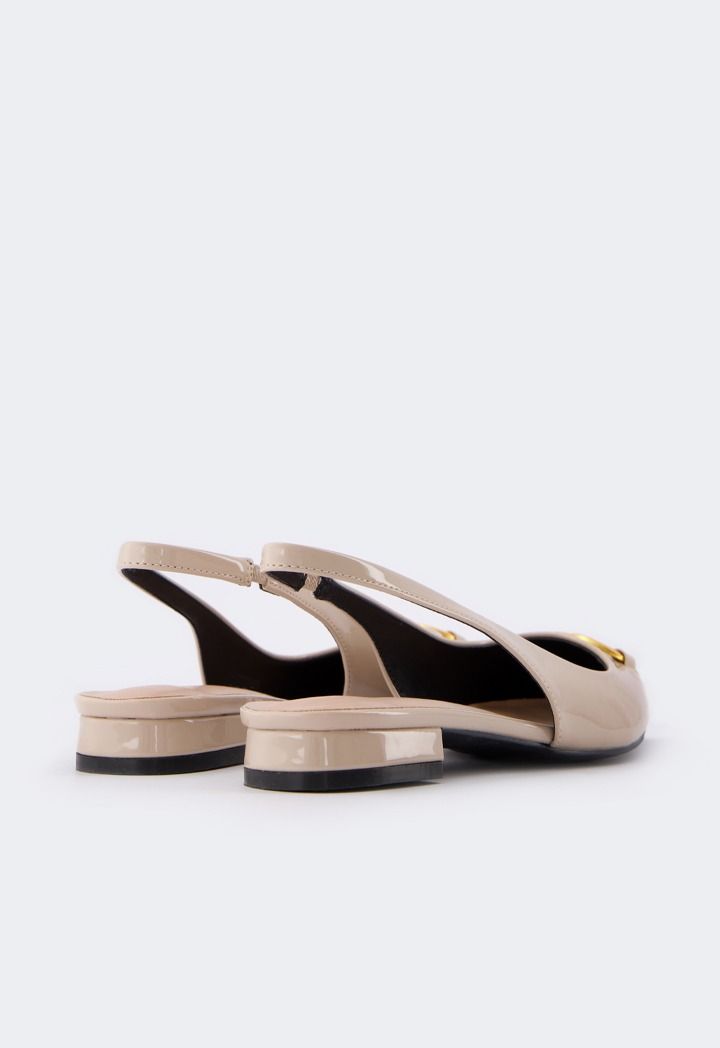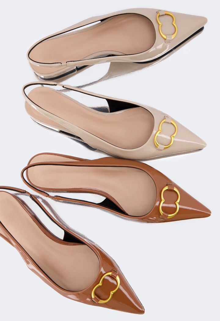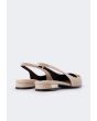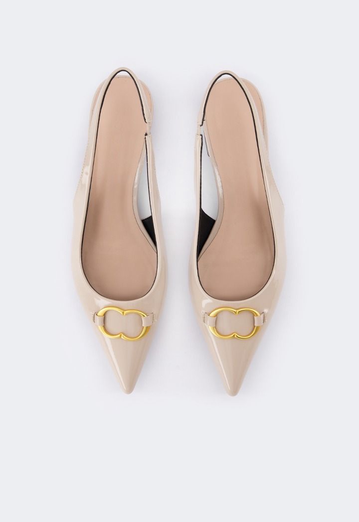 A pair of modern f;at mules that features a glossy monigram design with an elastic back ankle strap that is on trend.