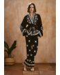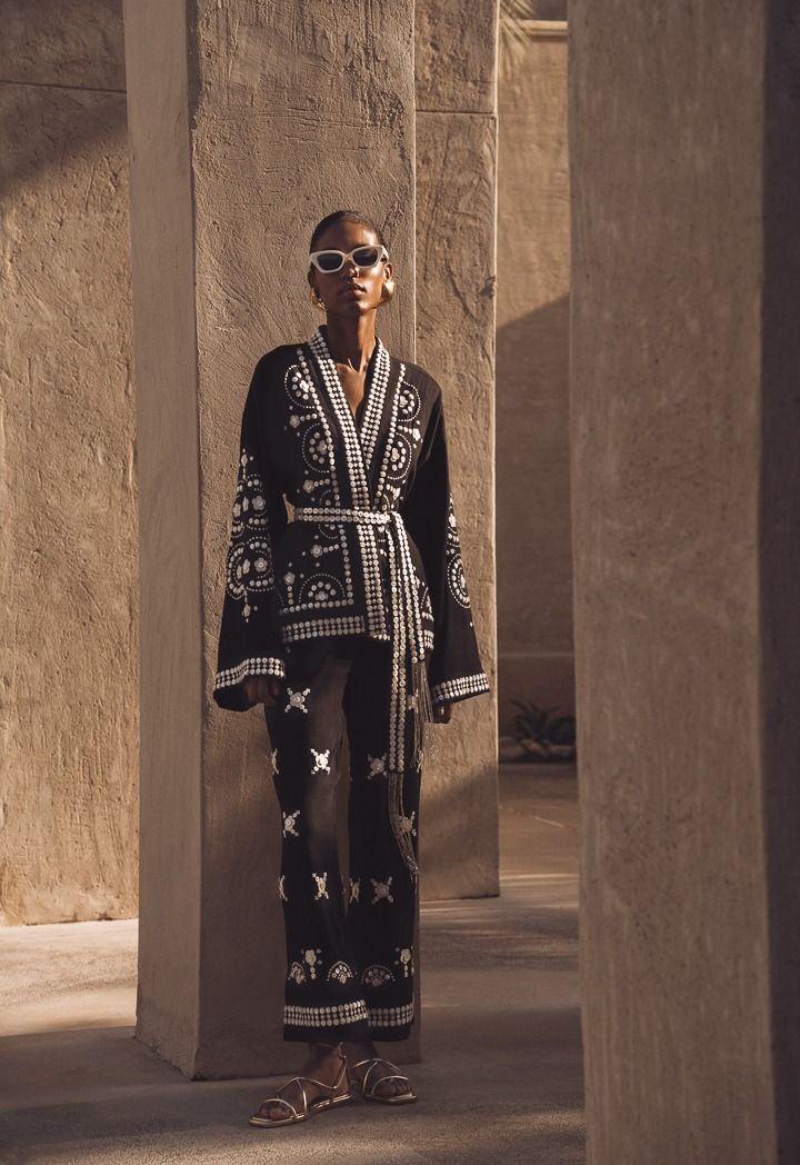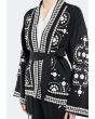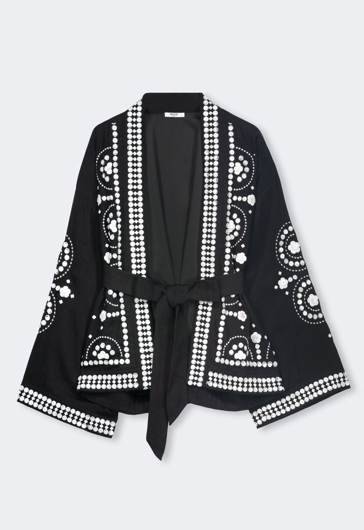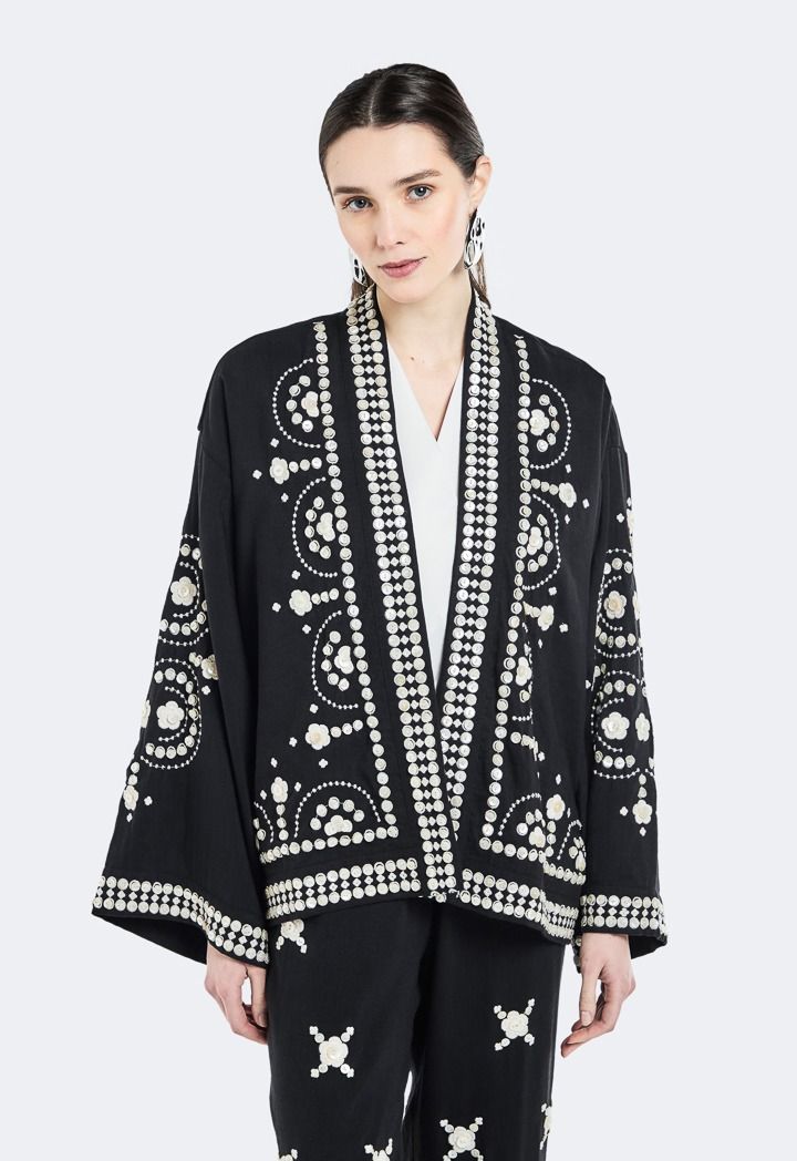 Design: Solid, Mother of Pearl Button Embellished, Embroidered, Attached Lining, Belted
