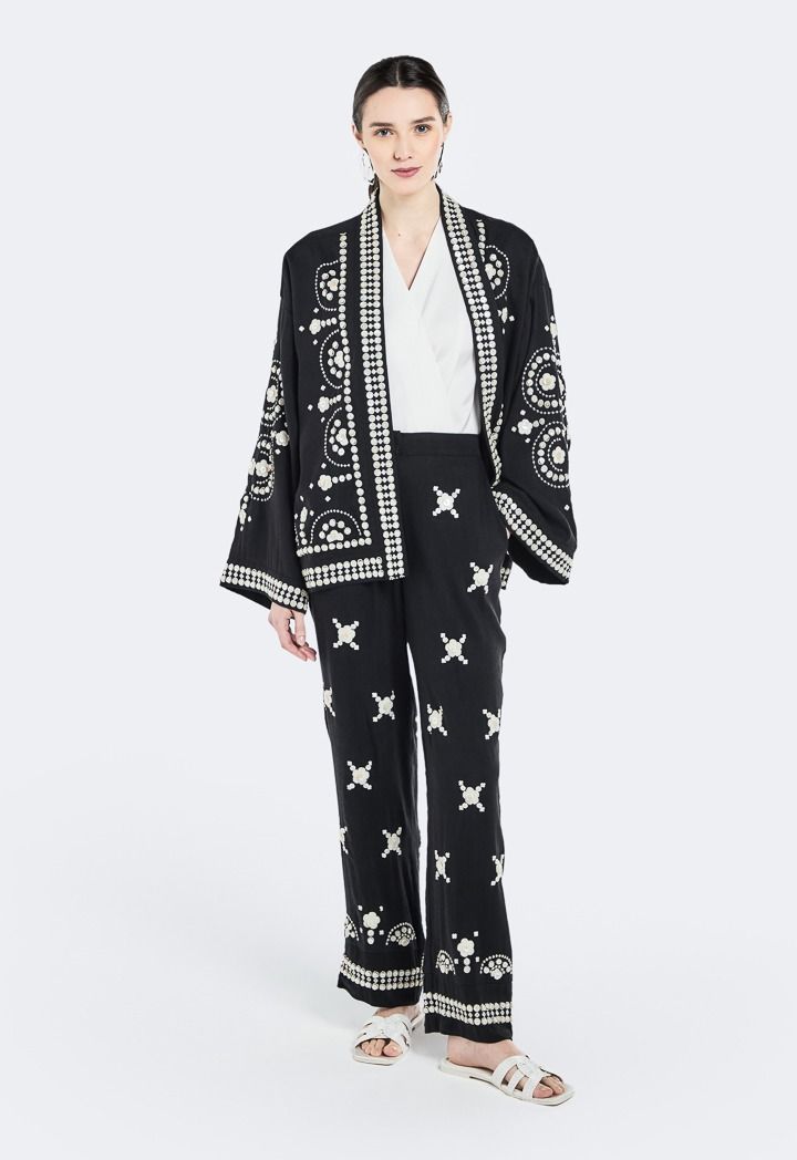Design: Mother of Pearl Button Embellished, Embroidered, Side Pockets, Straight Cut