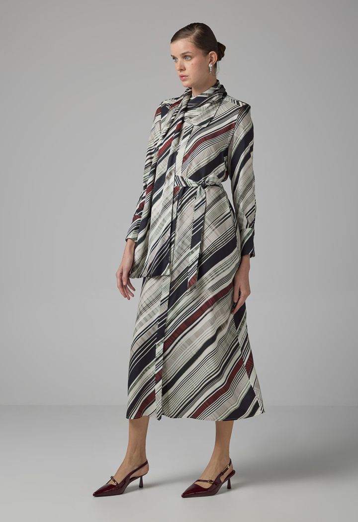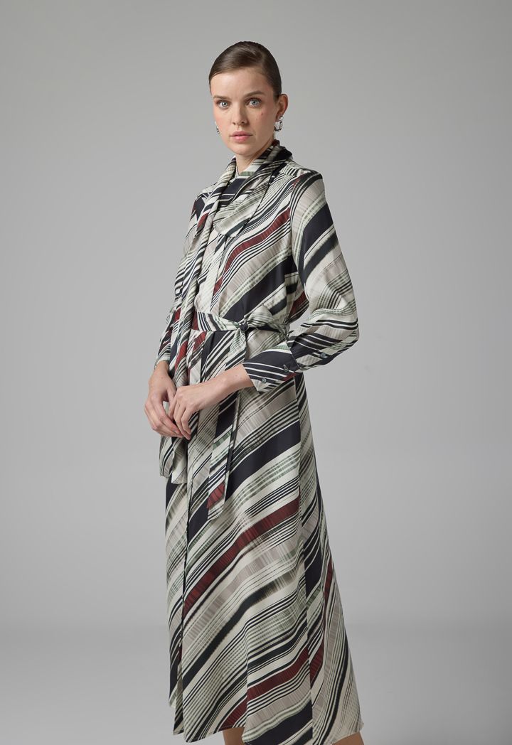 Design: Multicolor, Printed, Belted, Side Pockets, Detachable Scarf