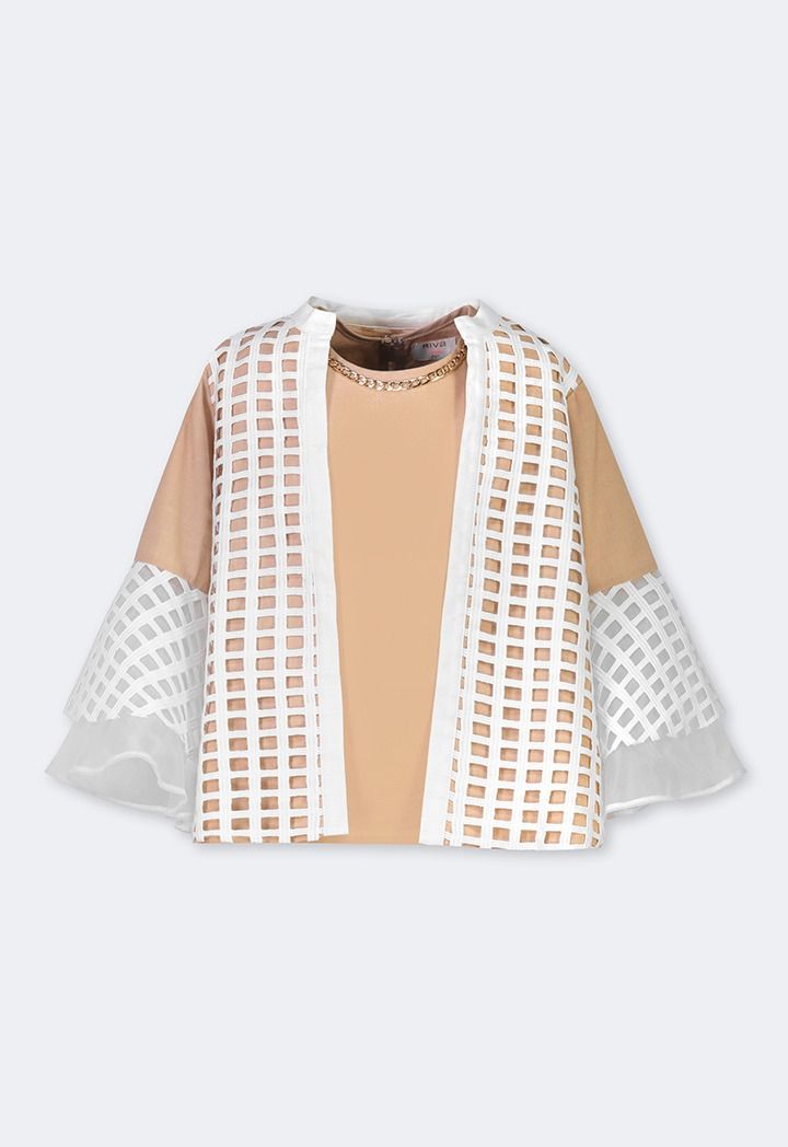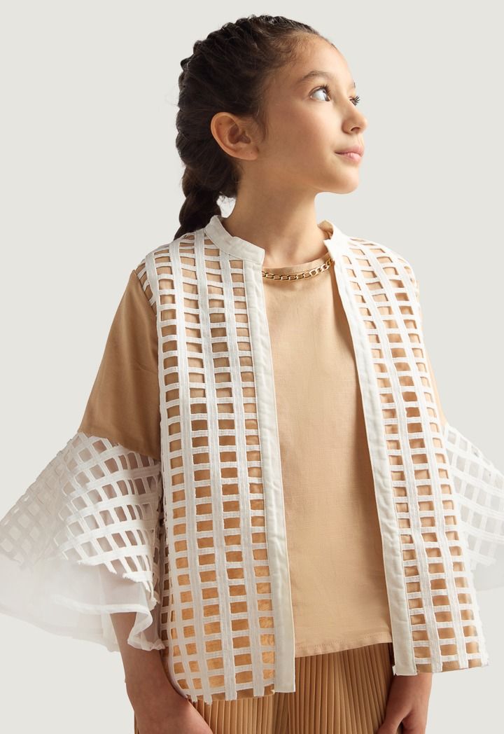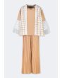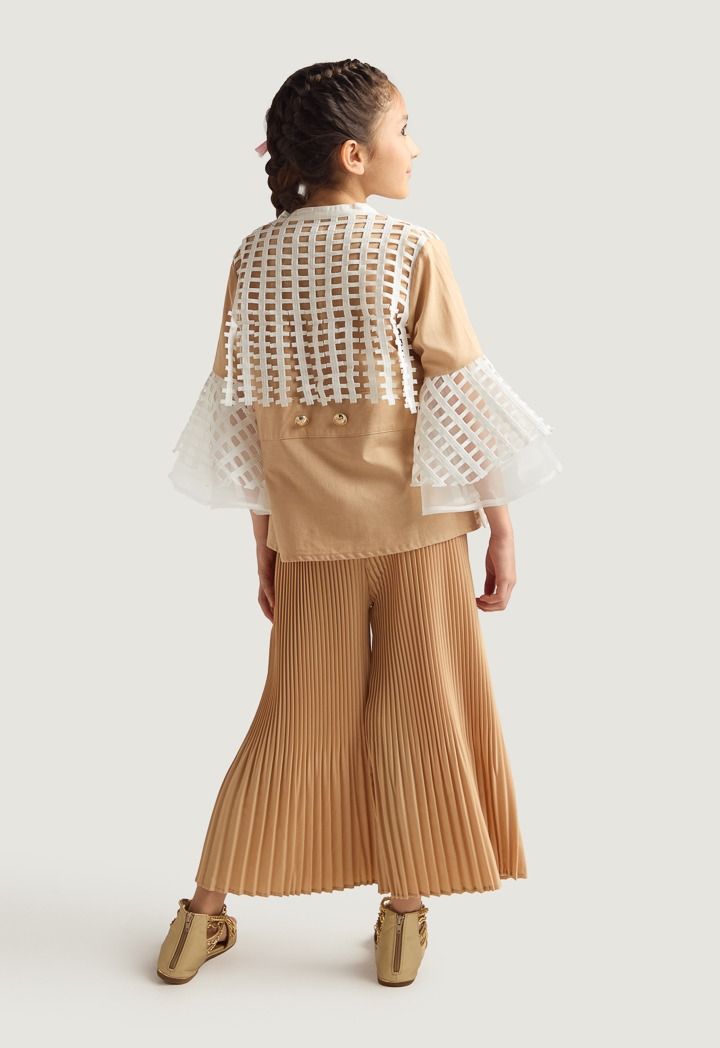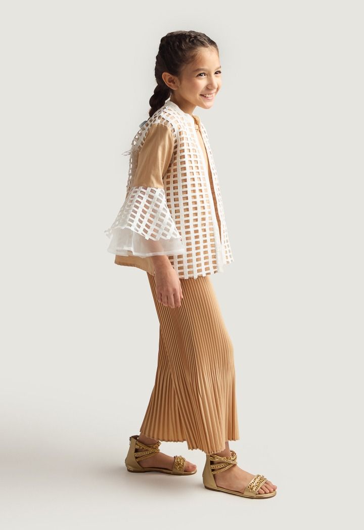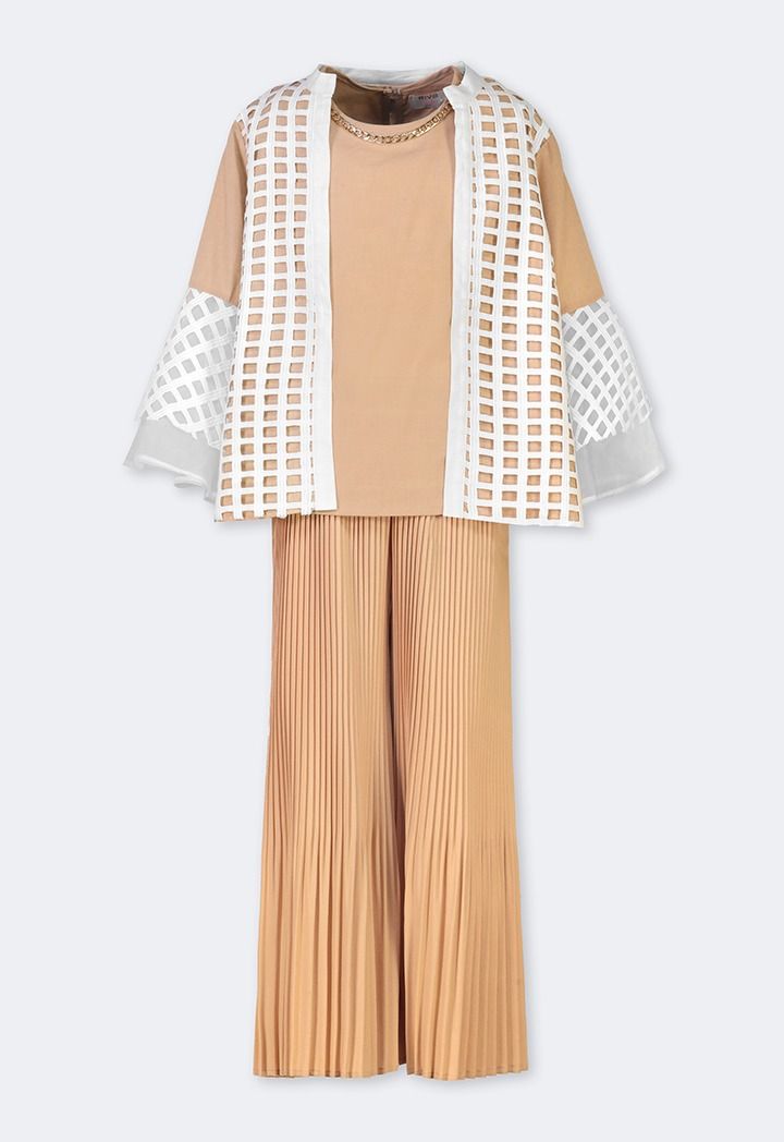 A unique set that features a net jacket, solid sleeveless top and a pleated pair of pants.