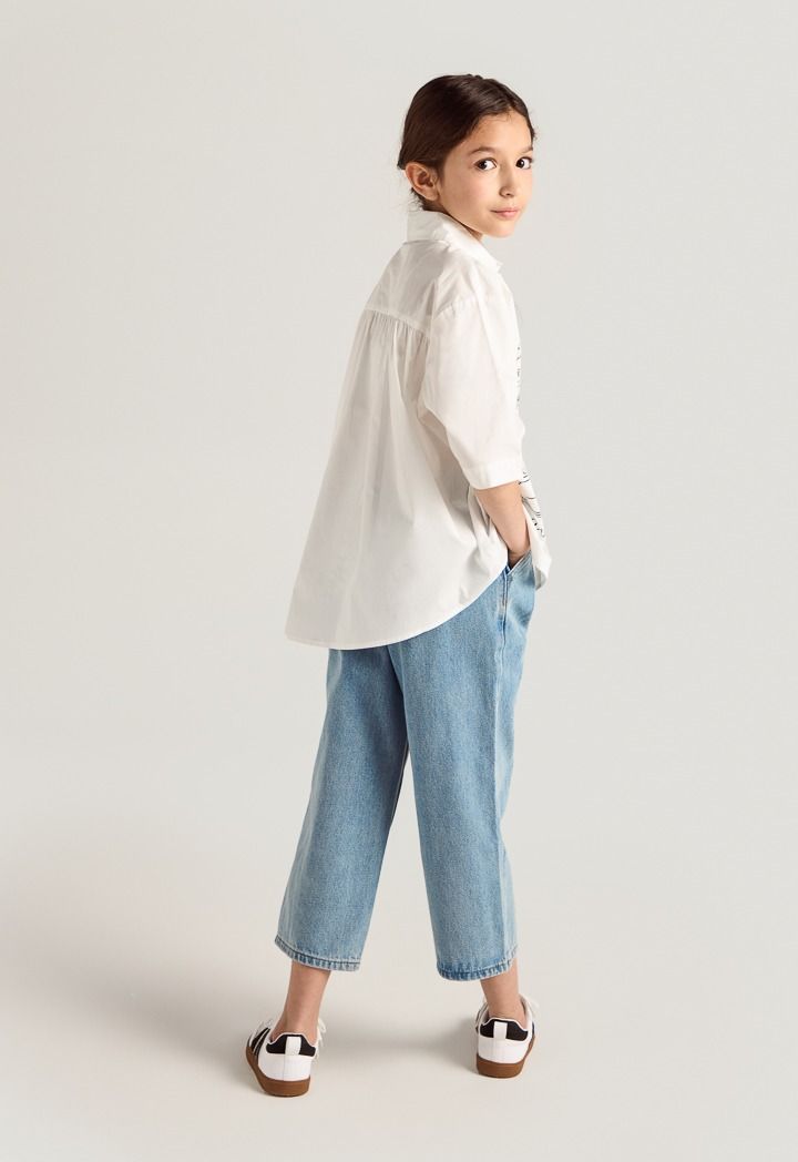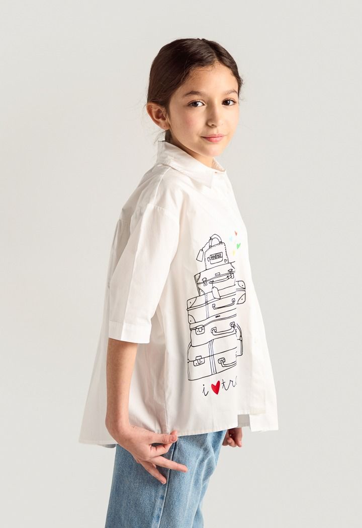 A modern shirt that features a printed design with pleated details.