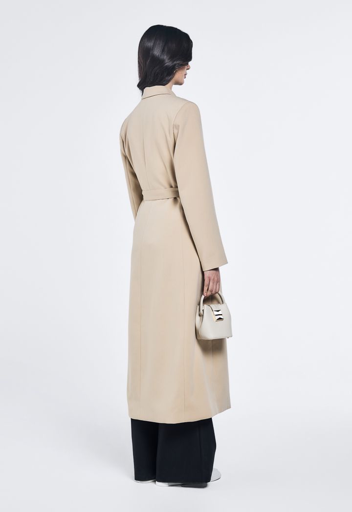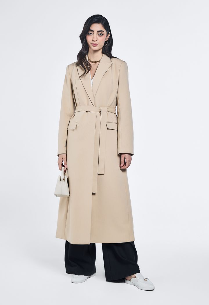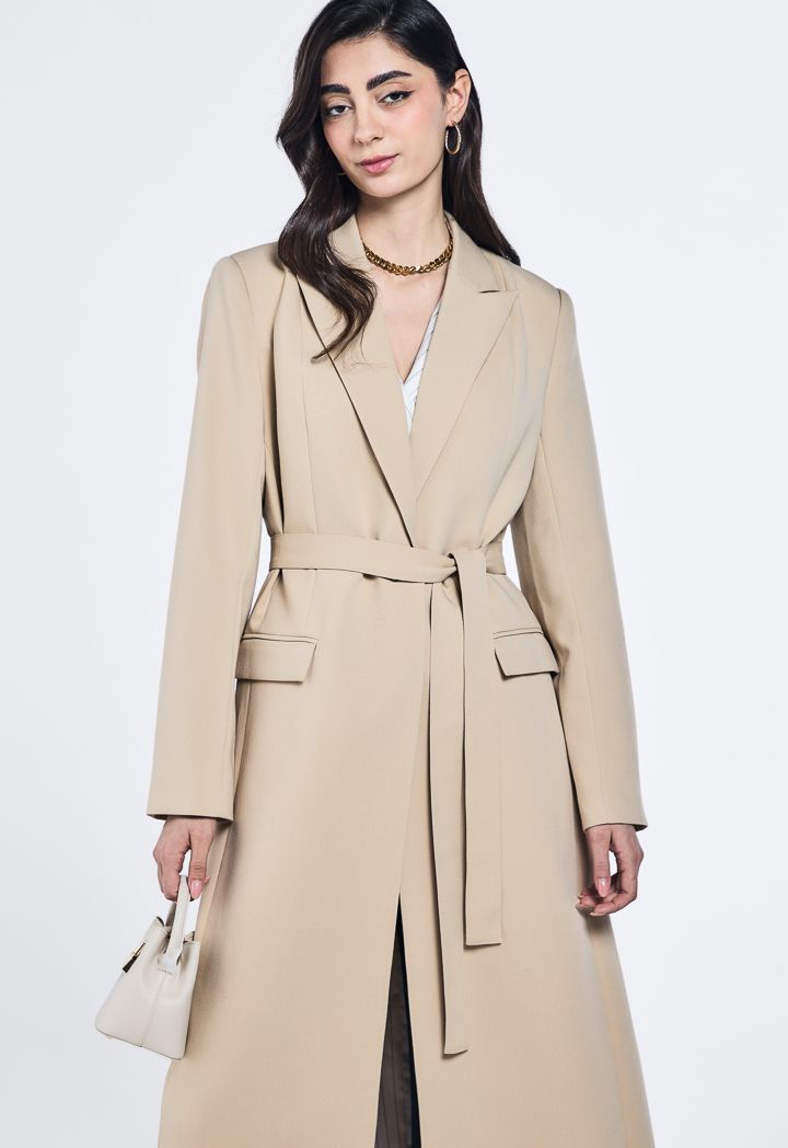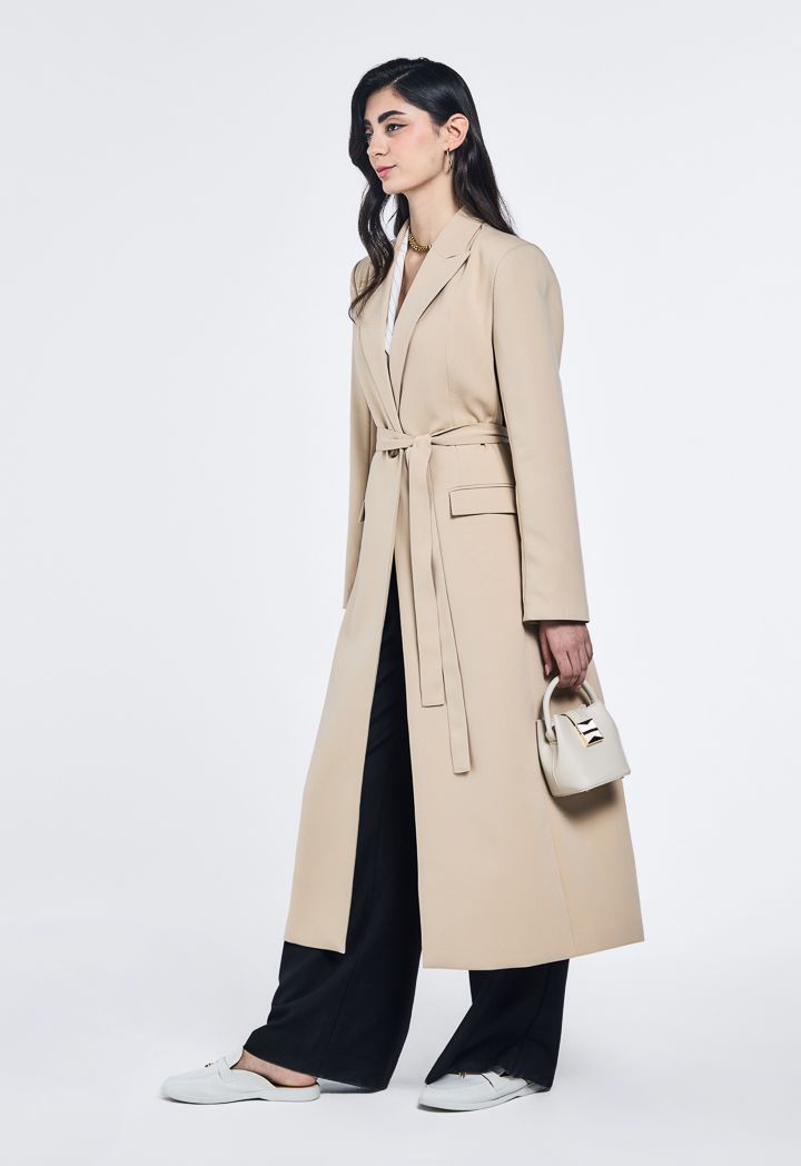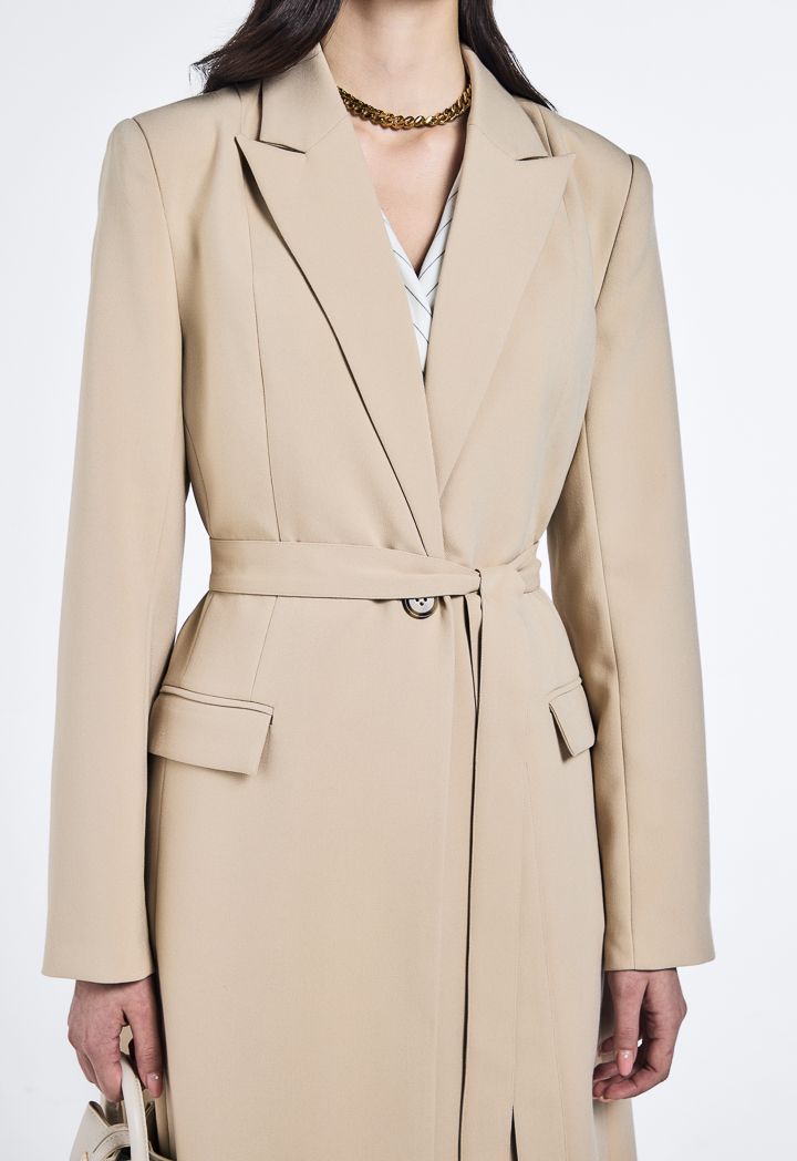 Design: Solid, Attached Lining, Belted, Flap Pockets, Single Breasted