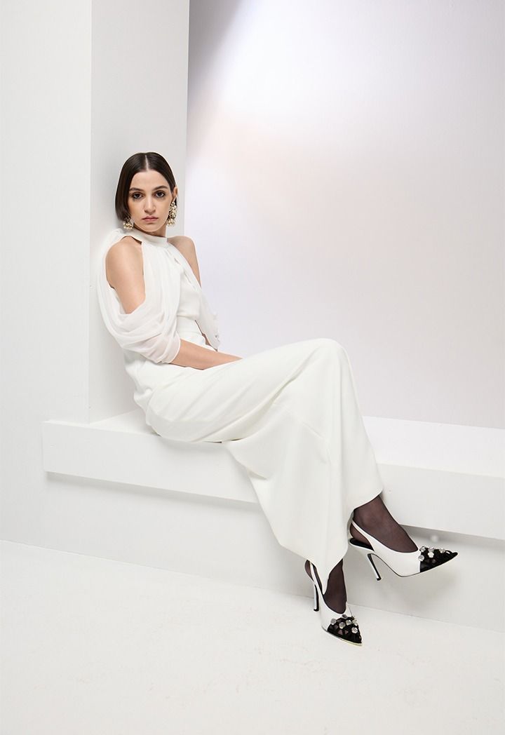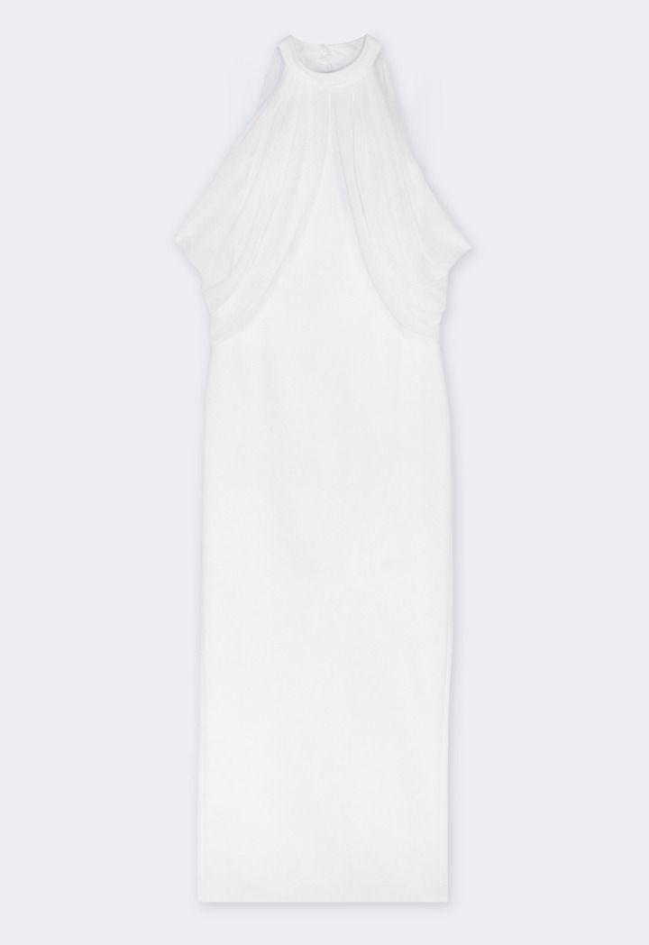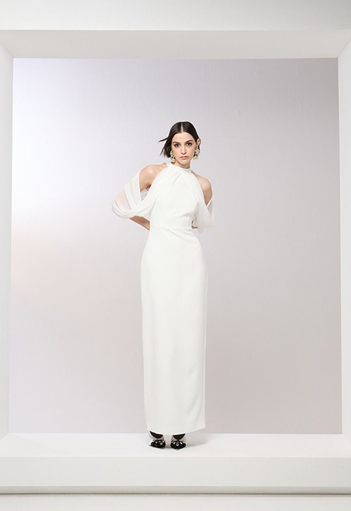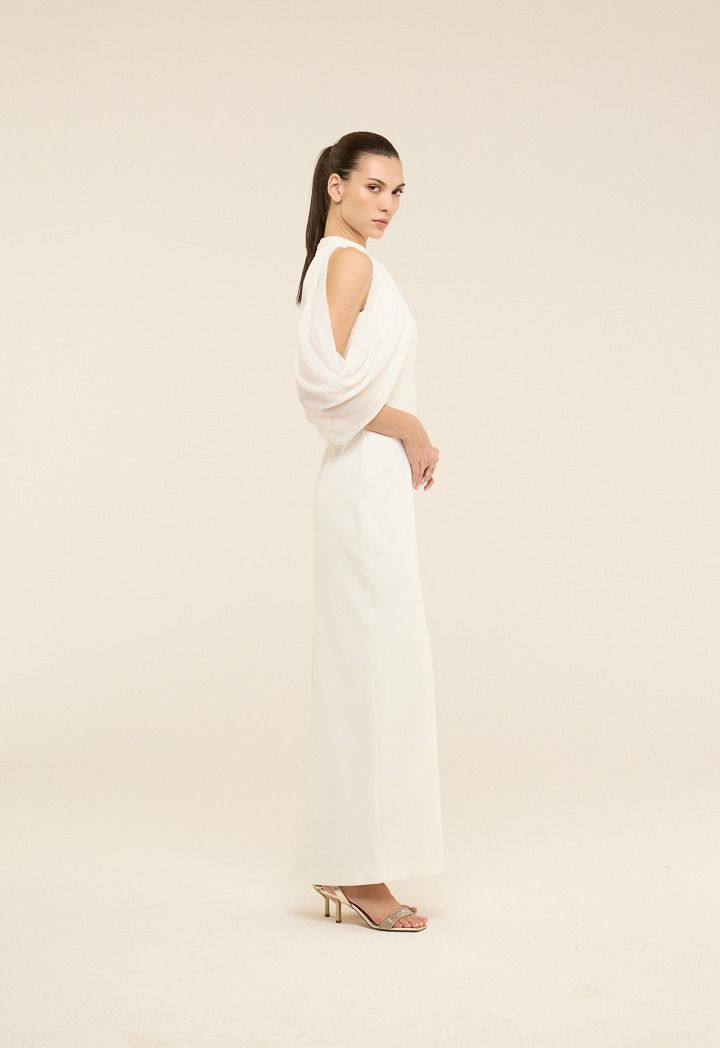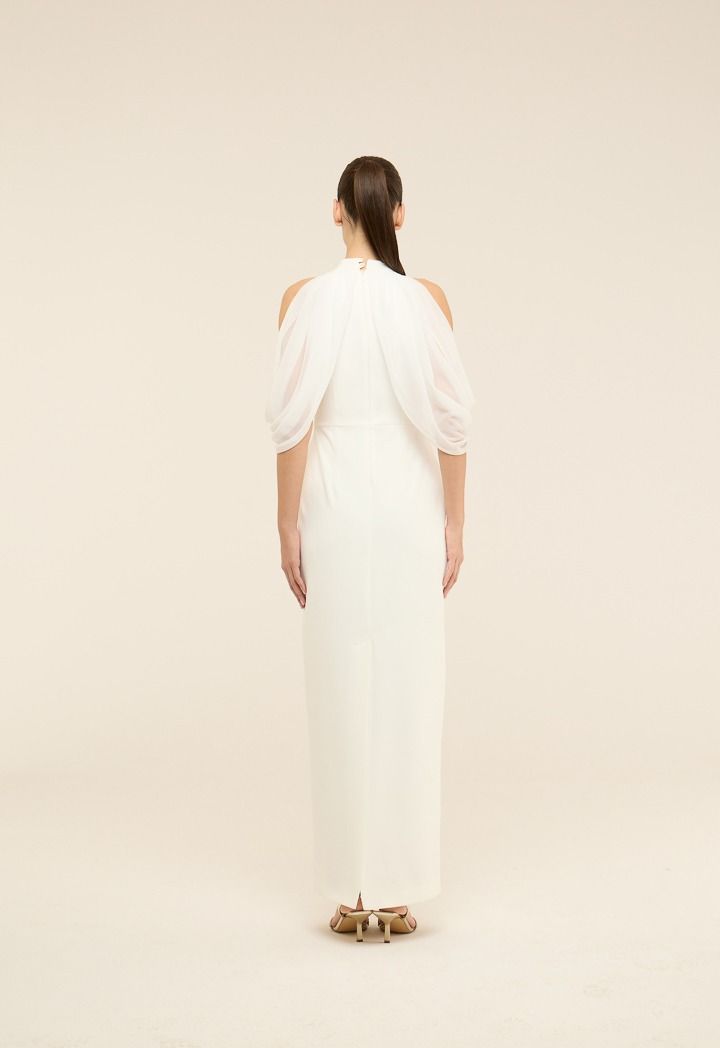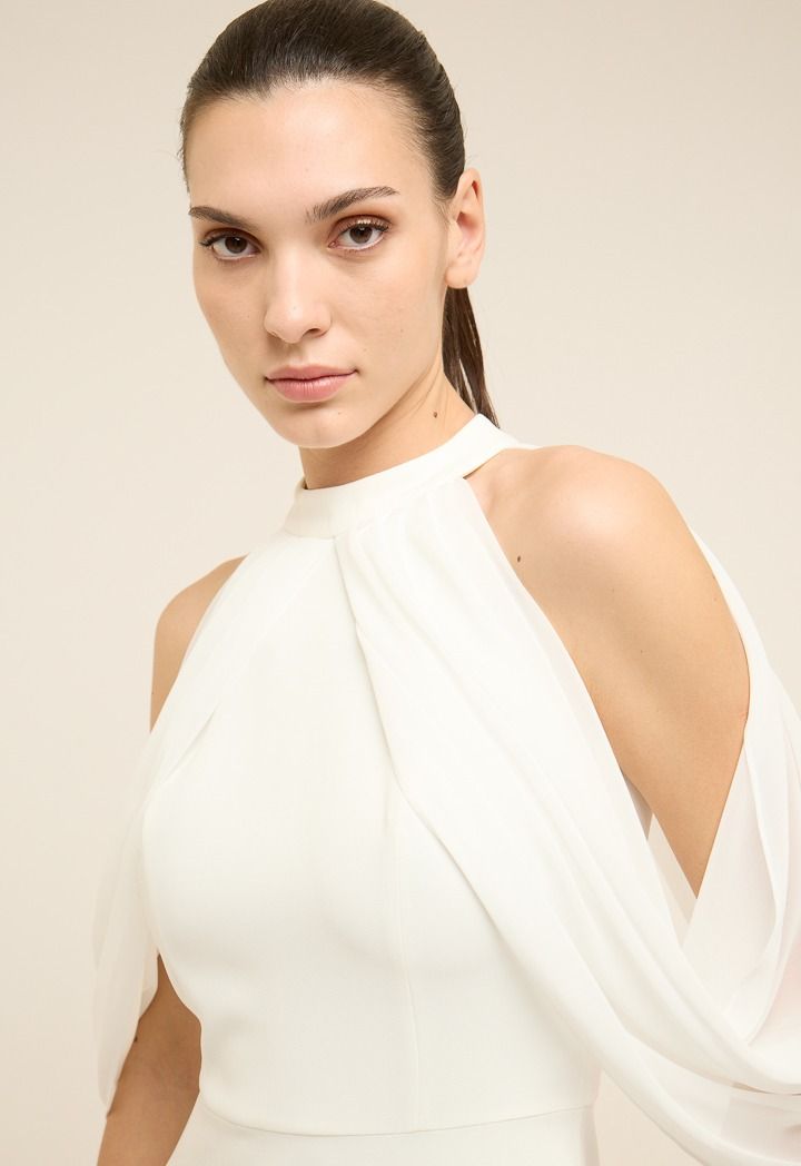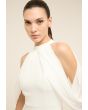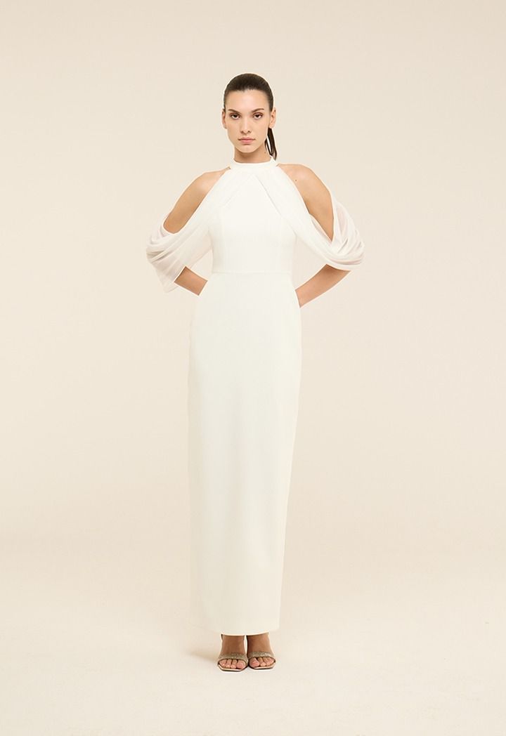 The halter neck and draped sleeves add a touch of sensuality. Whether you're attending a party or a special occasion, this dress will make a lasting impression.