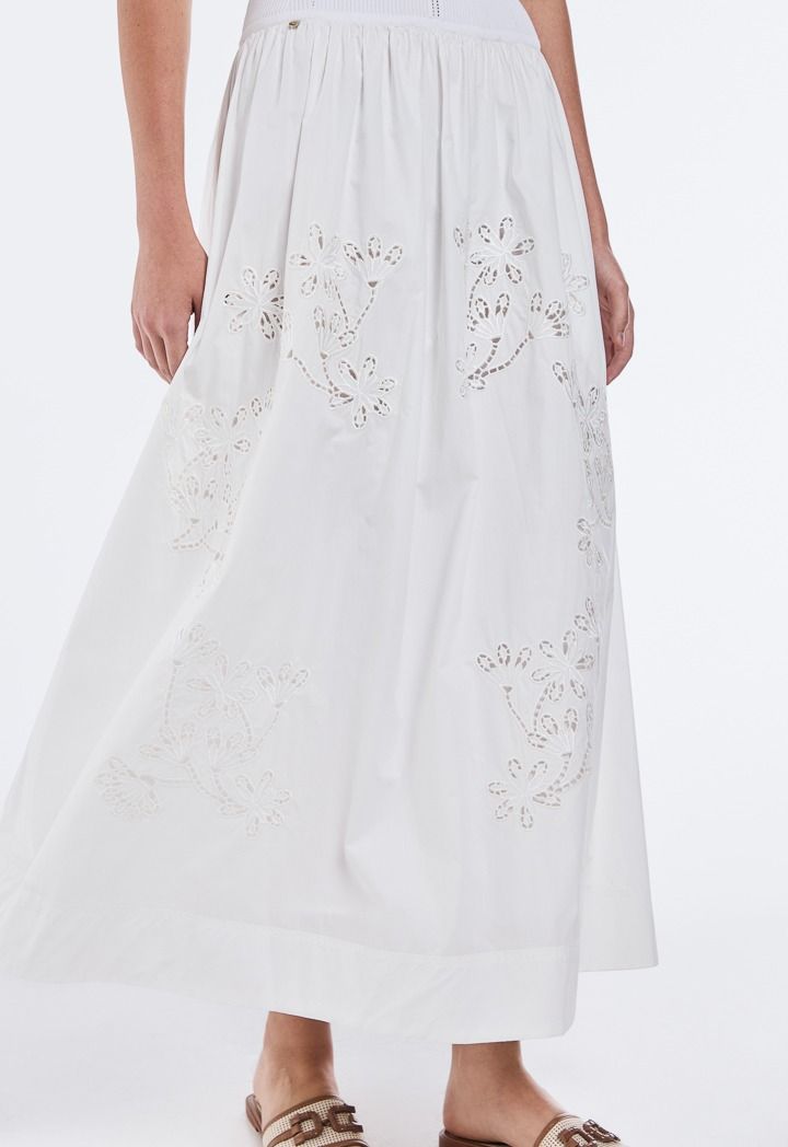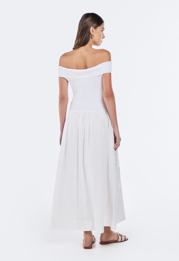 Design: Solid, Flared, Attached Lining, Knitted Bodice, Woven Skirt, Side Pockets, Lace Embroidered