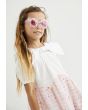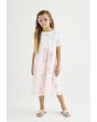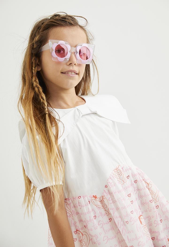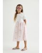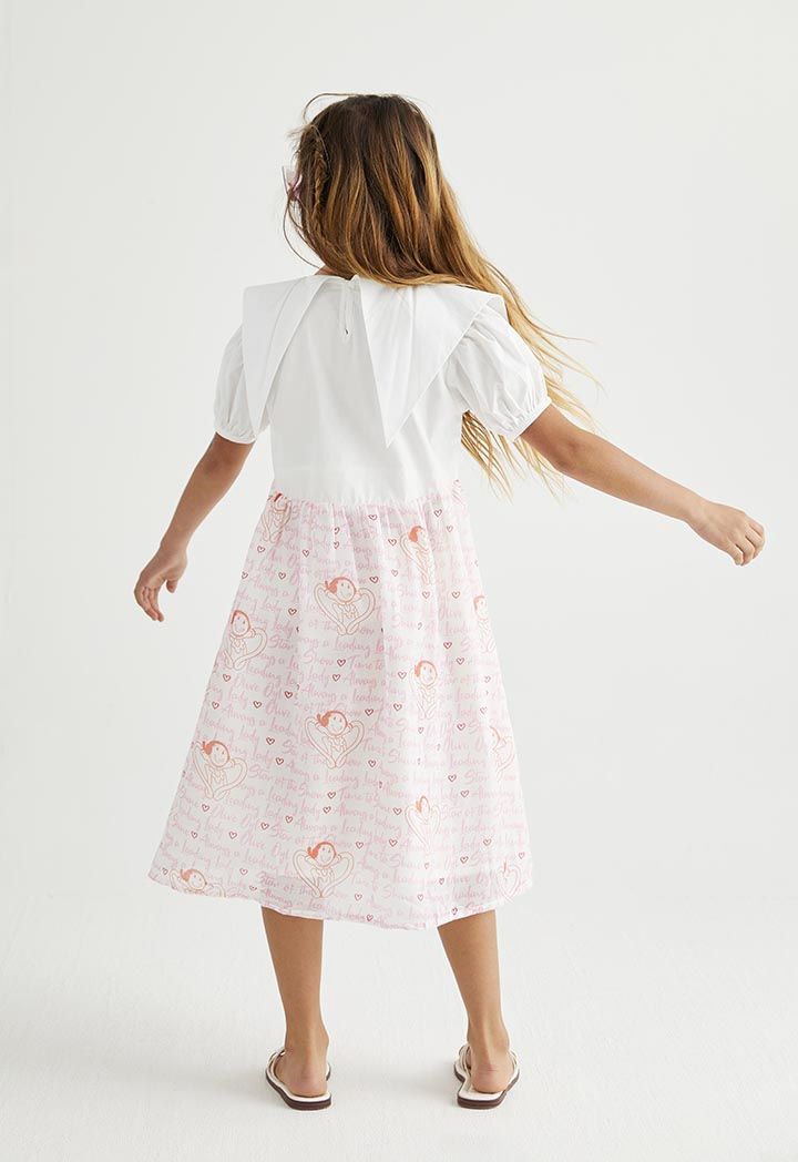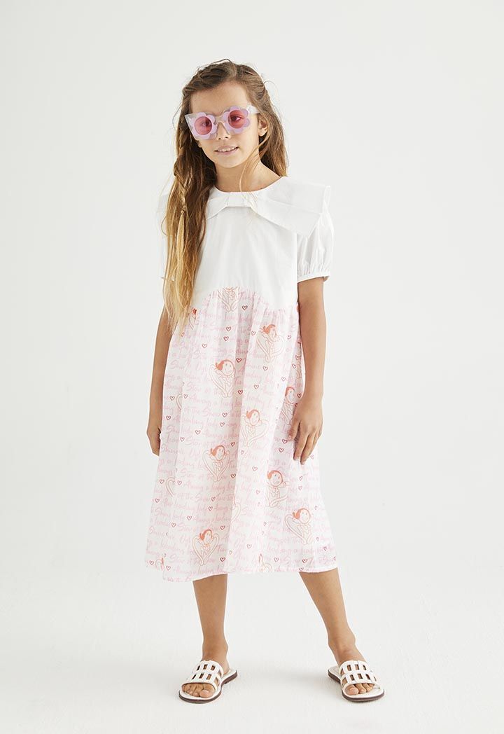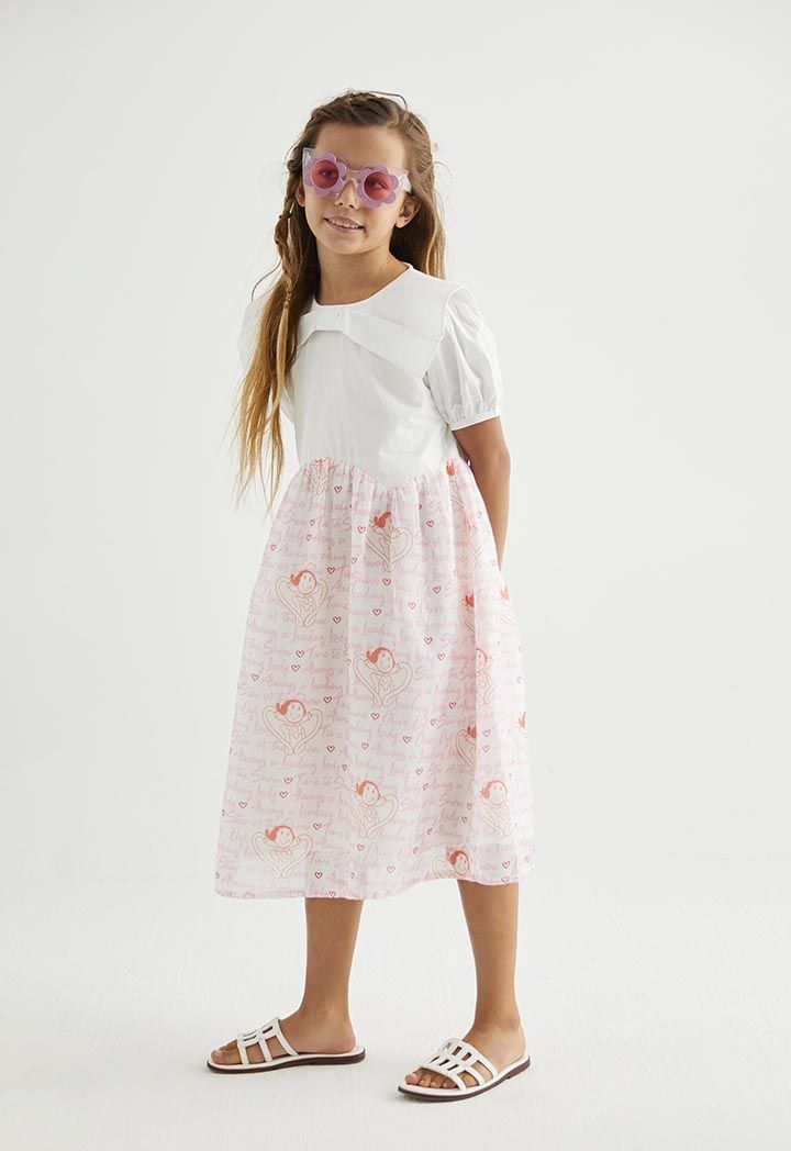 A dress that features a bow embellished crew neck, short sleeves and printed skirt.