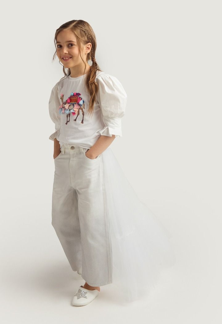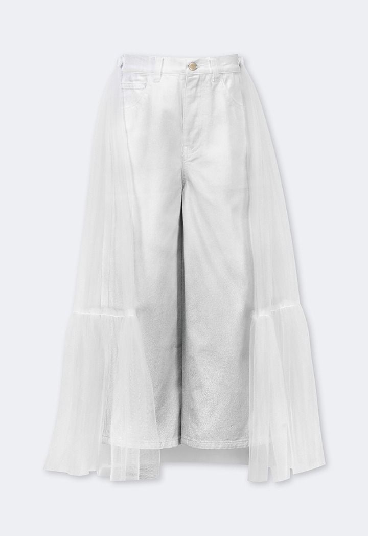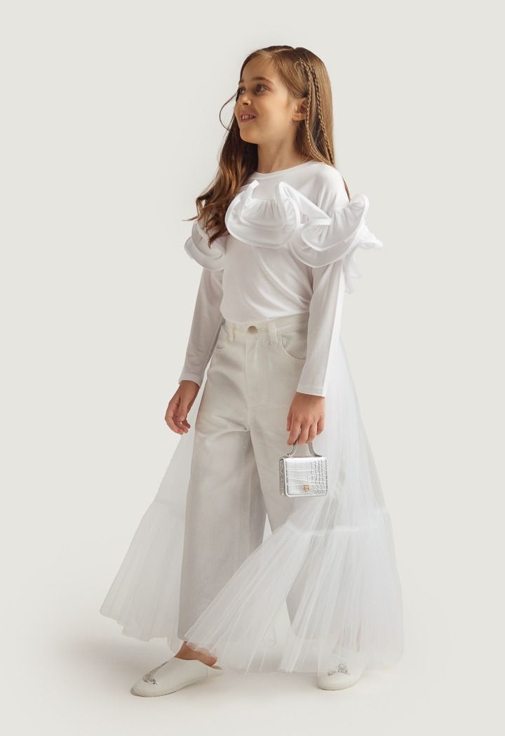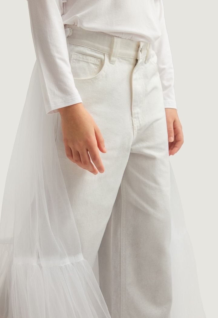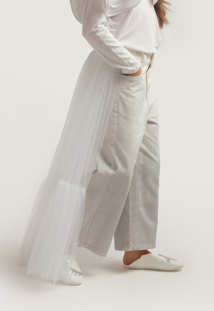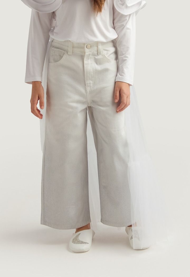 A set that features an ombre sparkling denim jeans and a mesh tail.