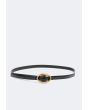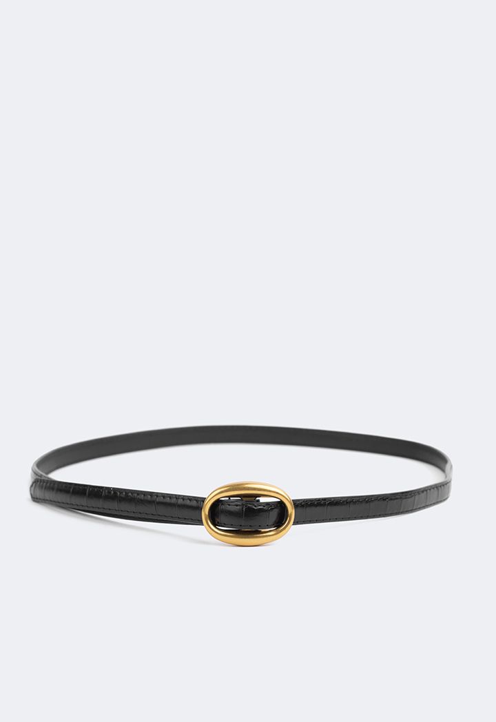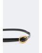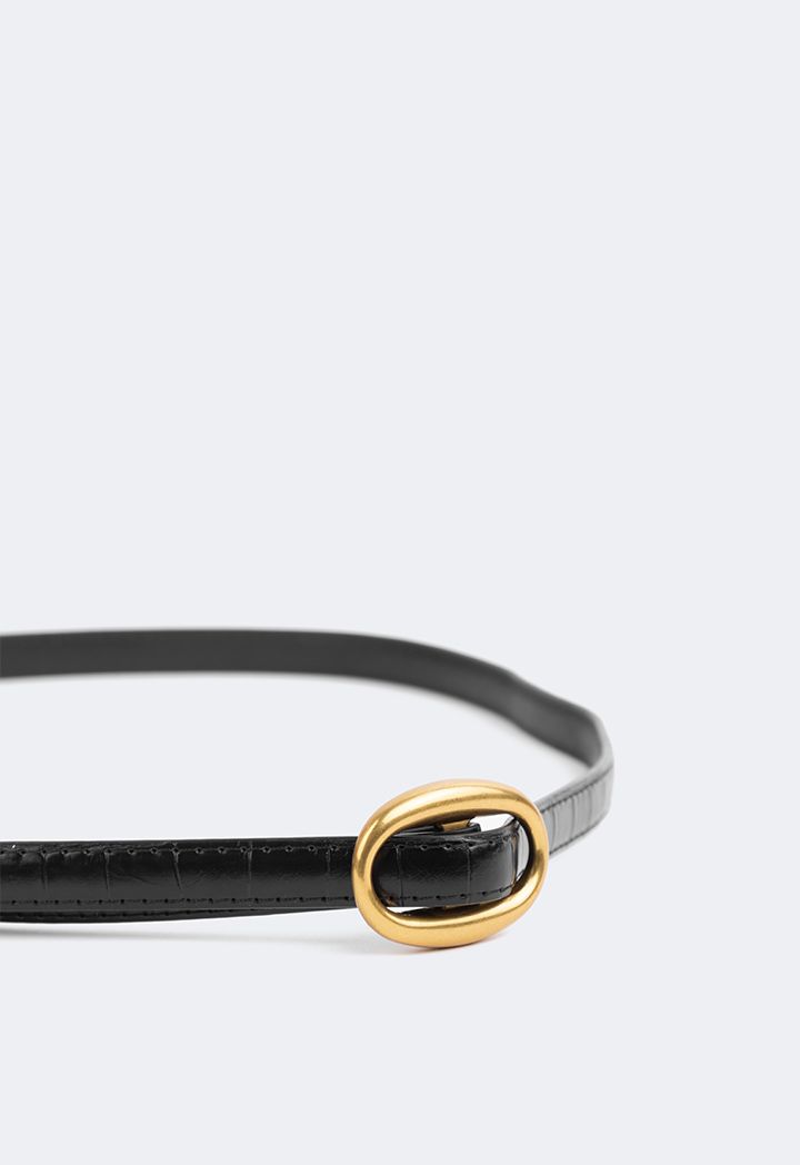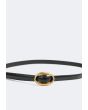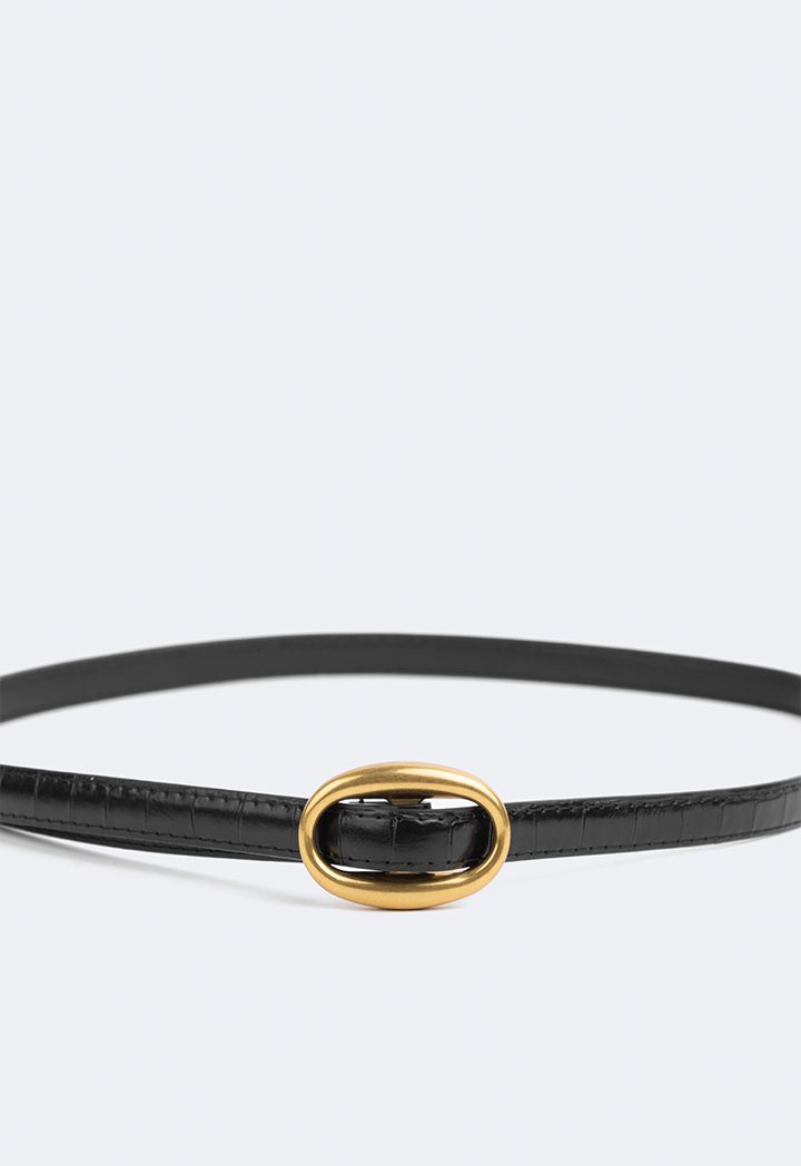 A sleek belt that features a textured PU Leather design and a metallic oval buckle.