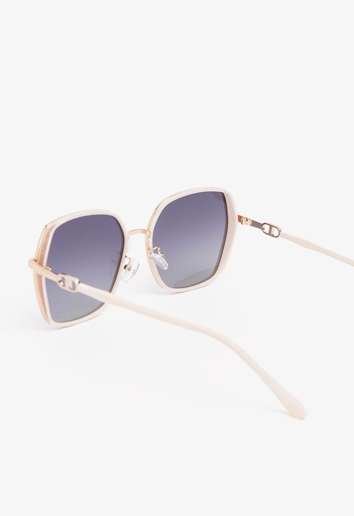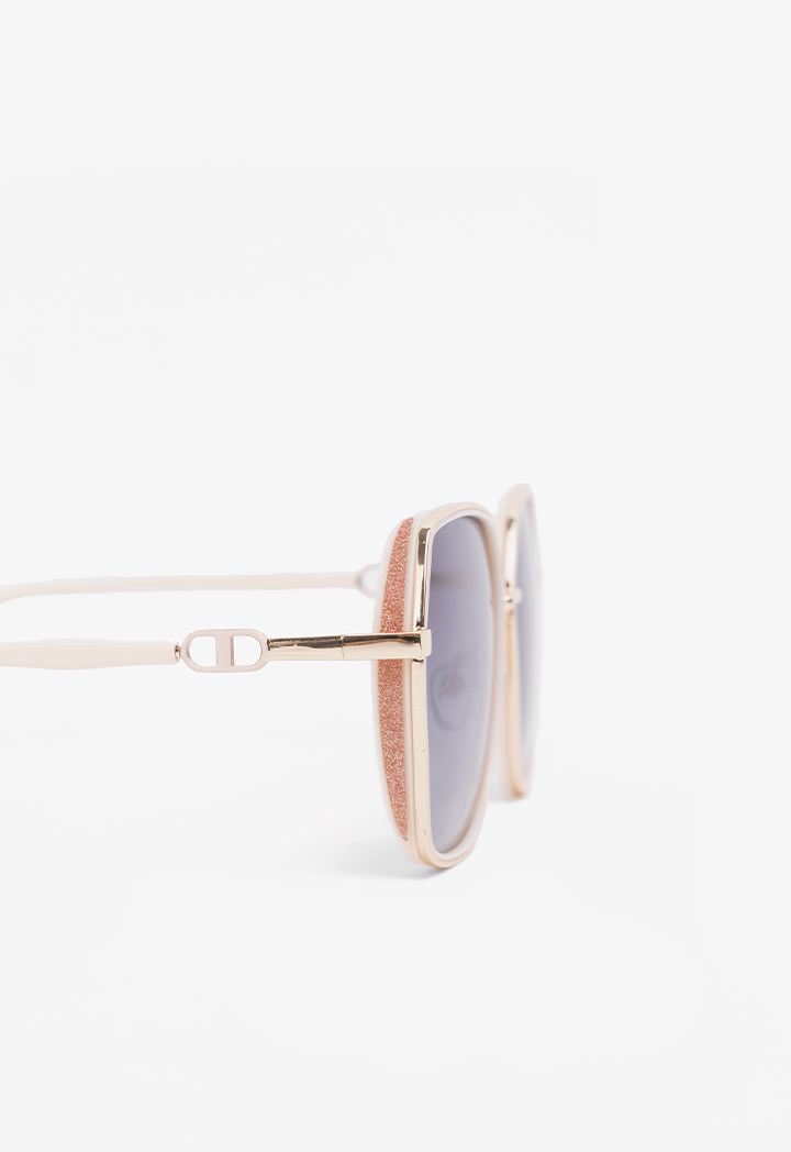 Square frames maximize the modern appeal of oversized sunglasses fitted with lenses that are dark and with sparkly touches.