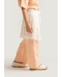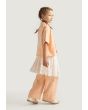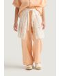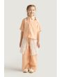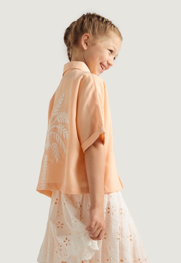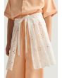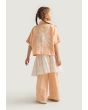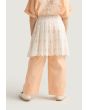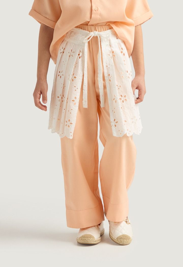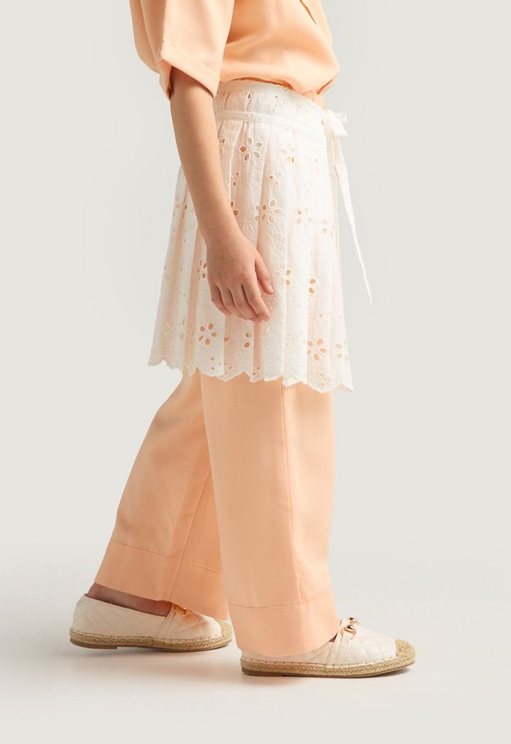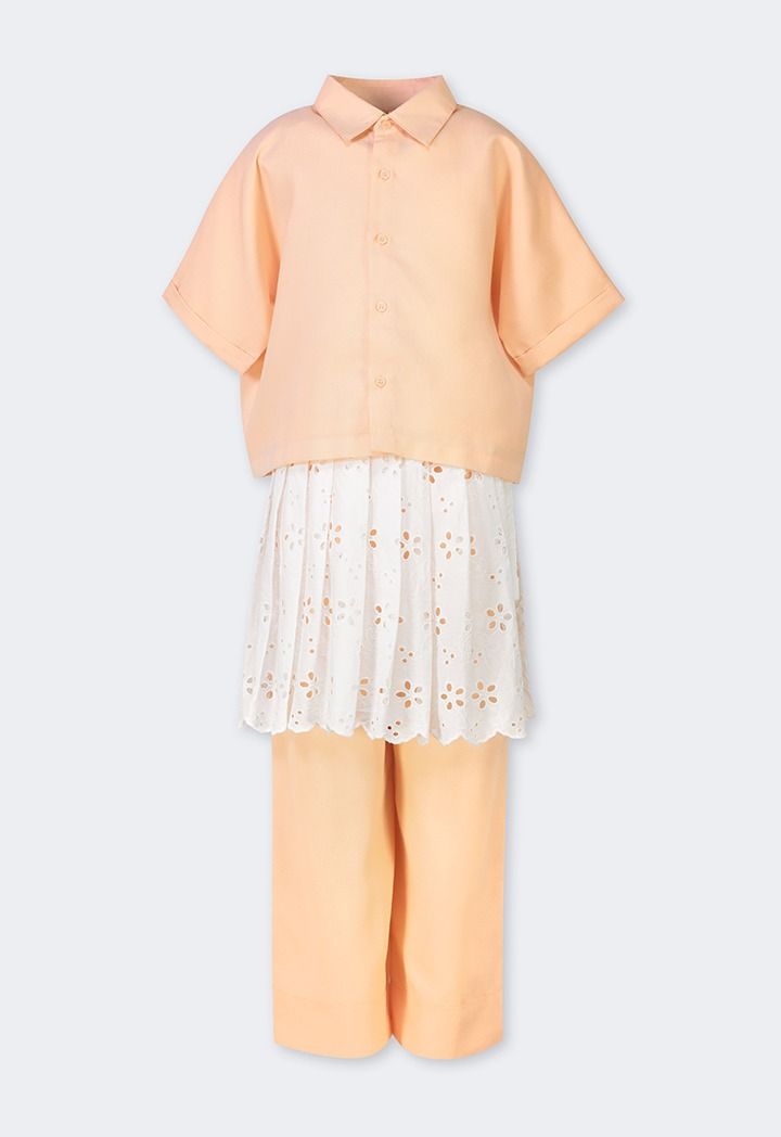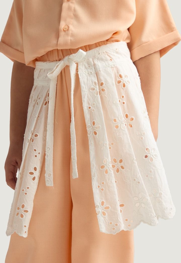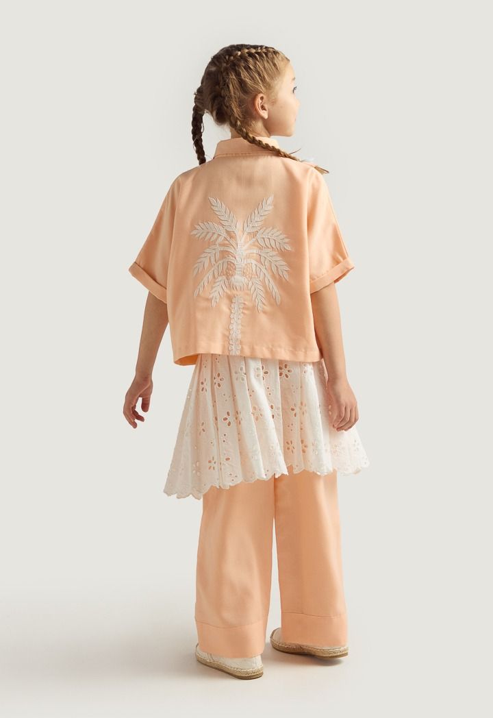 A unique set that features a palm embroidered shirt, a schiffli tie waist skirt and solid pants.