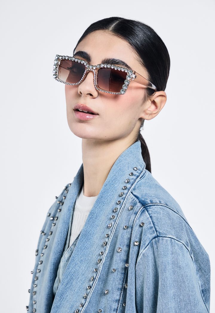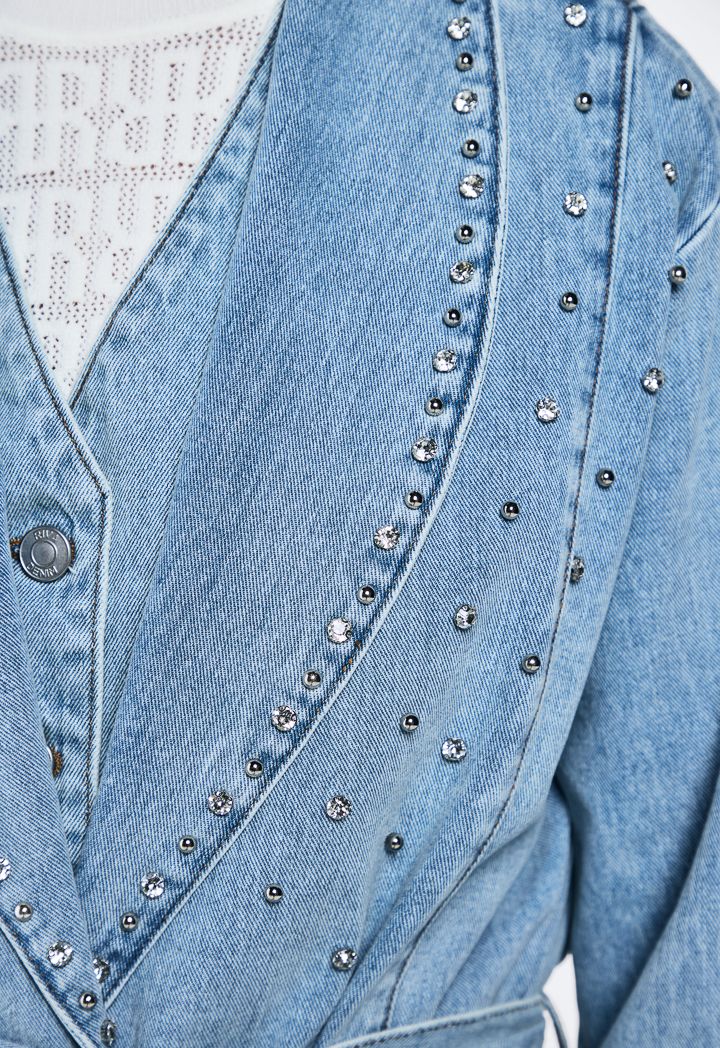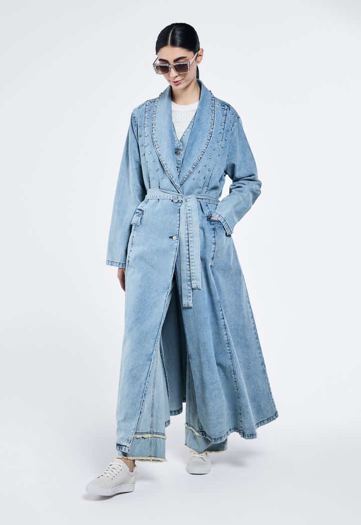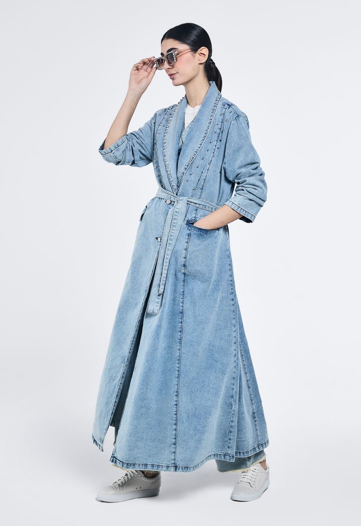 Pearl And Crystal Embellished Denim Abaya |