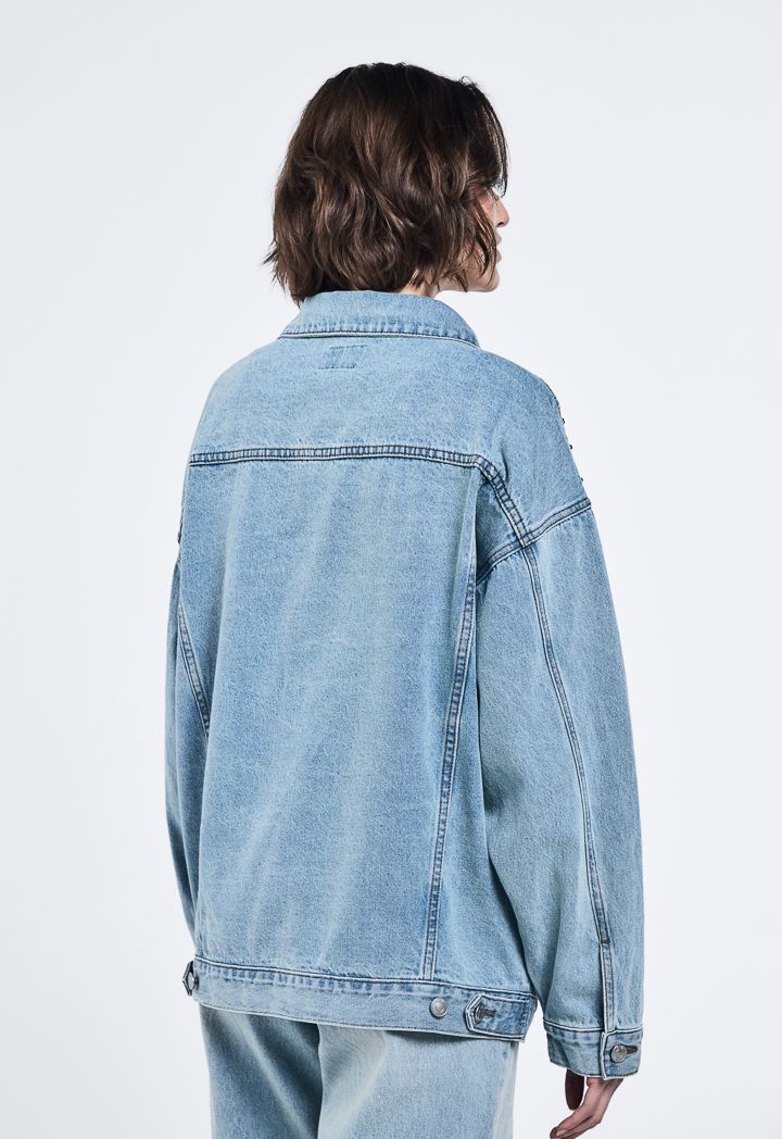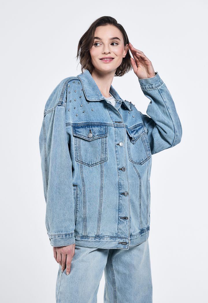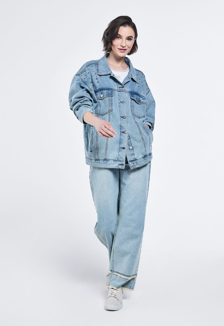 Design: Pearl And Crystal Embellished, Denim, Multi Pockets, Relaxed Fit, Drop Shoulders