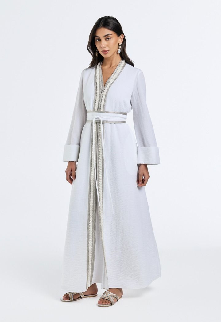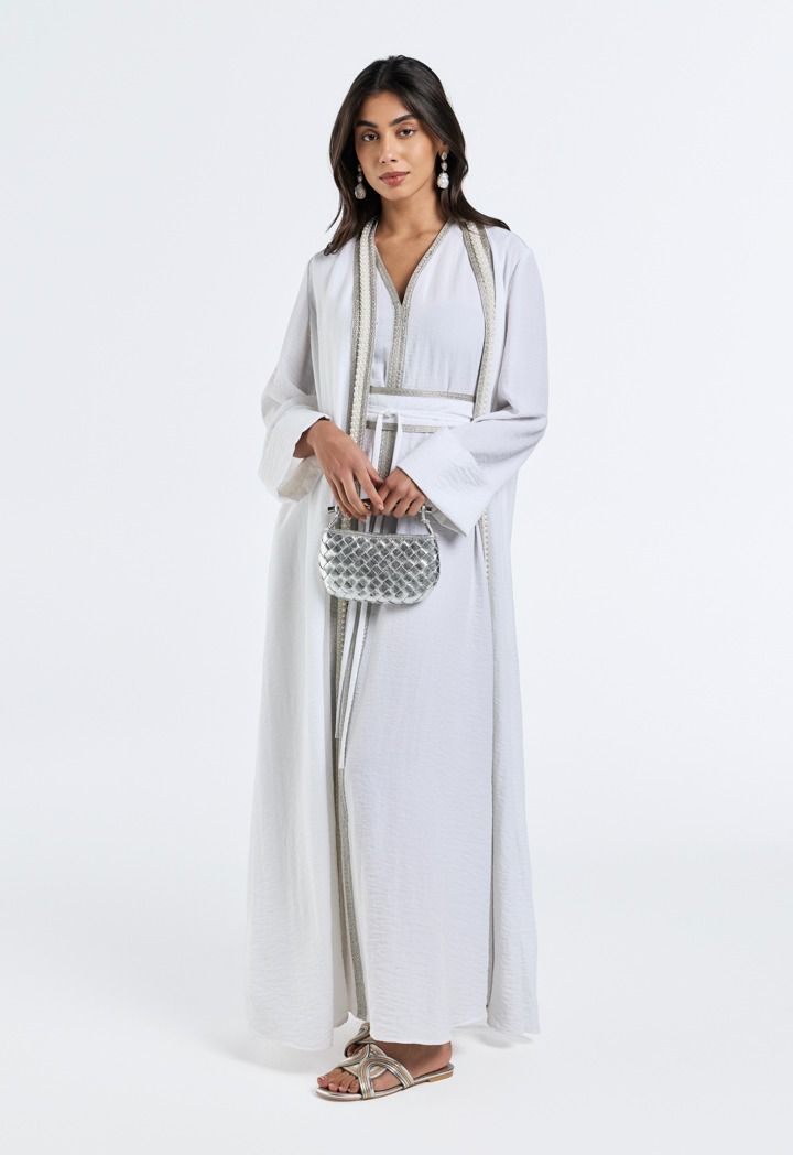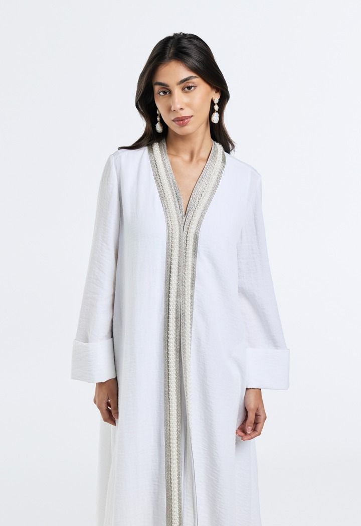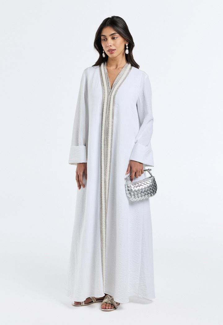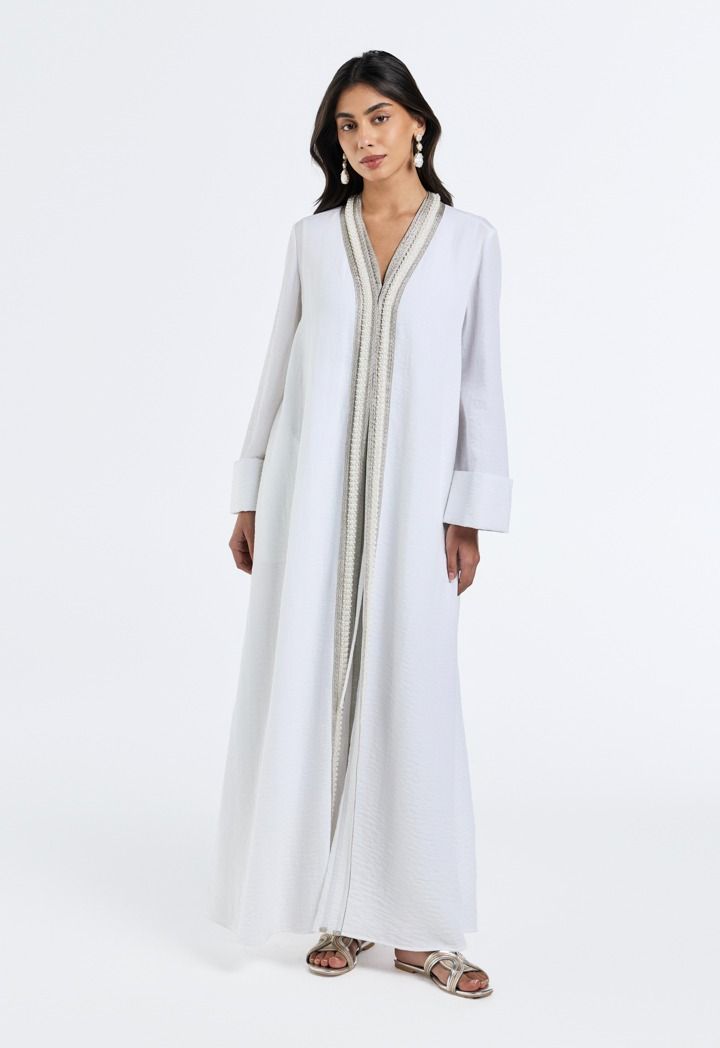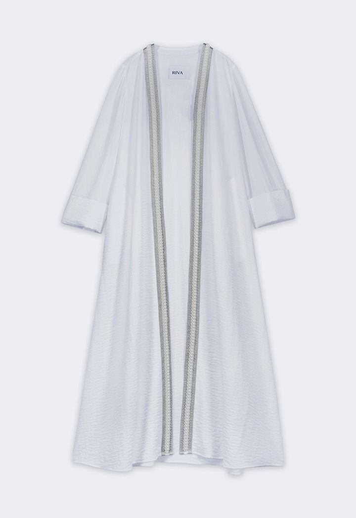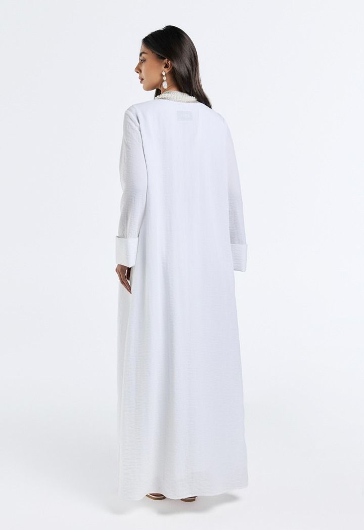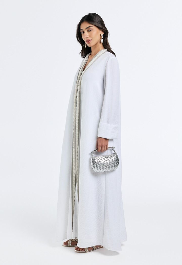 Grace meets glamour, the pearl-embellished crinkled abaya adds a touch of timeless elegance to your look.