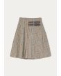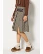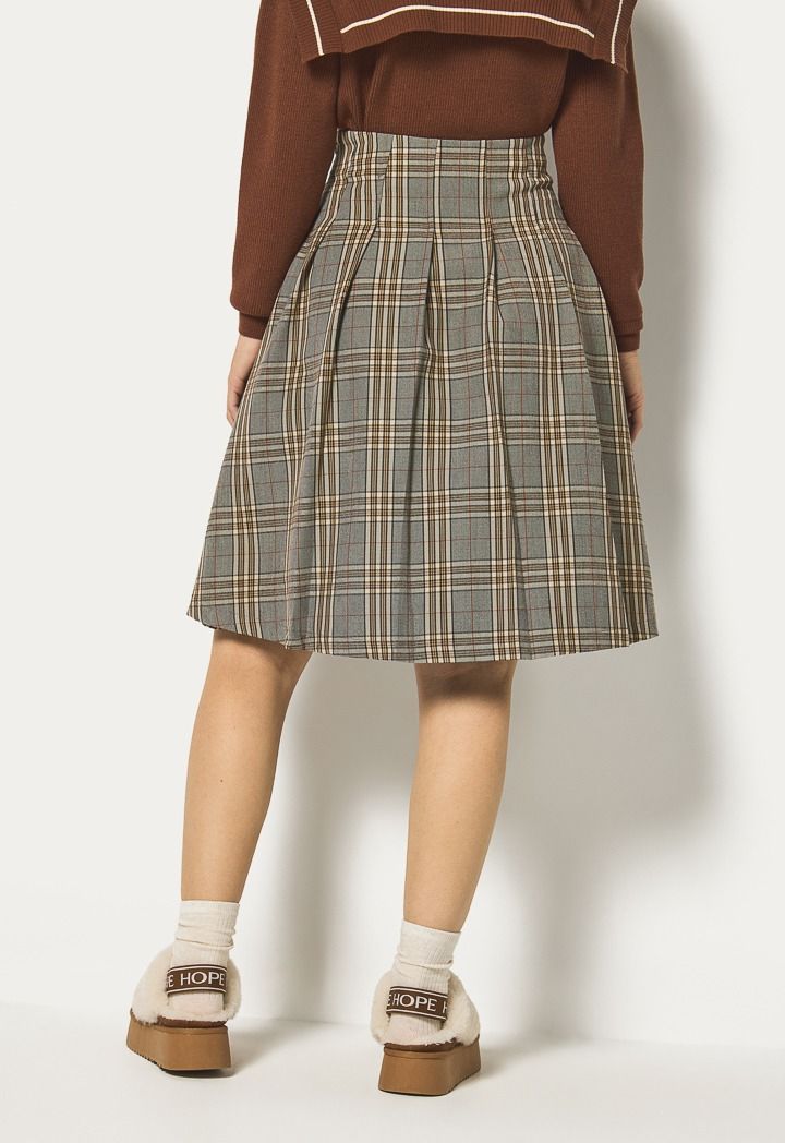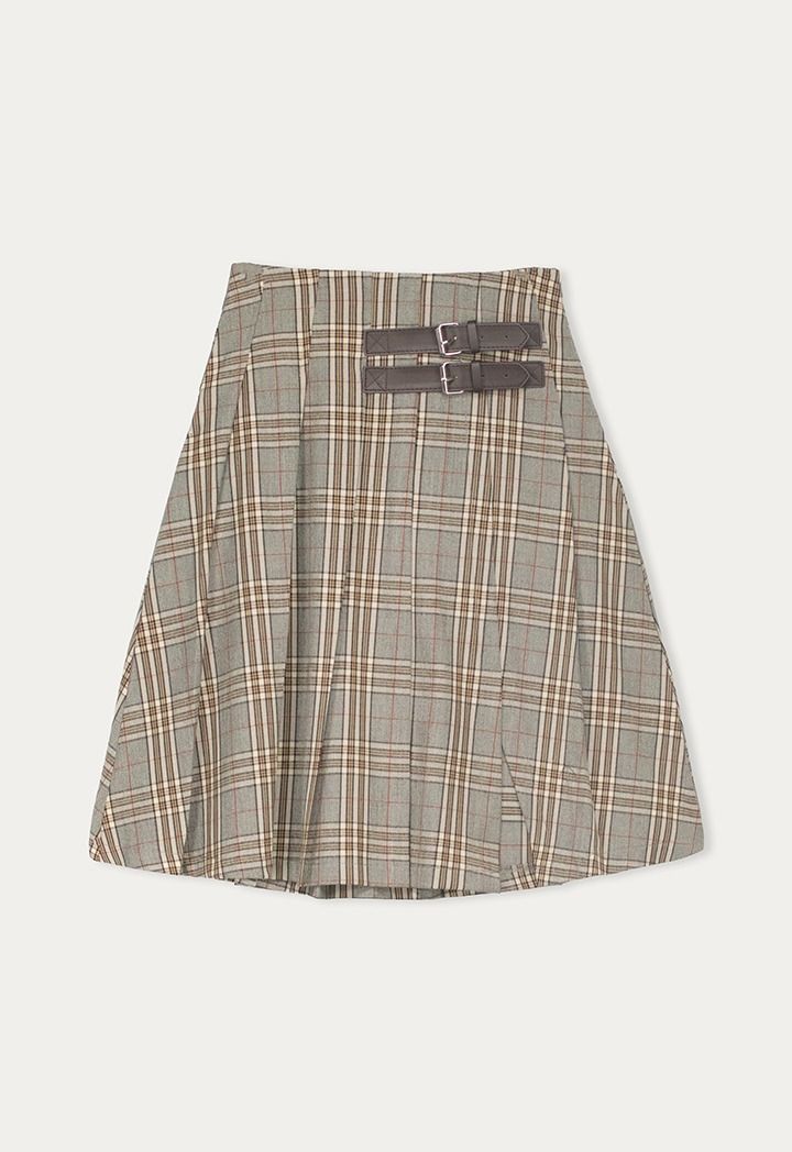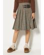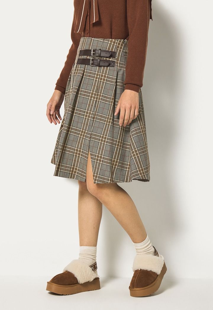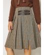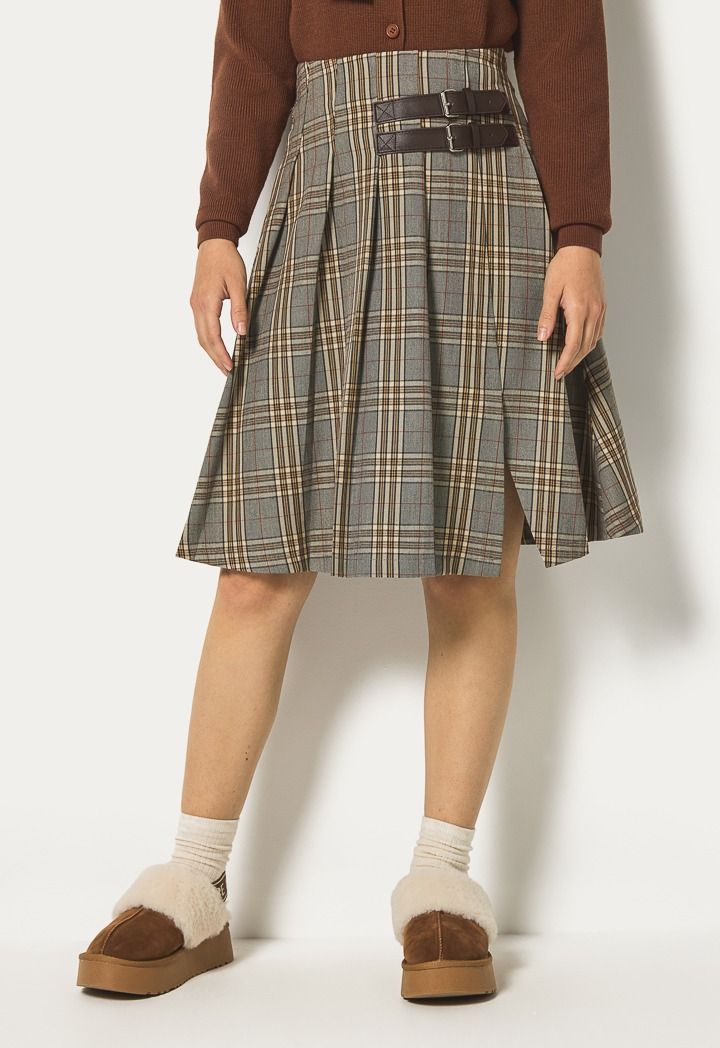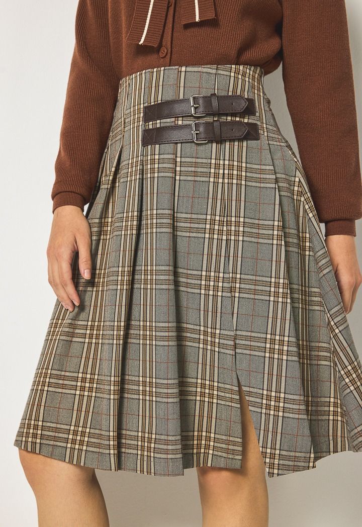 Design: Plaid, Pleated, Front Slit, Faux Belt Details
