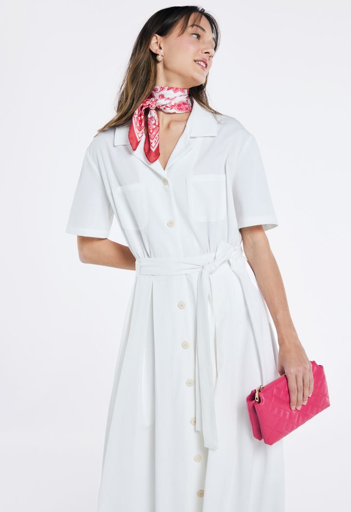 Design: Solid, Belted, Pleated, Attached Lining, Patch Pockets, Flared