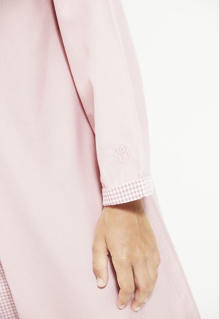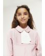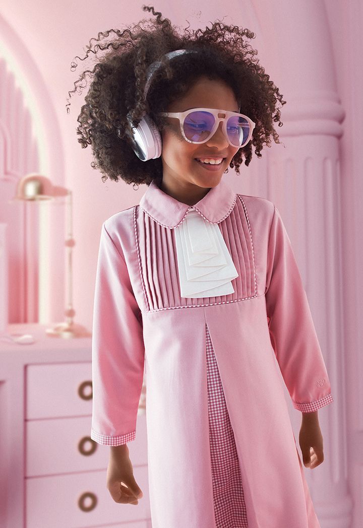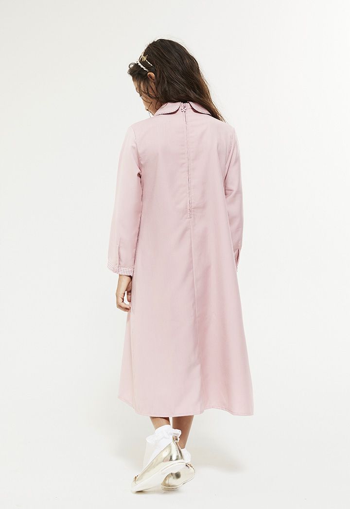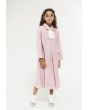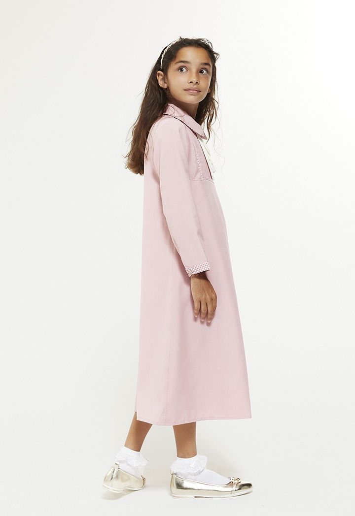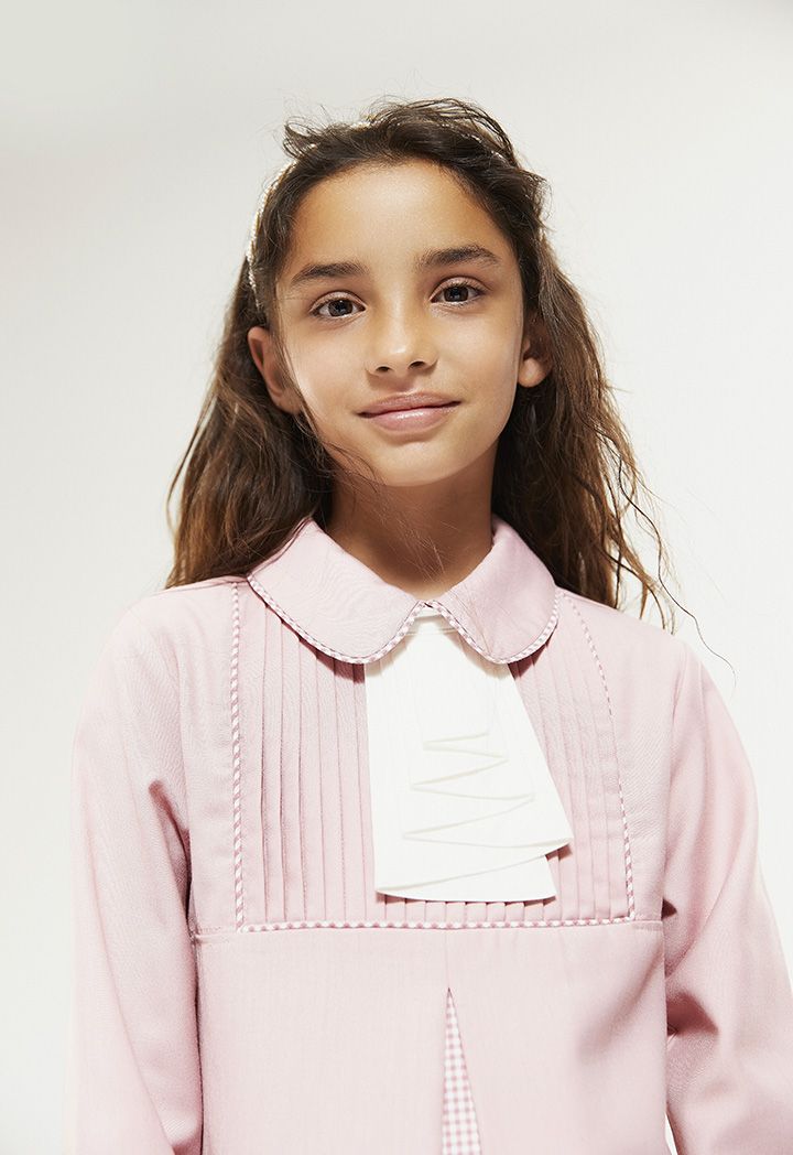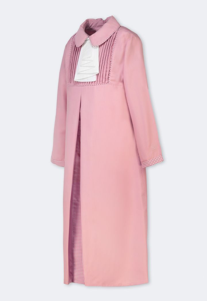 A school uniform dress that features a pleated bodice, long sleeves and a inverted pleat skirt.