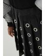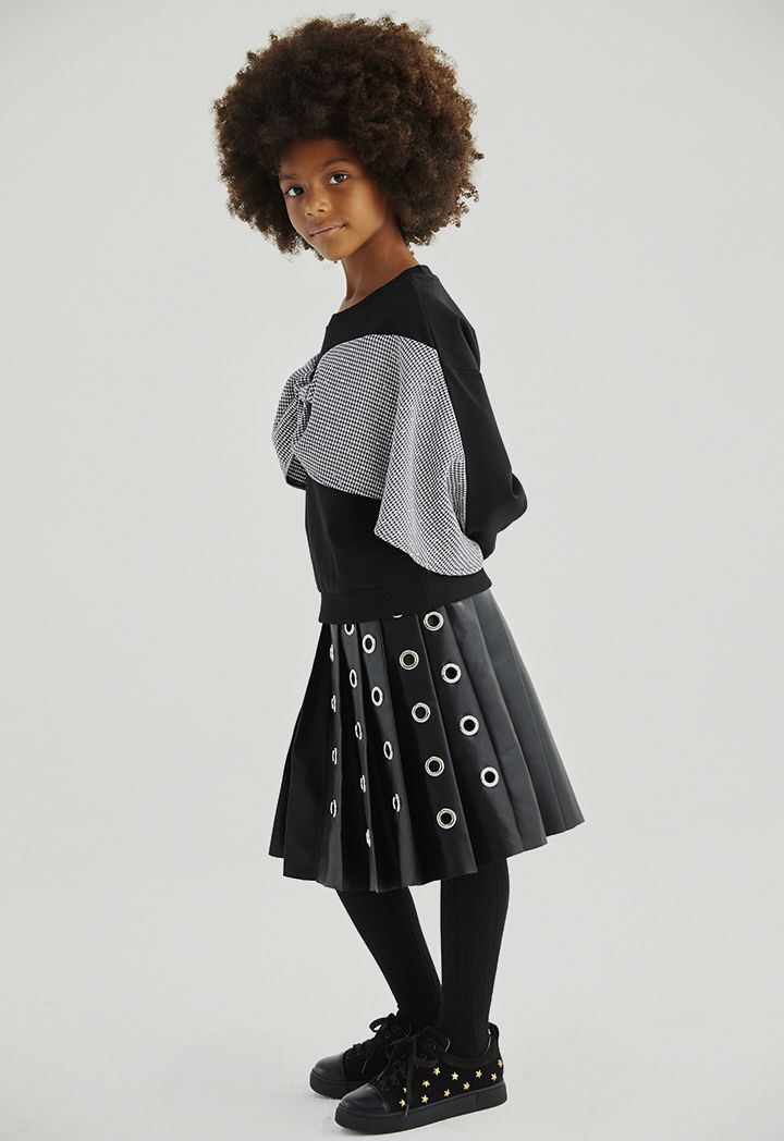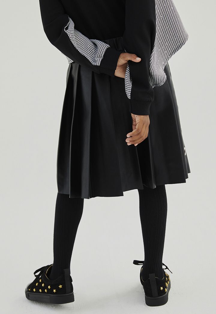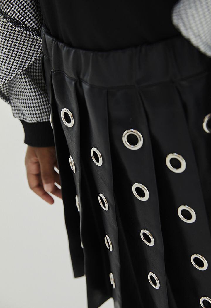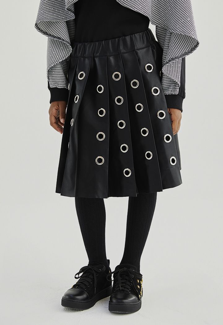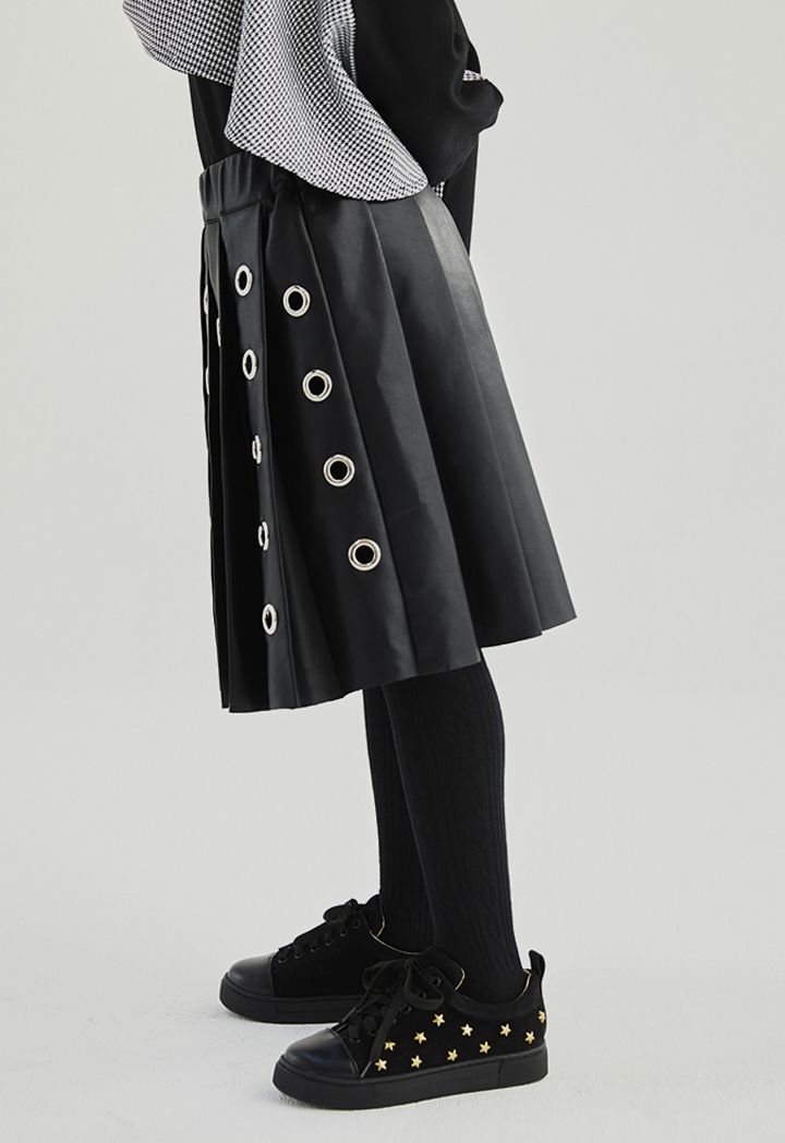 A PU Leather skirt that supports an eyelet and a pleated design.