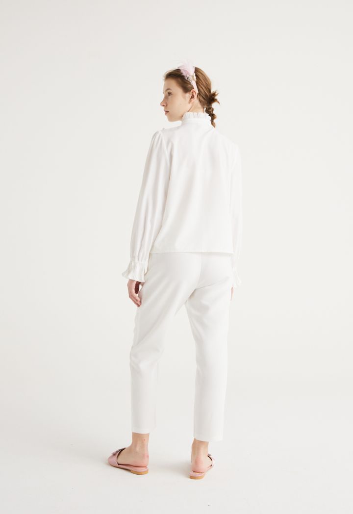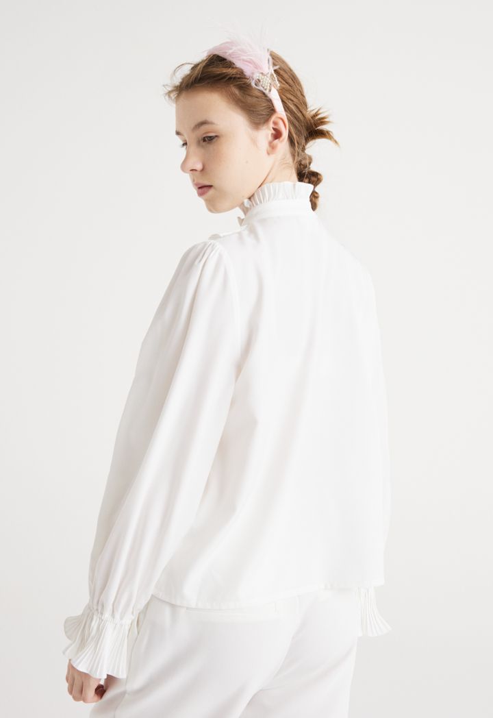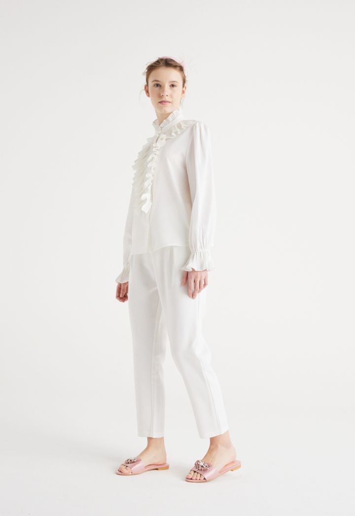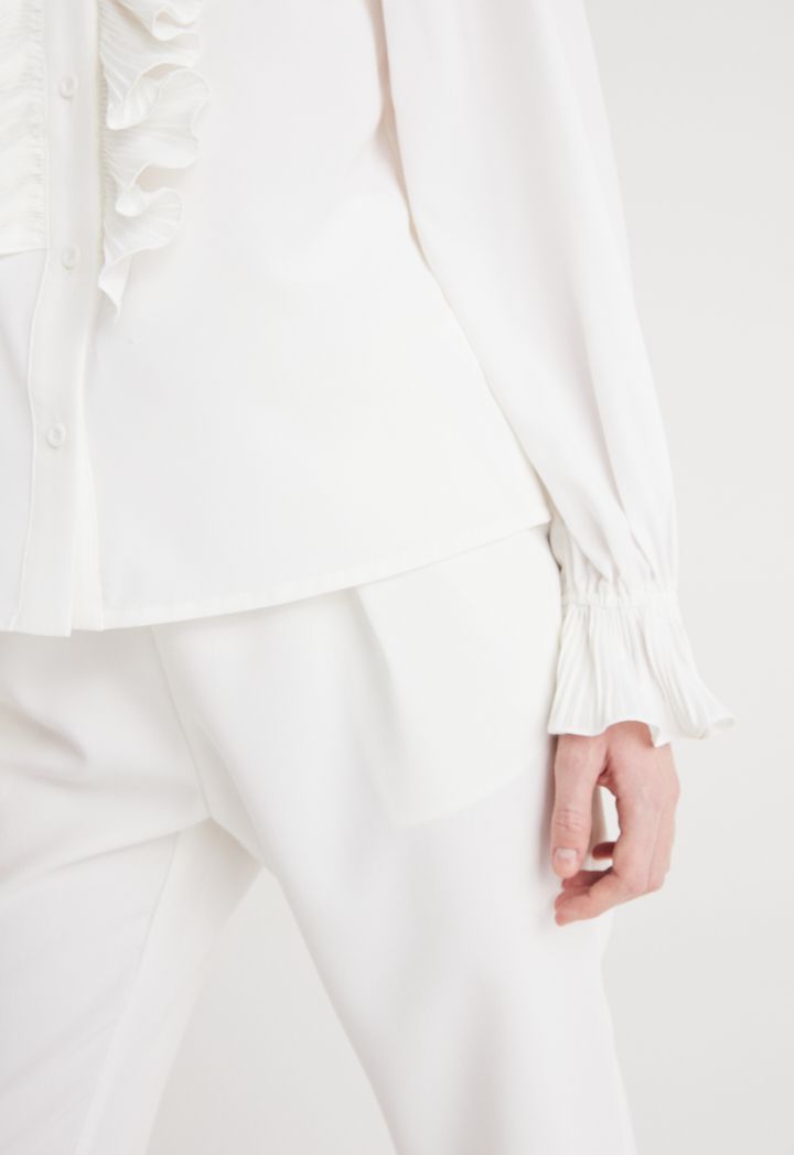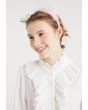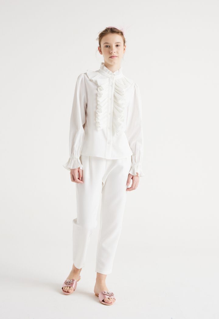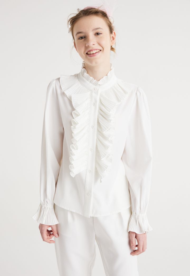 A long sleeved pleated ruffled blouse that could be easily paired with your little girls favorite bottoms.