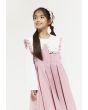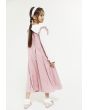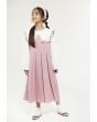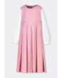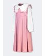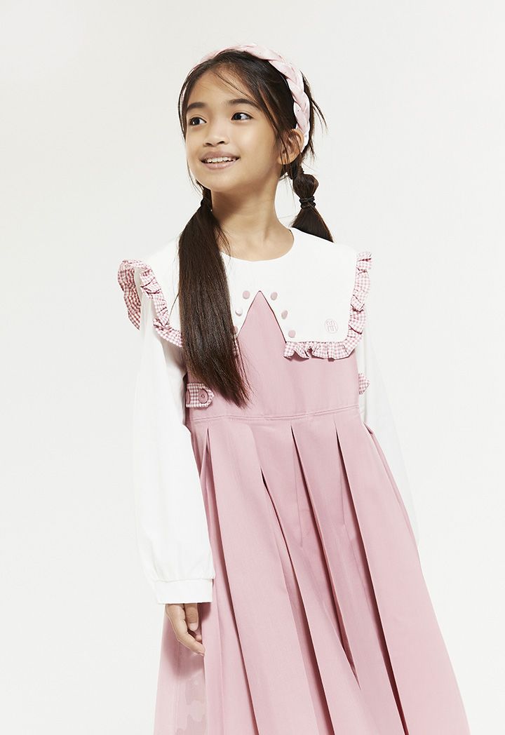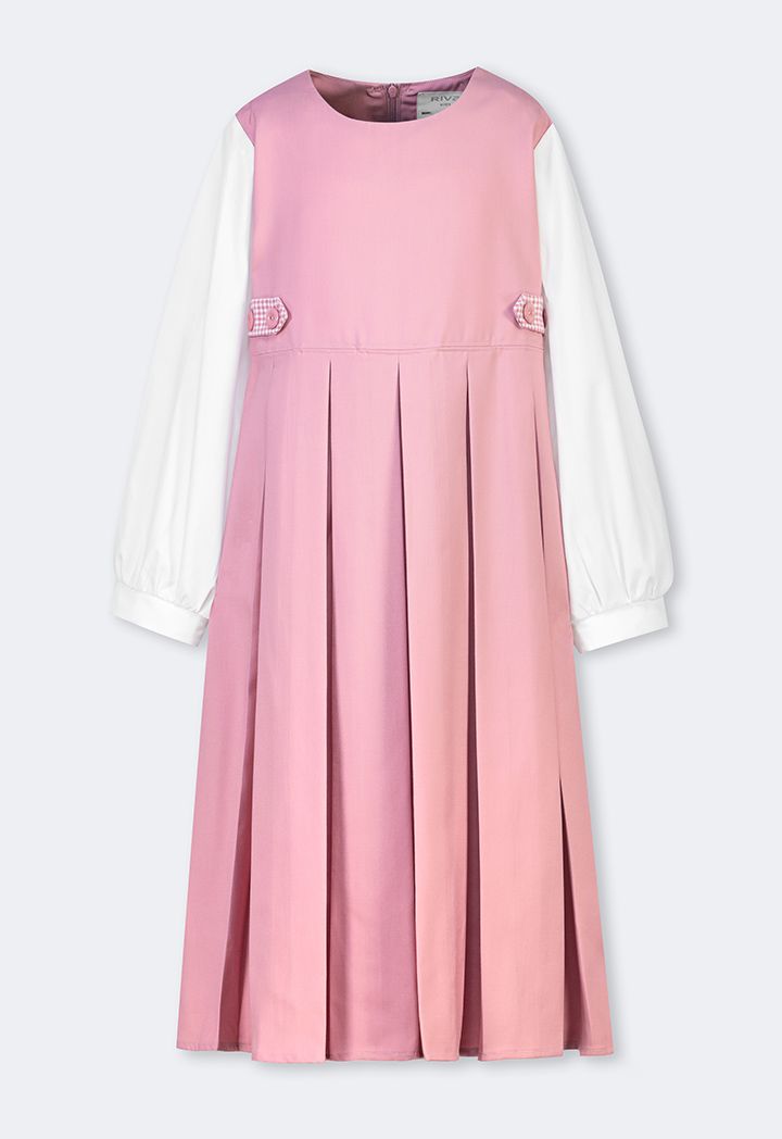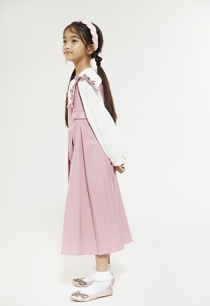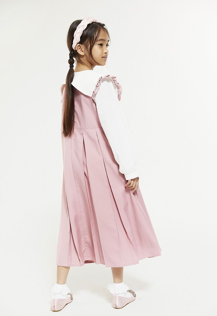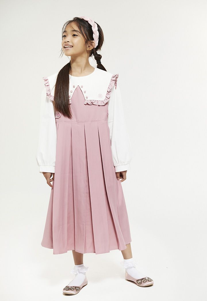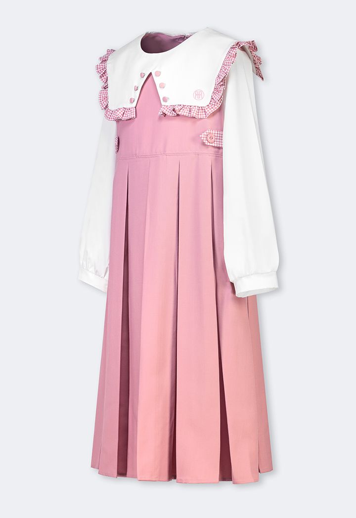 A unique school dress that features a detachable collar, long sleeves with a pleated skirt.