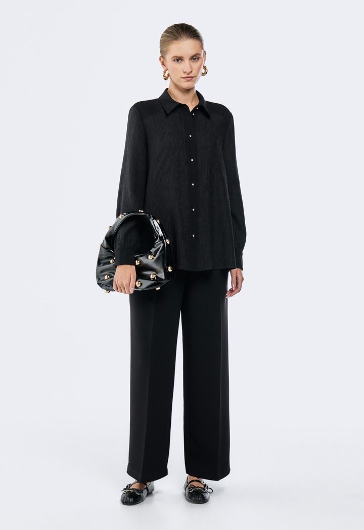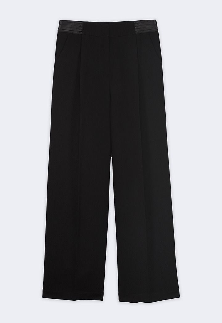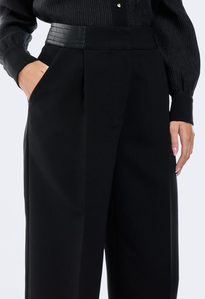 Step into bold elegance with our Pleated Waist PU Leather Trim Trousers, where chic meets comfort.