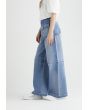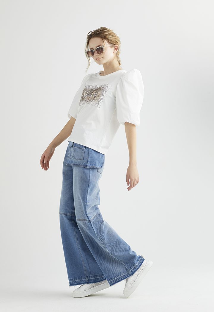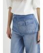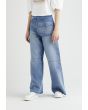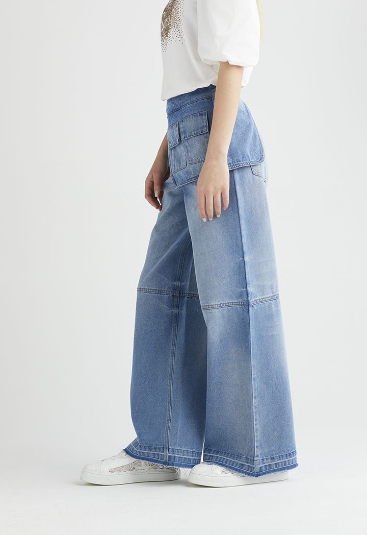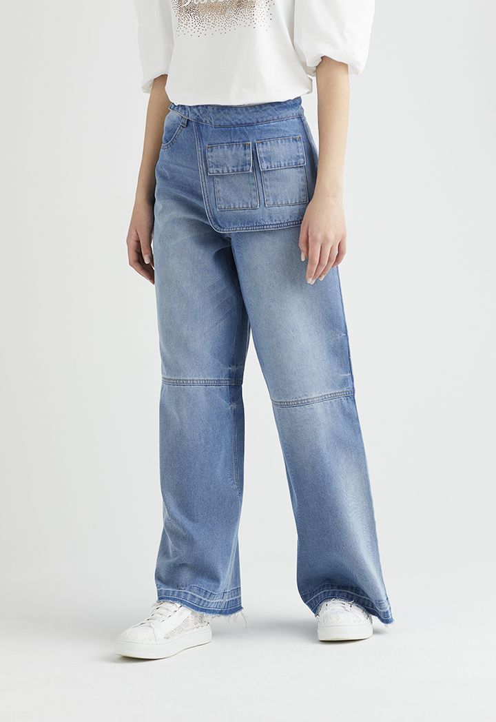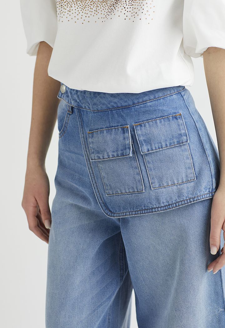 A modern pair of denim jeans that features an overlay pocketed waist and a straight leg design.
