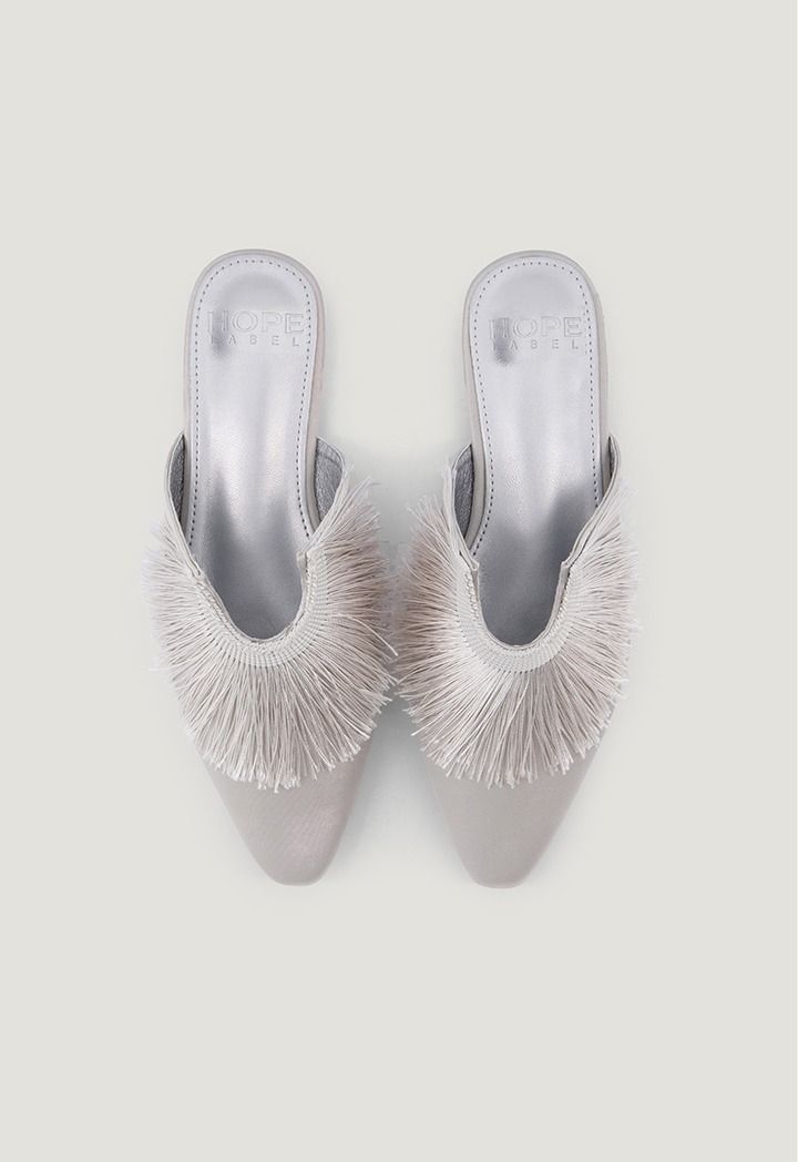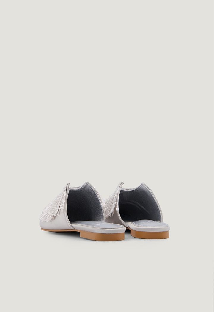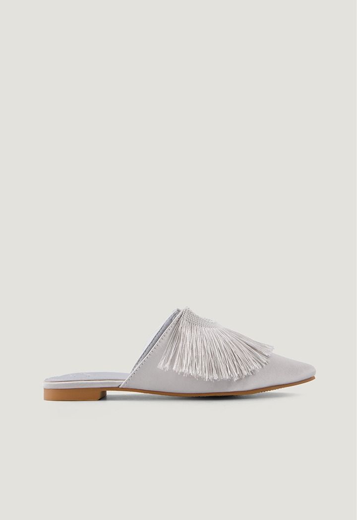 A pair of plain mules with simple touches, featuring a pointed toe and adorned with tassels that give it the perfect amount of elegance.