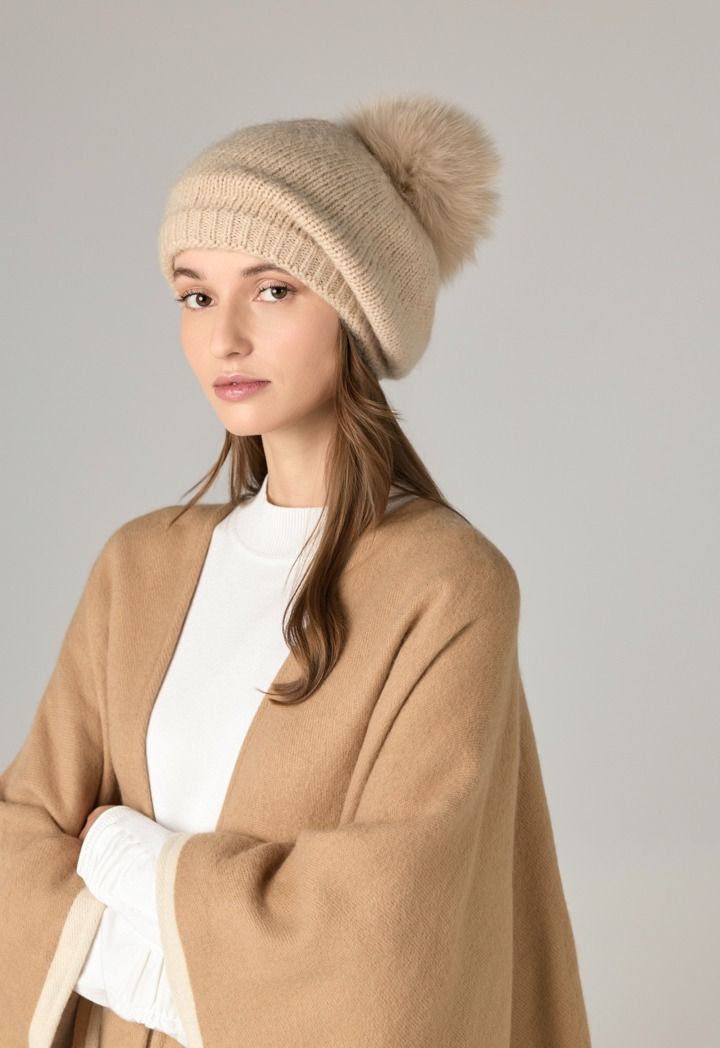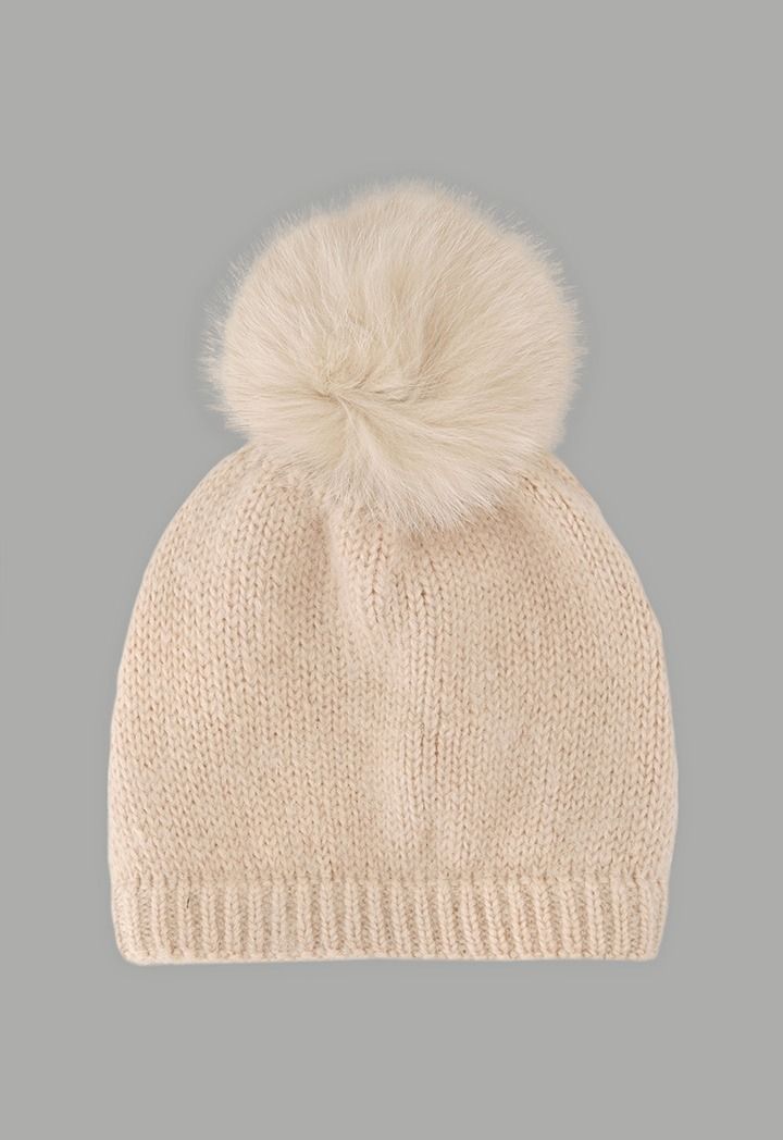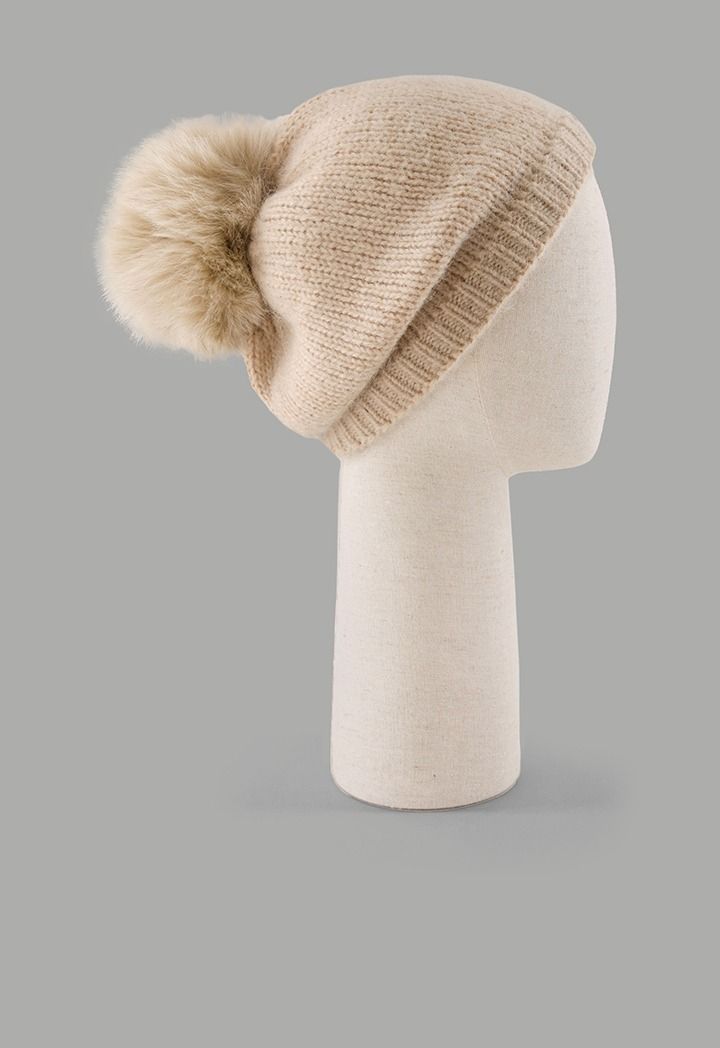 A pom-pom embellished beanie hat, perfect for keeping you warm on winter days.