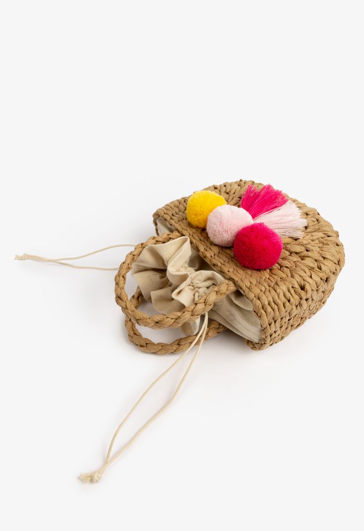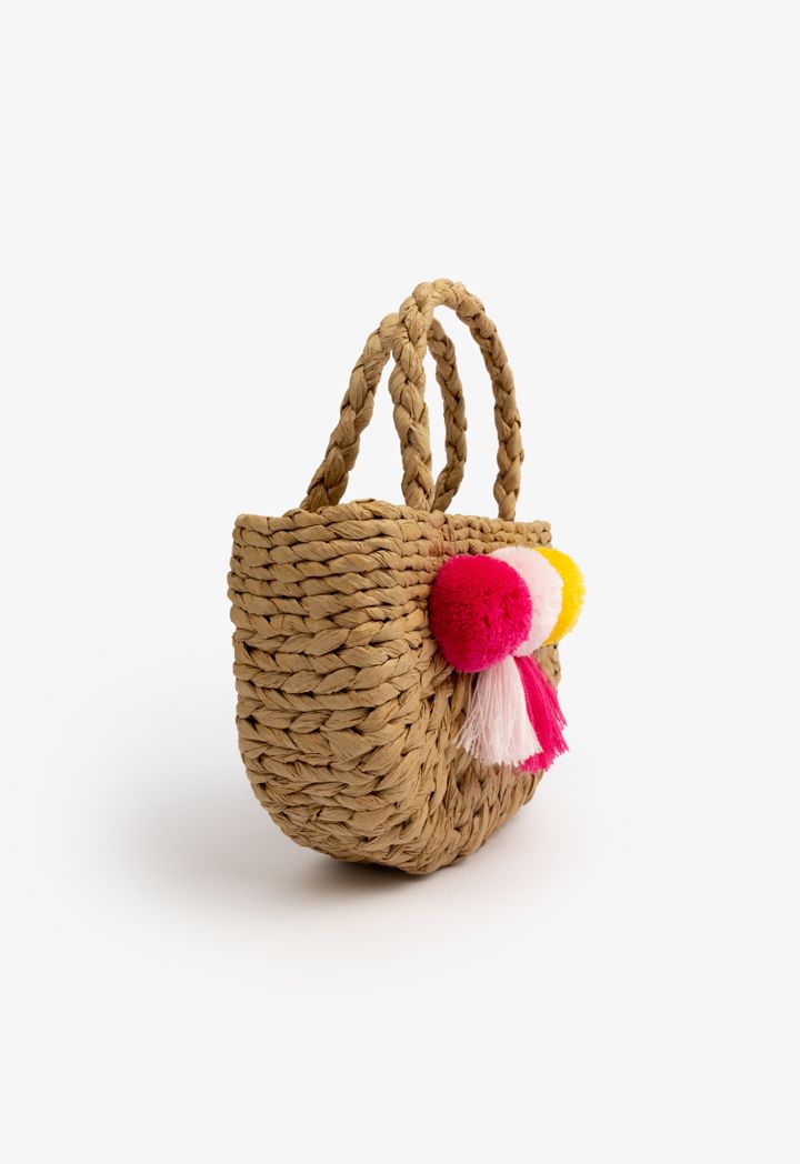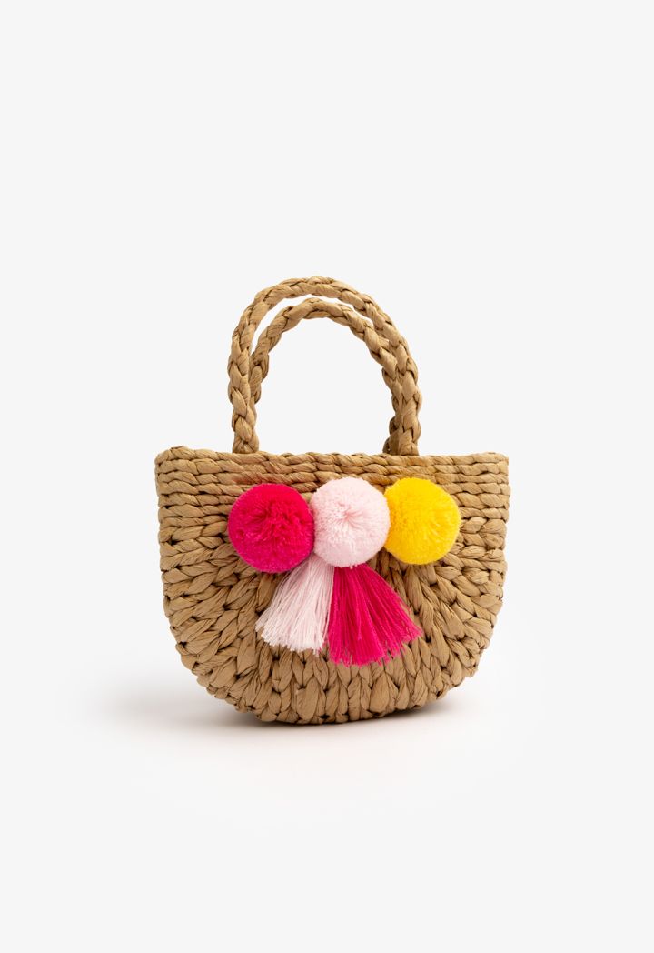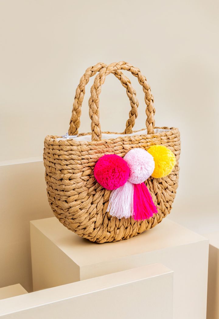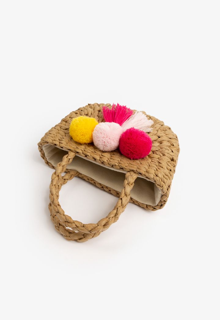 A top handle hand bag that will be your daughters new favorite bag, thanks to its fun and stylish pom pom design.