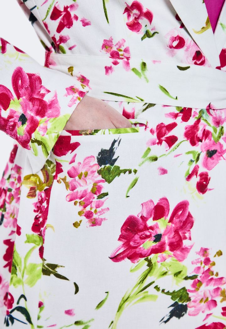 Design: Floral Print, Flap Pockets, Attached Lining, Belted, Single Breasted