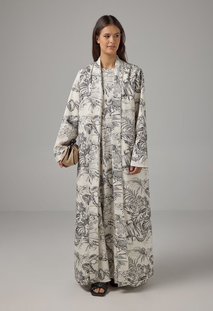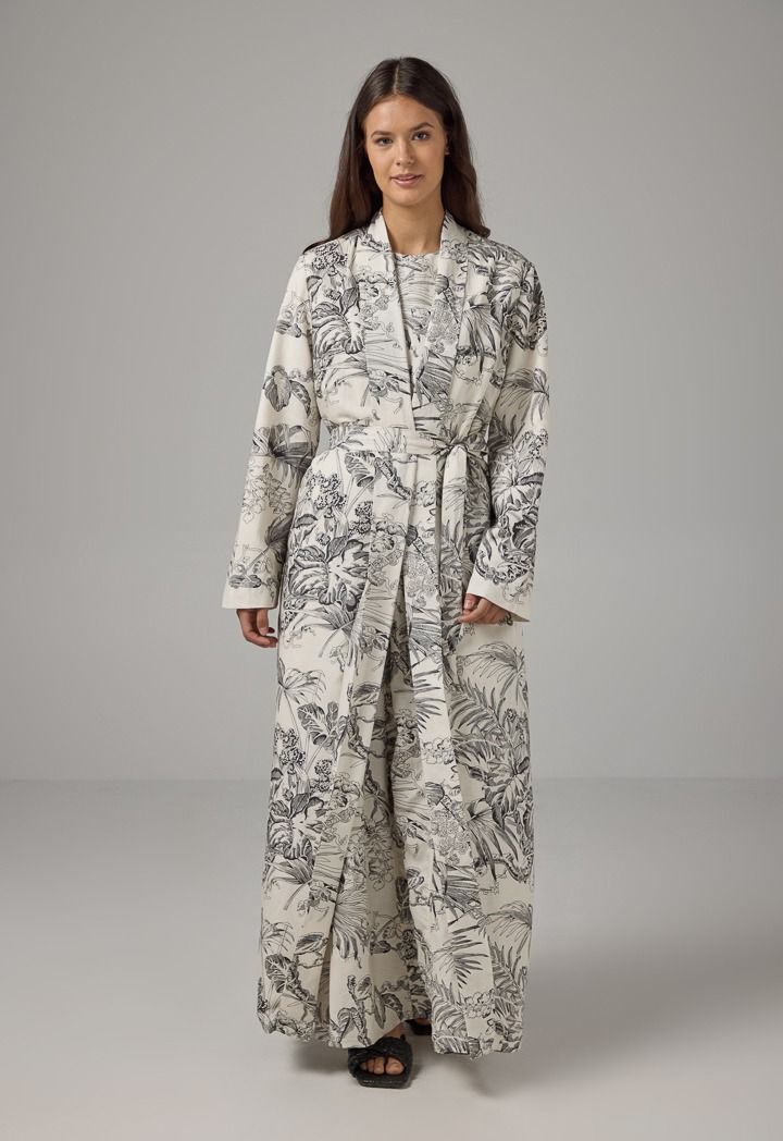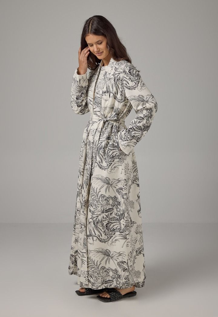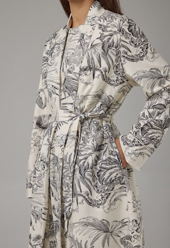 Design: Printed, Belted, Side Pockets, Attached Lining