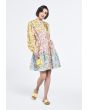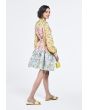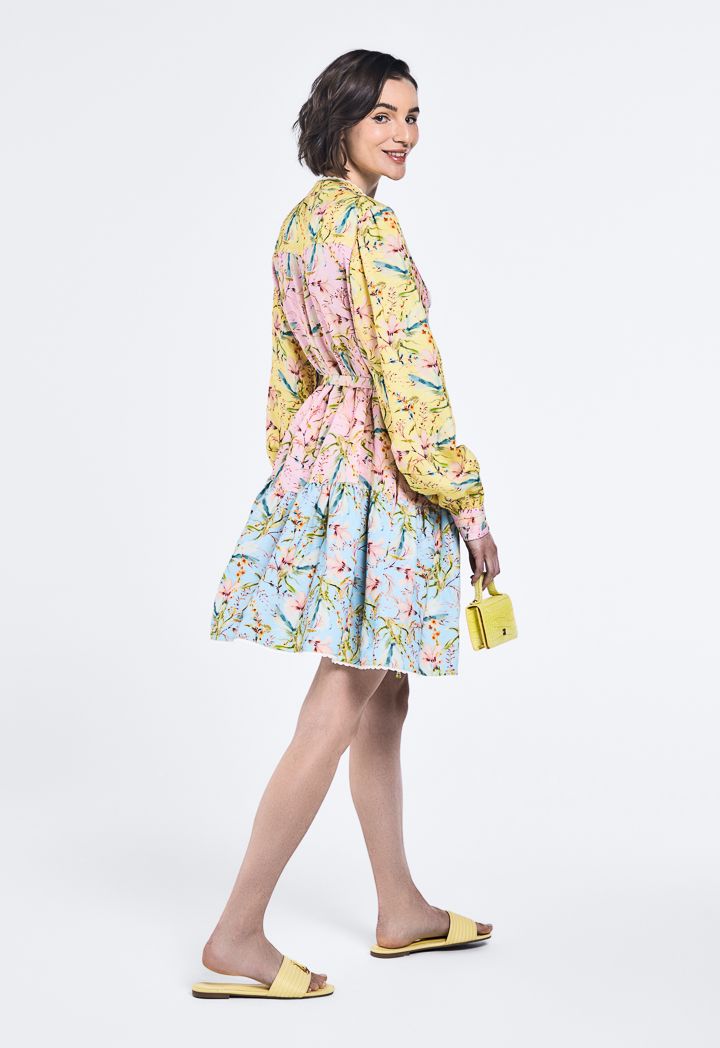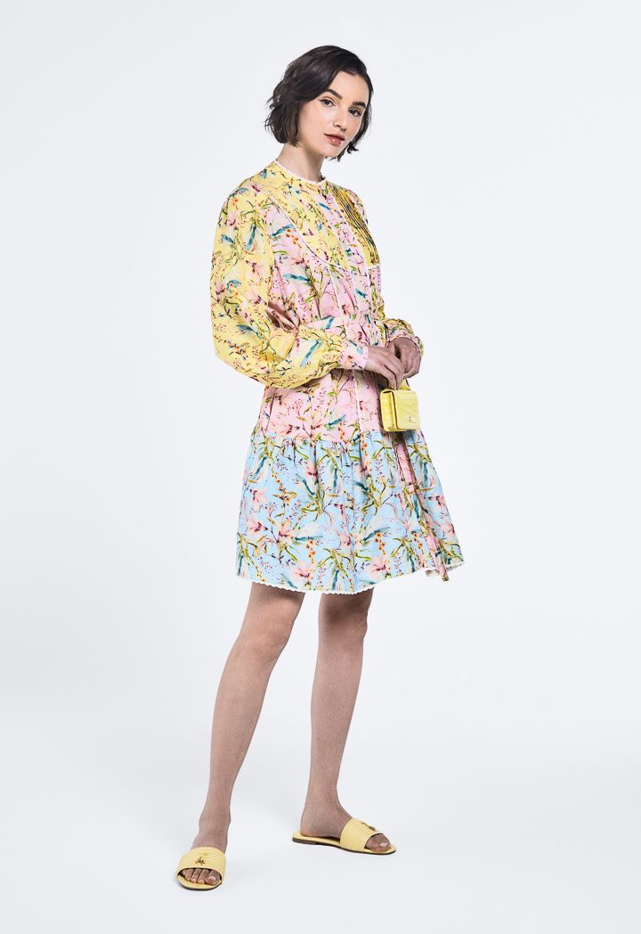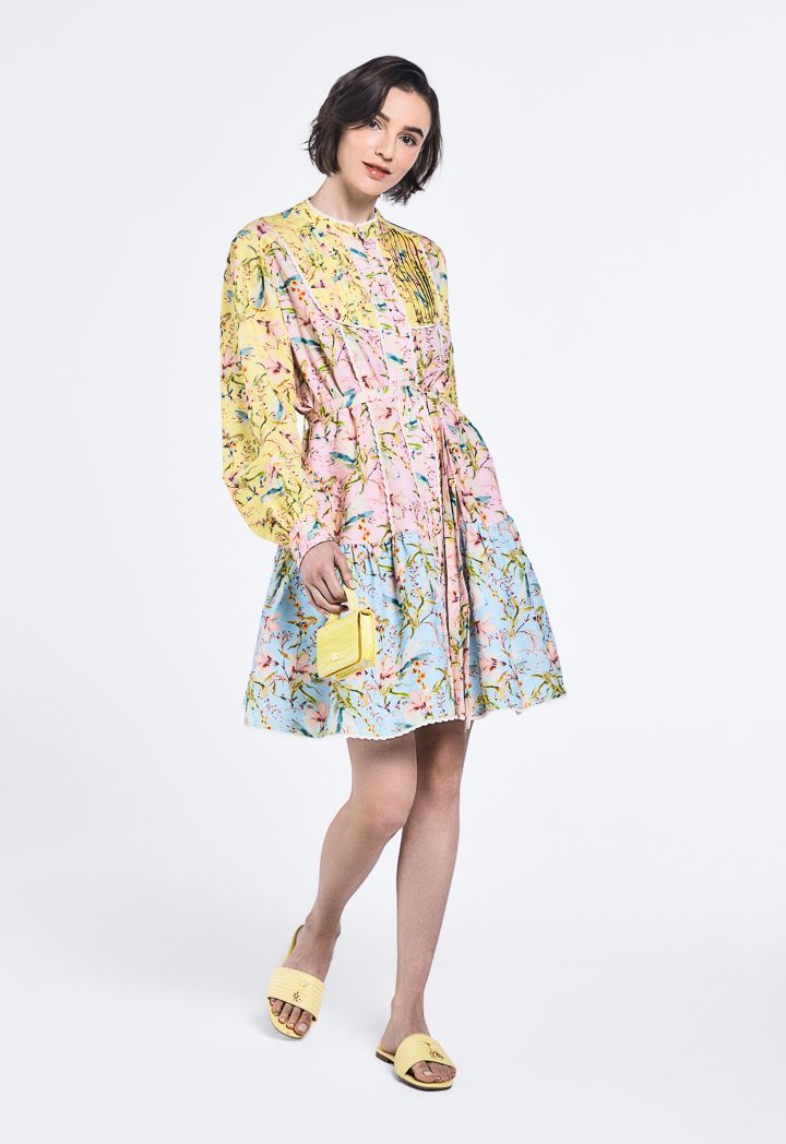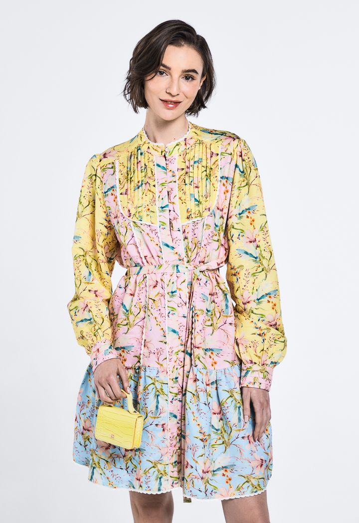 Design: Floral Print, Belted, Pleated, Lace, Flared, Side Pockets, Ruffled Hem
