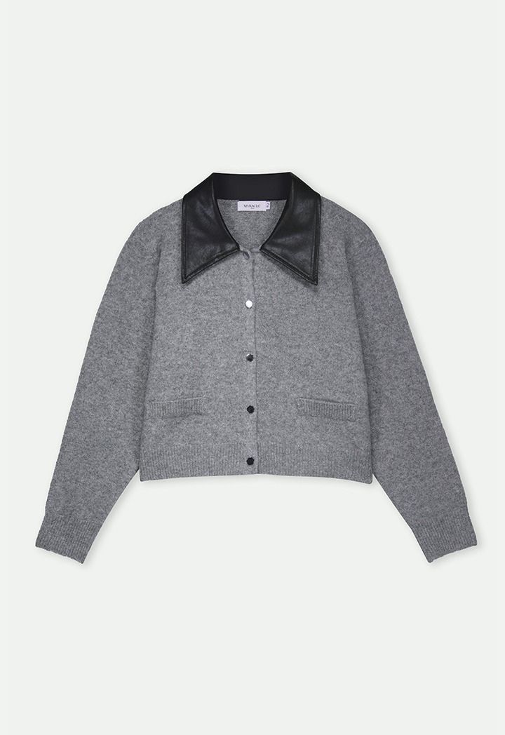 A cardigan with a contrast PU Leather collar combining comfort with a modern edge .