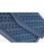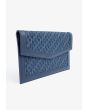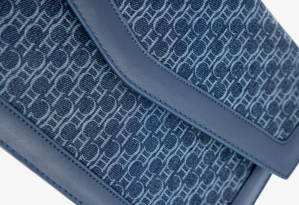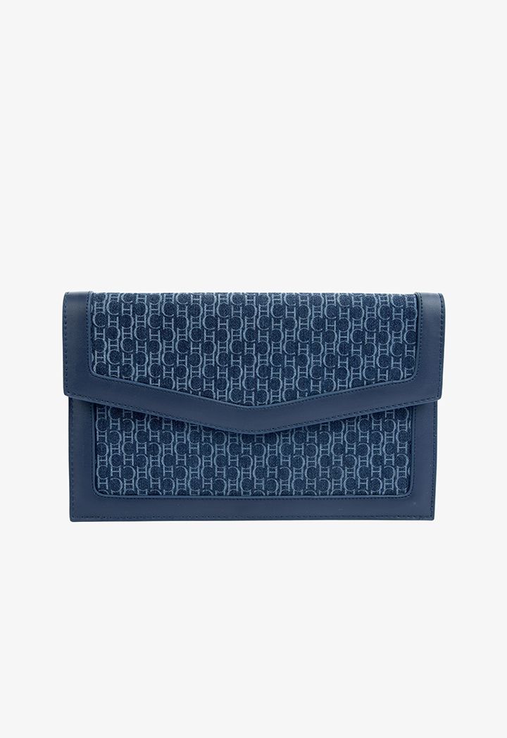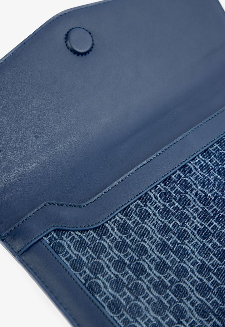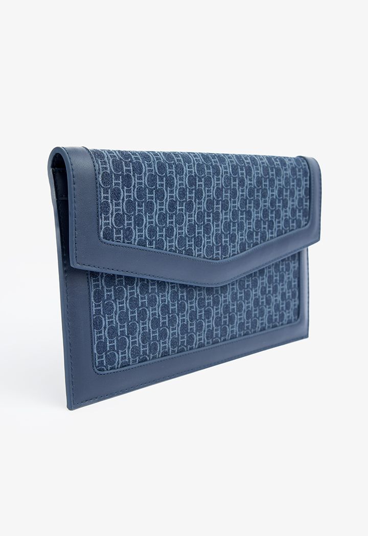 A versatile design of a clutch bags, featuring an artistic denim monogram print and an envelope design.