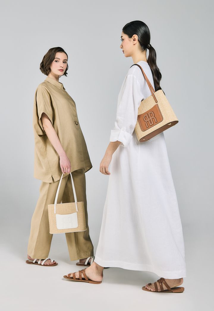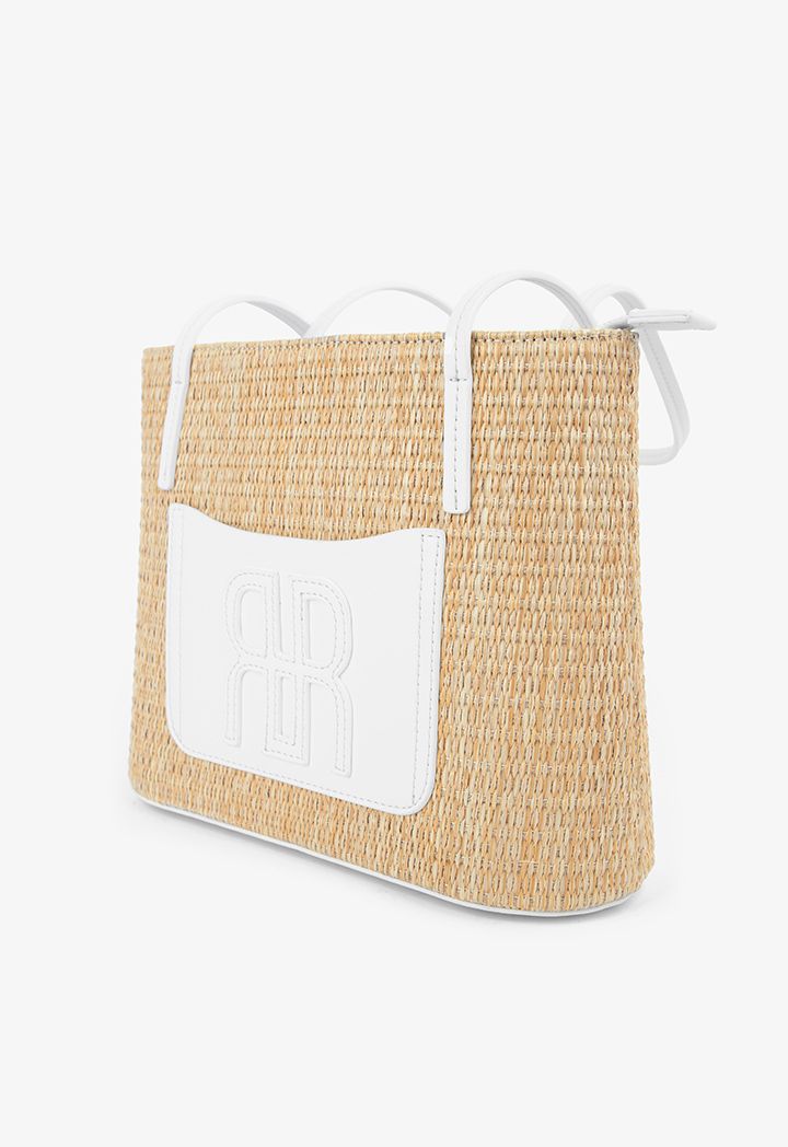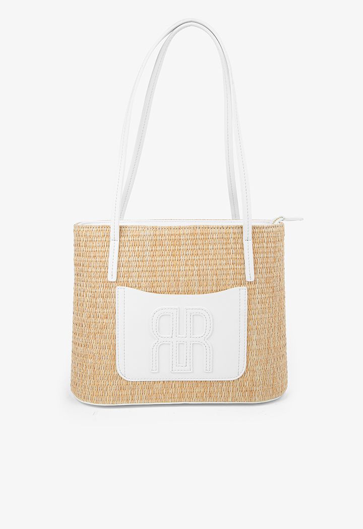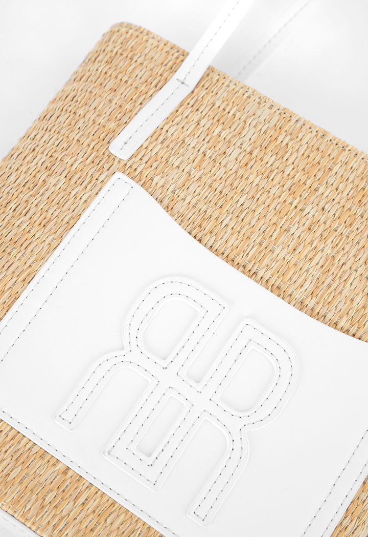 A chic tote bag that features a durable faux straw and PU leather design, in addition to dual shoulder straps.