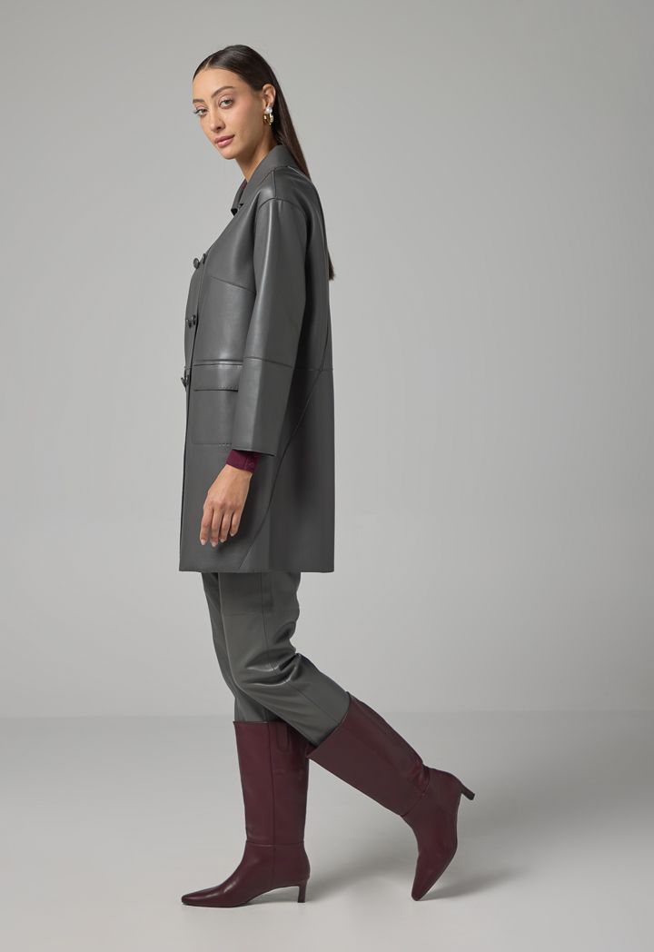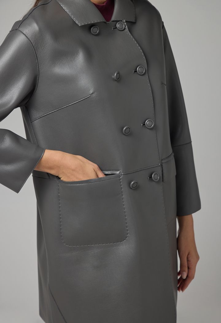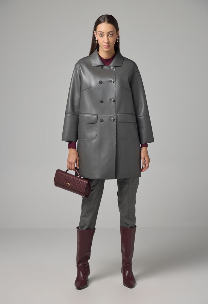 Design: Solid, Double Breasted, PU Leather, Flap Pockets