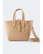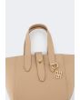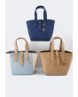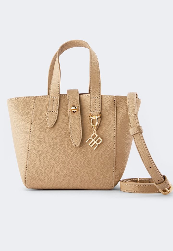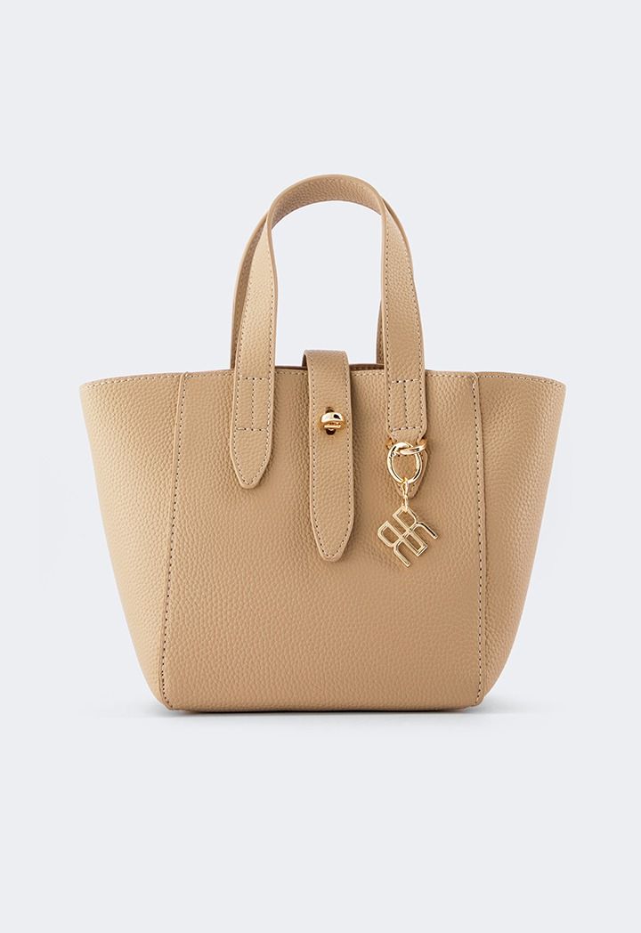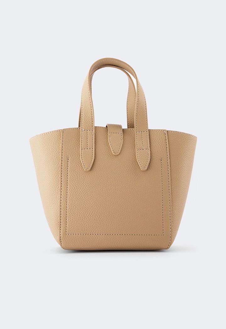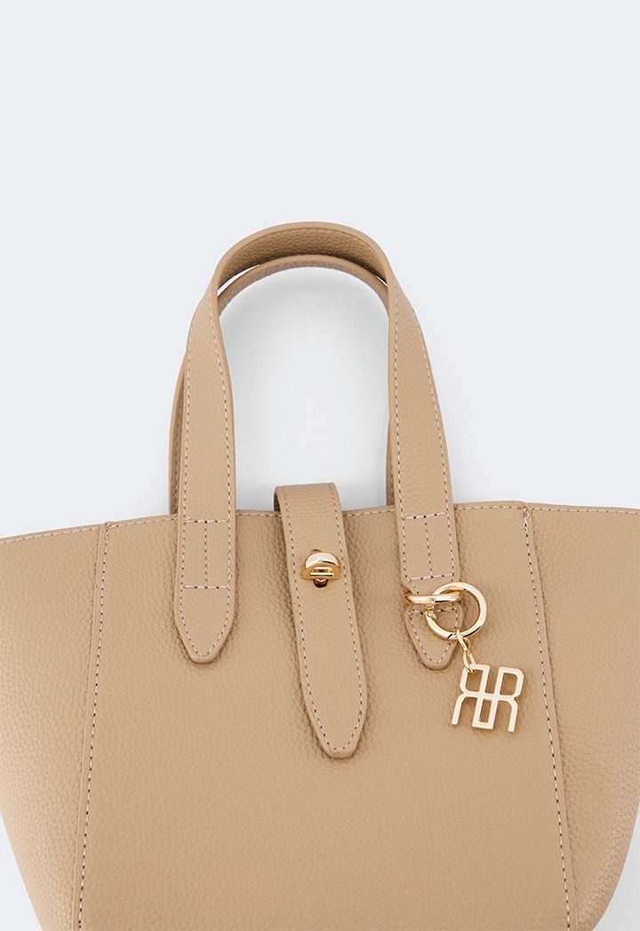 This unique bucket bag features a solid PU leather design, it includes top handles and a Turn lock.