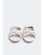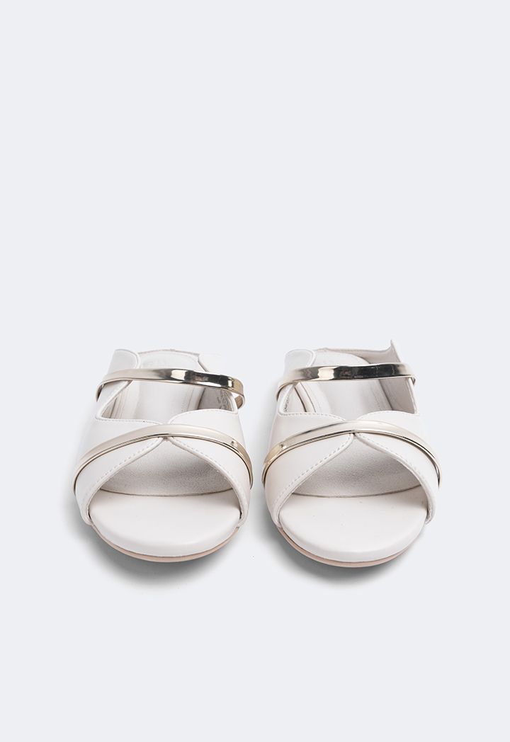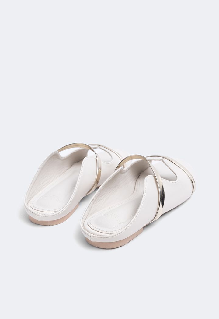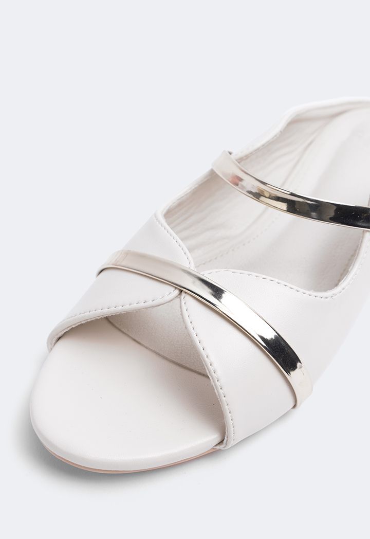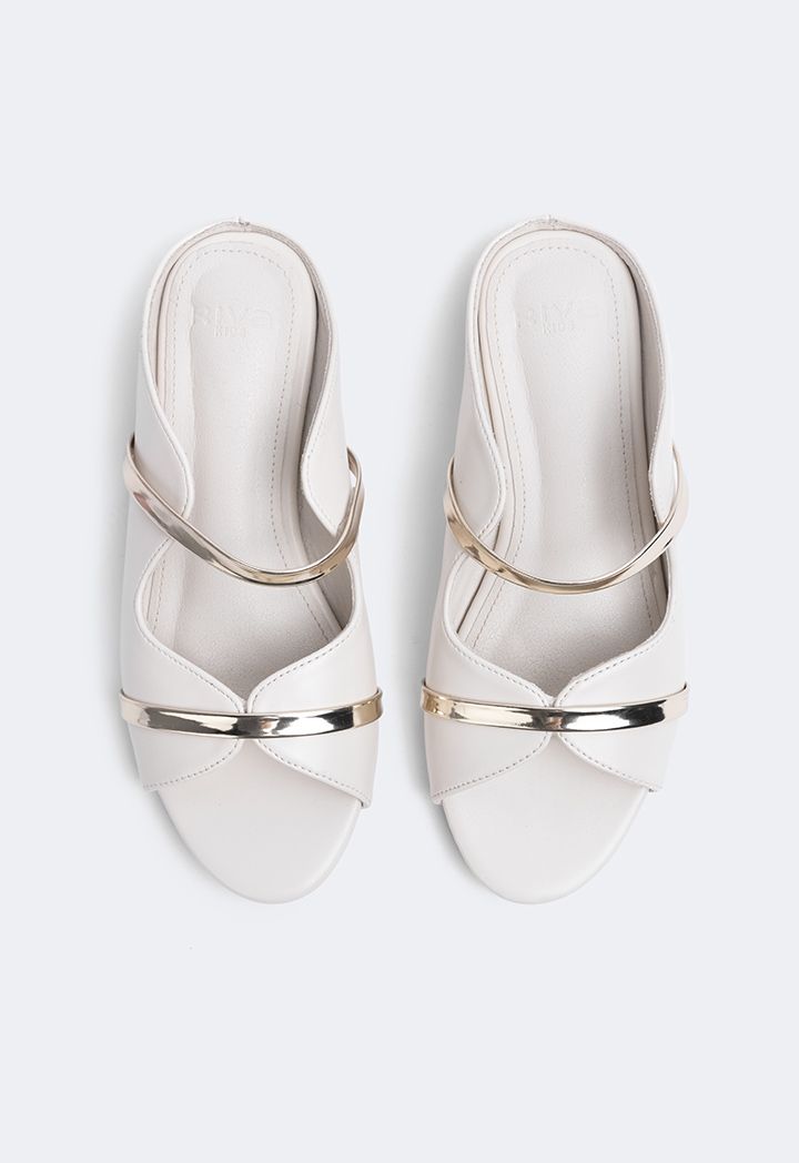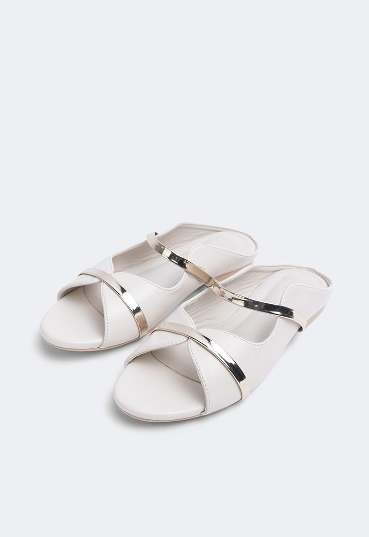 A pair of solid mules with a simple touch of metallic straps giving it just the perfect amount of elegance.