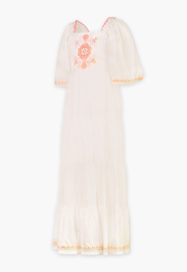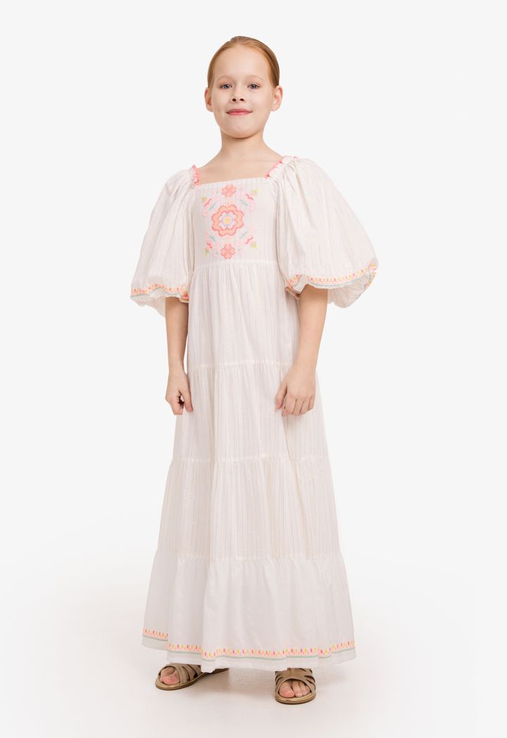 Dress up your little girl for her day in this Striped tiered belted dress. If features a square Neckline, Short Puff Sleeves and Embroidered details.
