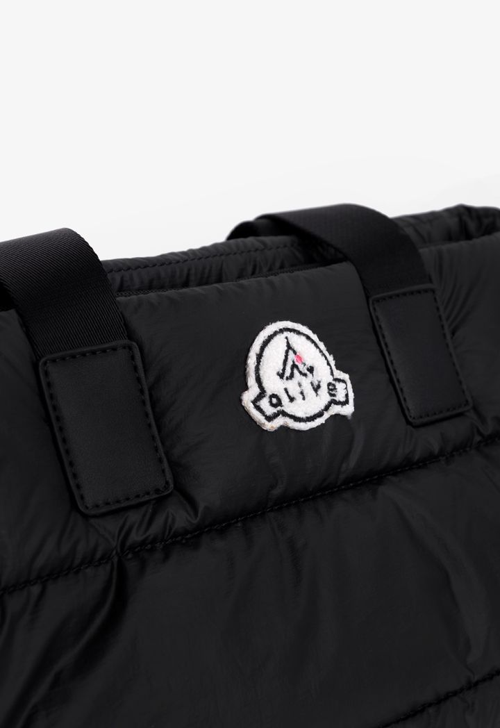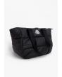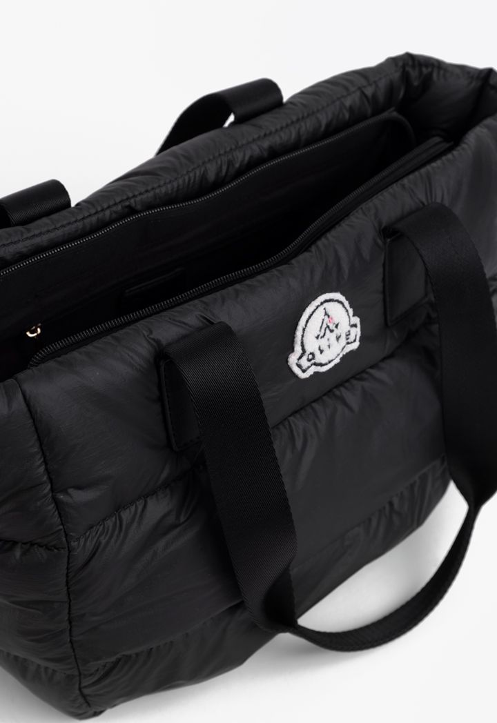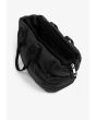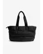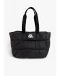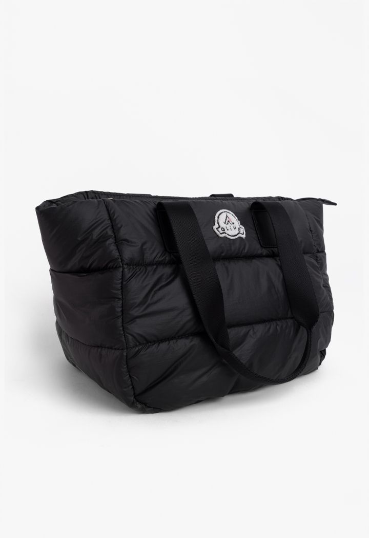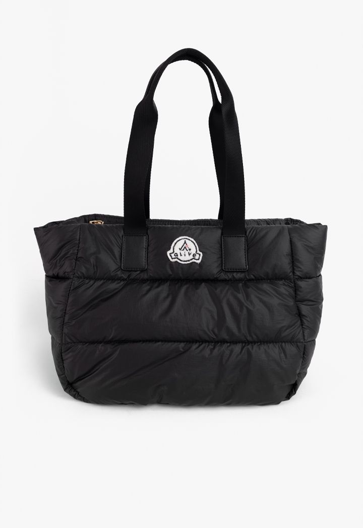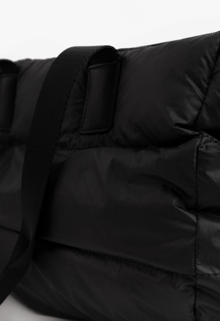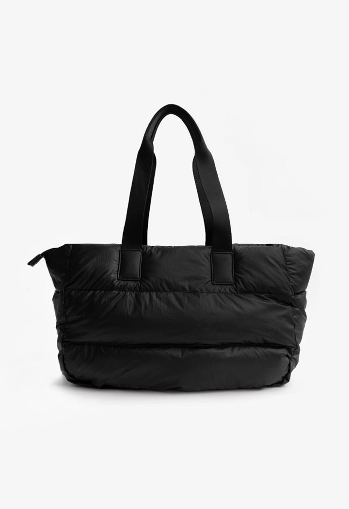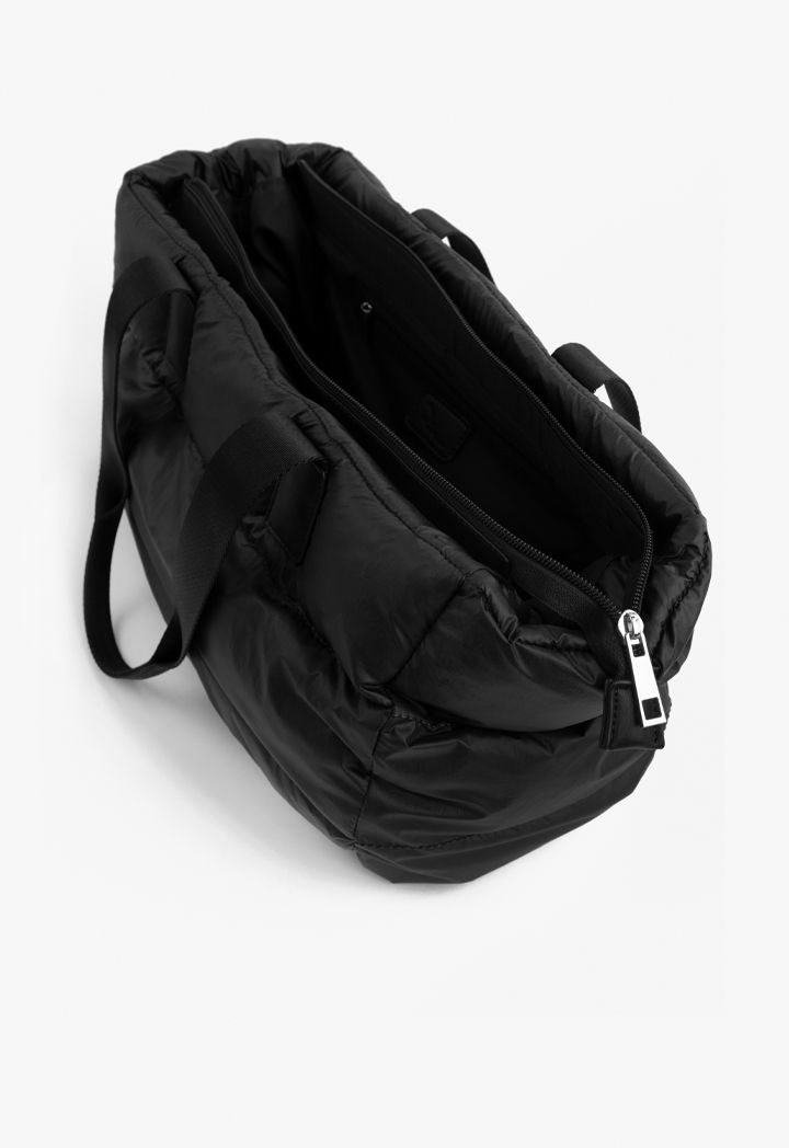 A solid quilted tote that features a top zipper, top handles and a shoulder strap.