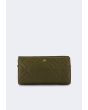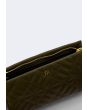 This quilted PU Leather crossbody bag features a detachable strap and a metallic emblem.