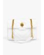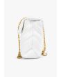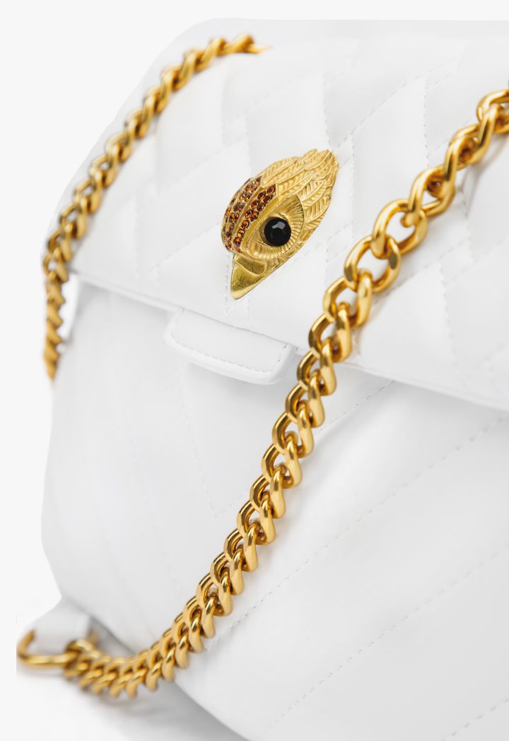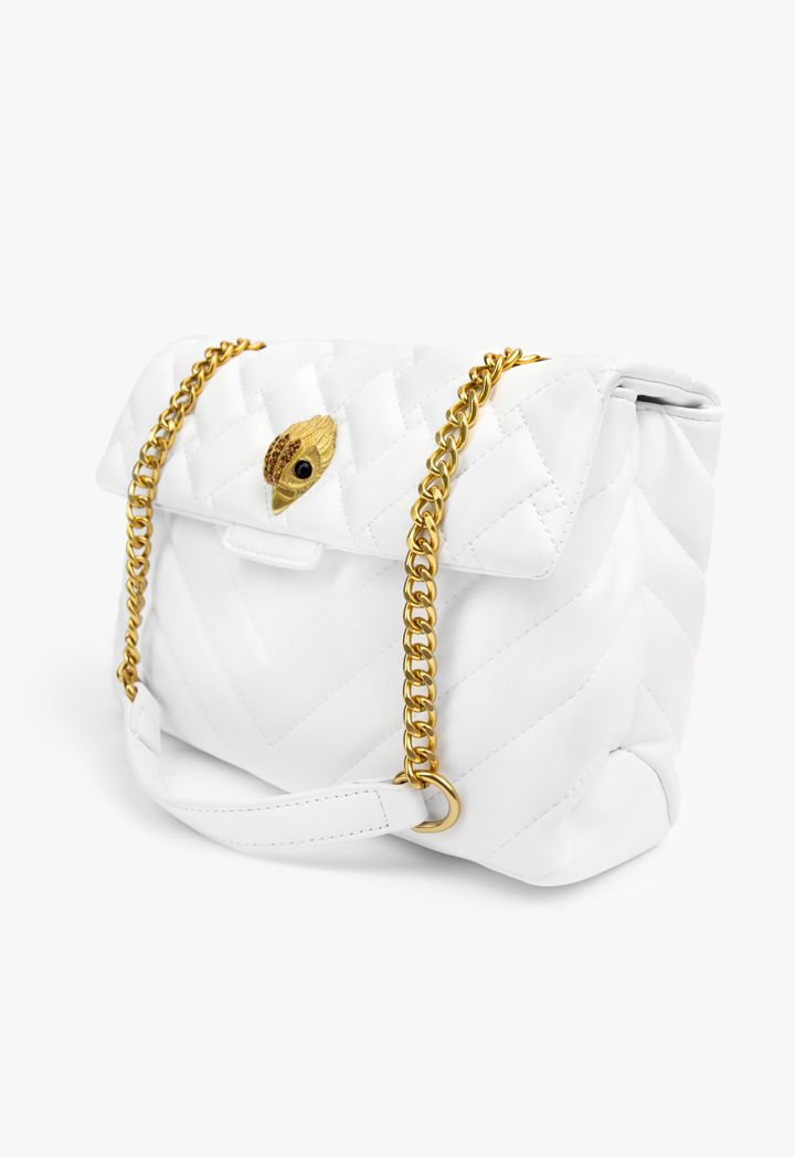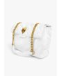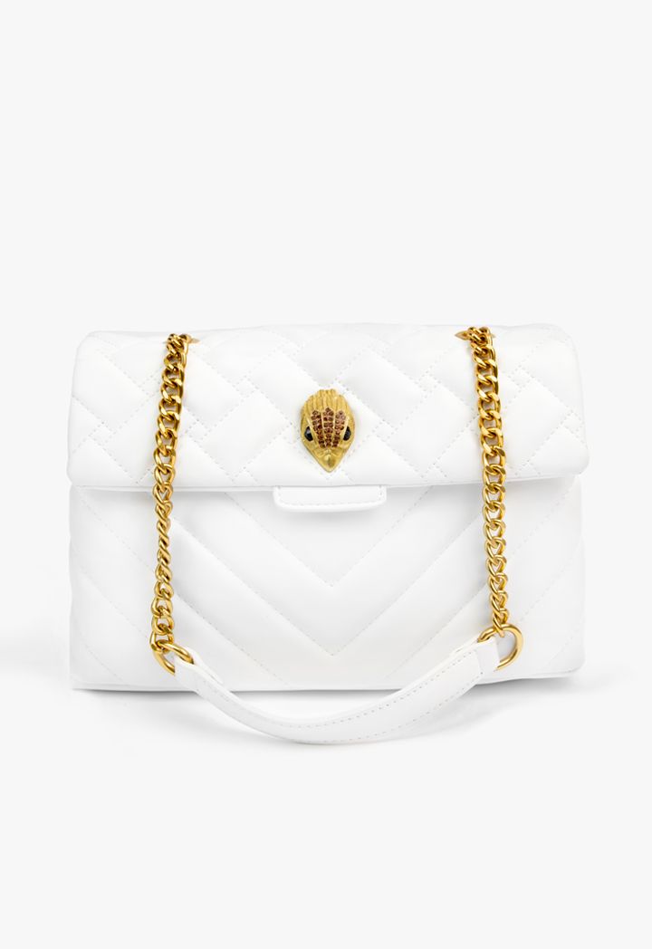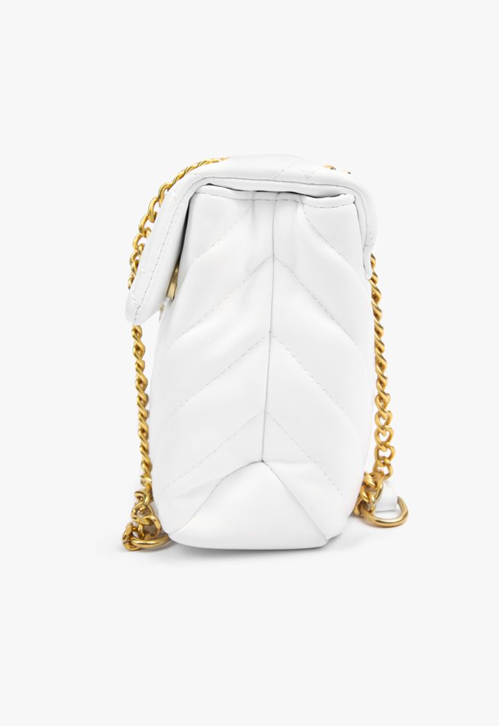 A solid quilted hand bag that is sure to be a classic bag for your looks, featuring an embellished emblem in the center.