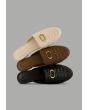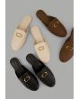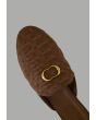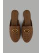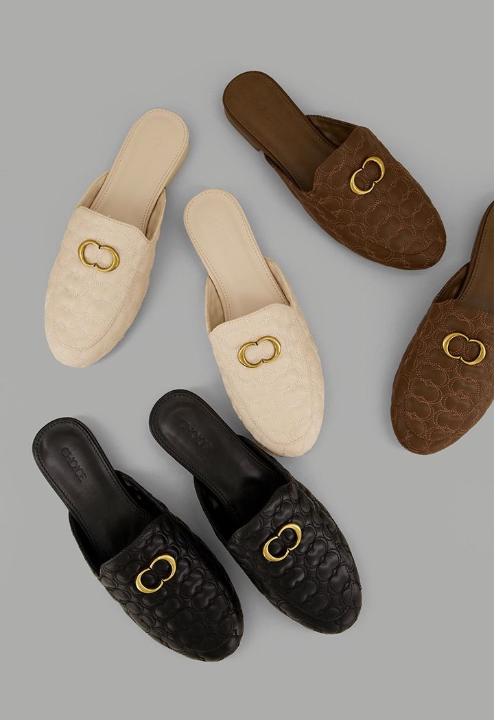 Equip your shoes collection with this unique pair of mules that features a metallic emblem and a quilted design.