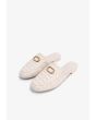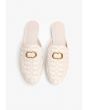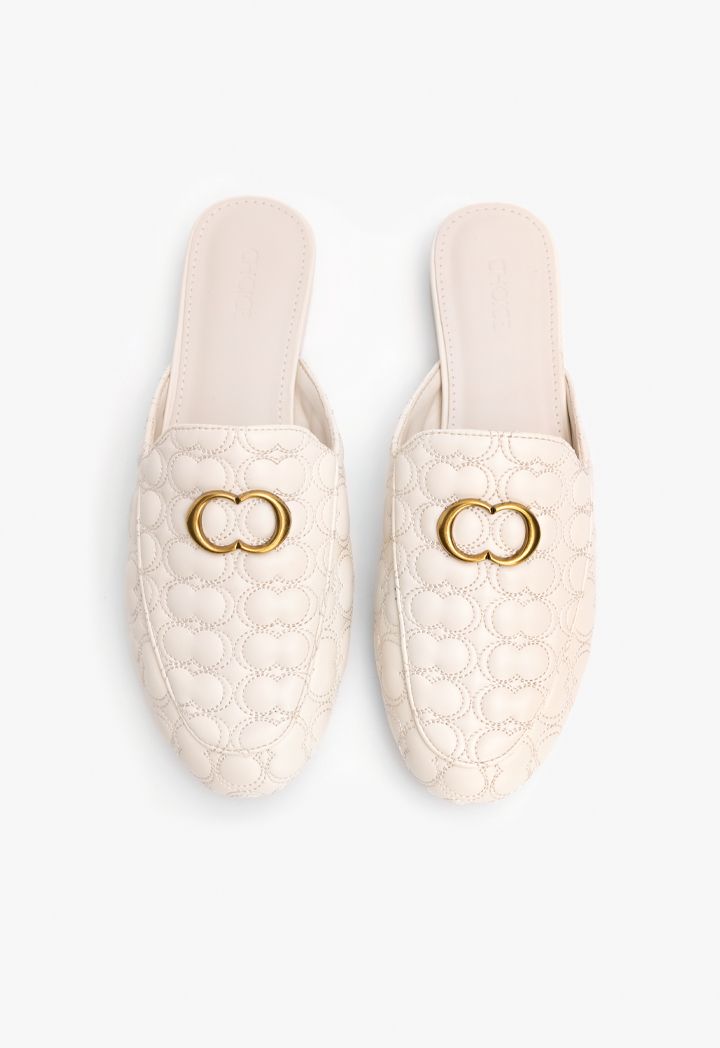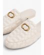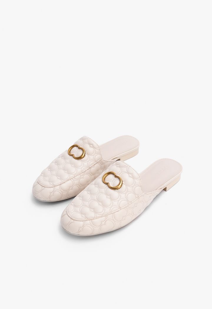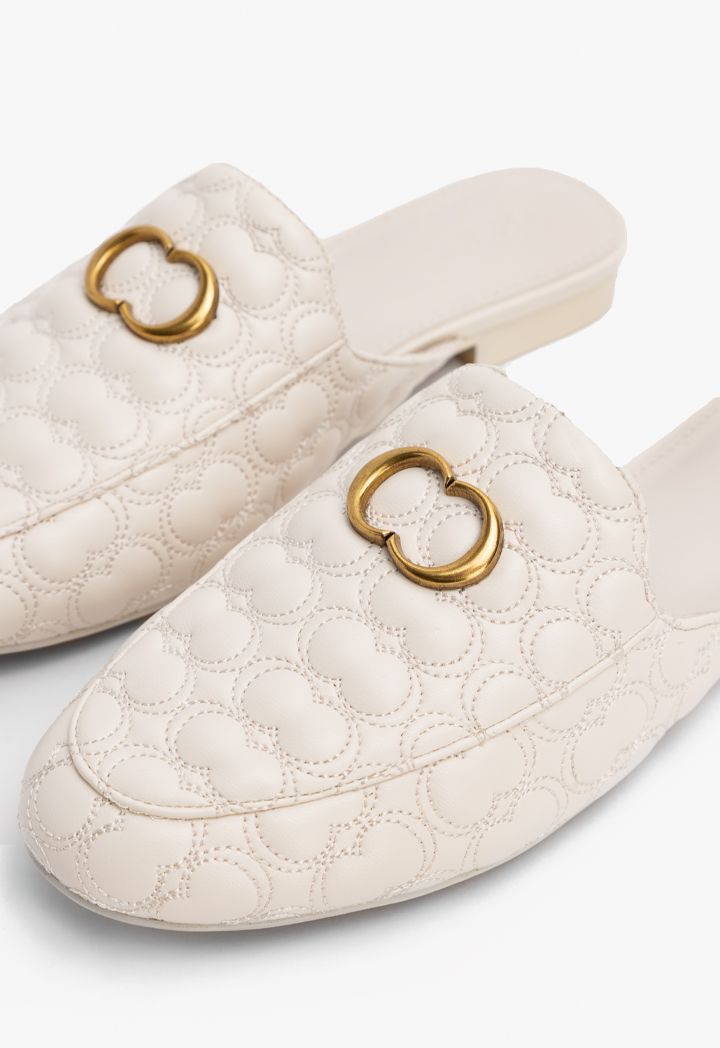 Equip your shoes collection with this unique pair of mules that features a metallic emblem and a quilted design.