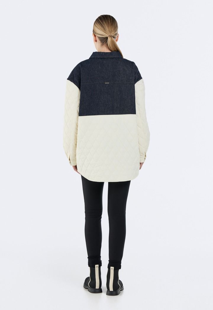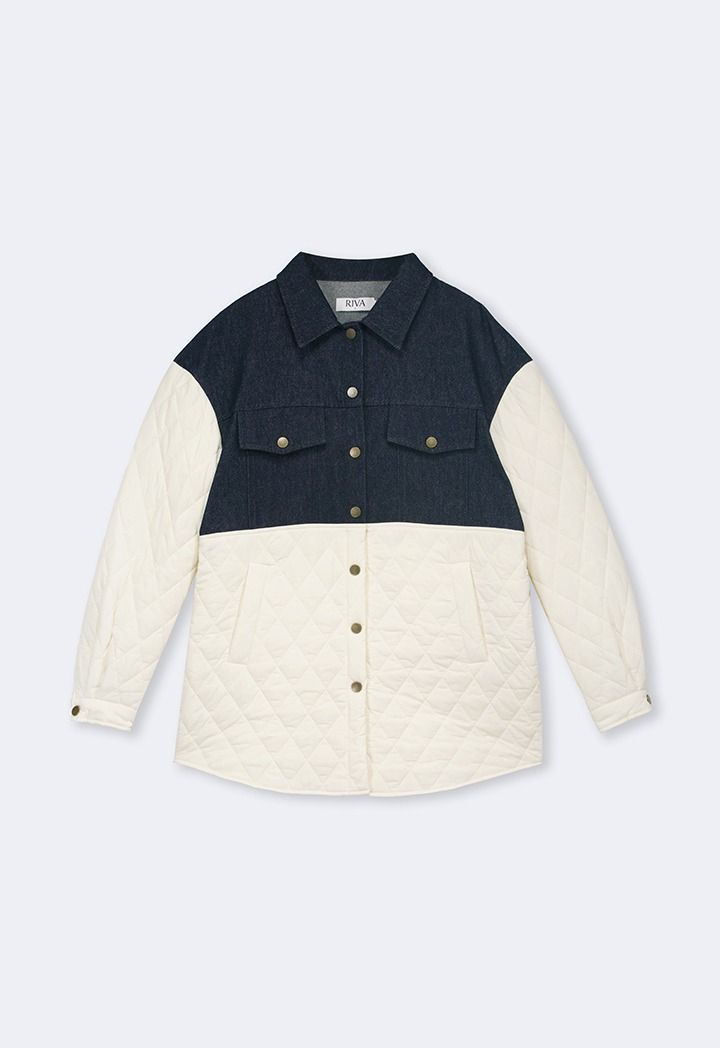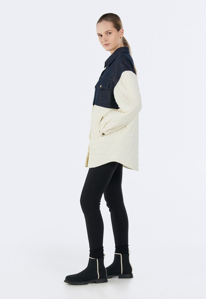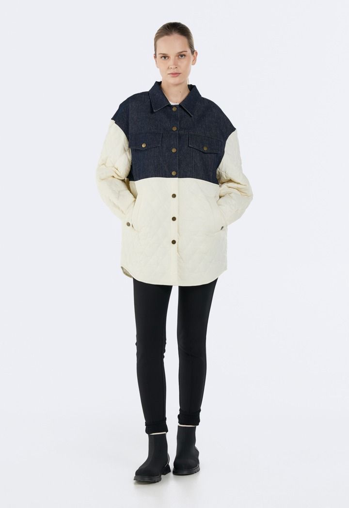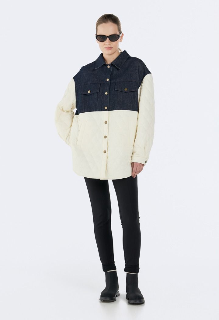 Design: Contrast, Denim Details, Quilted, Drop Shoulders, Faux Flap Pockets, Side Pockets