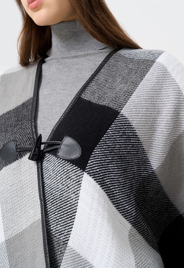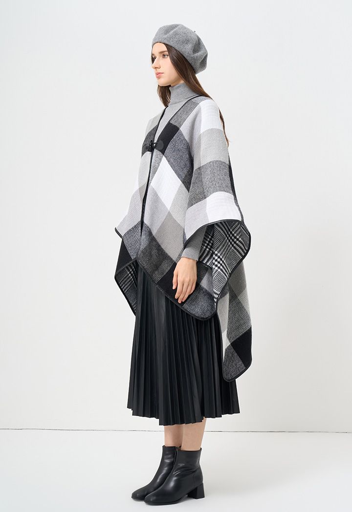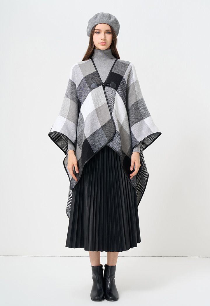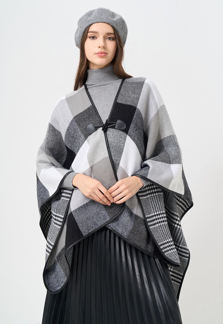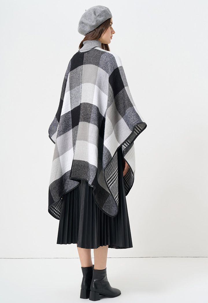 A versatile approach to winter ponchos, featuring dual patterned design that can be worn on either faces.