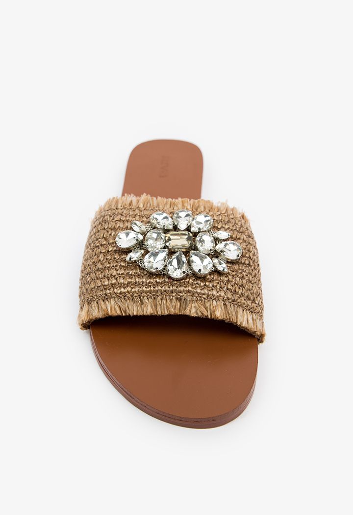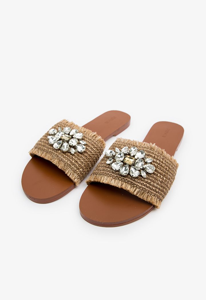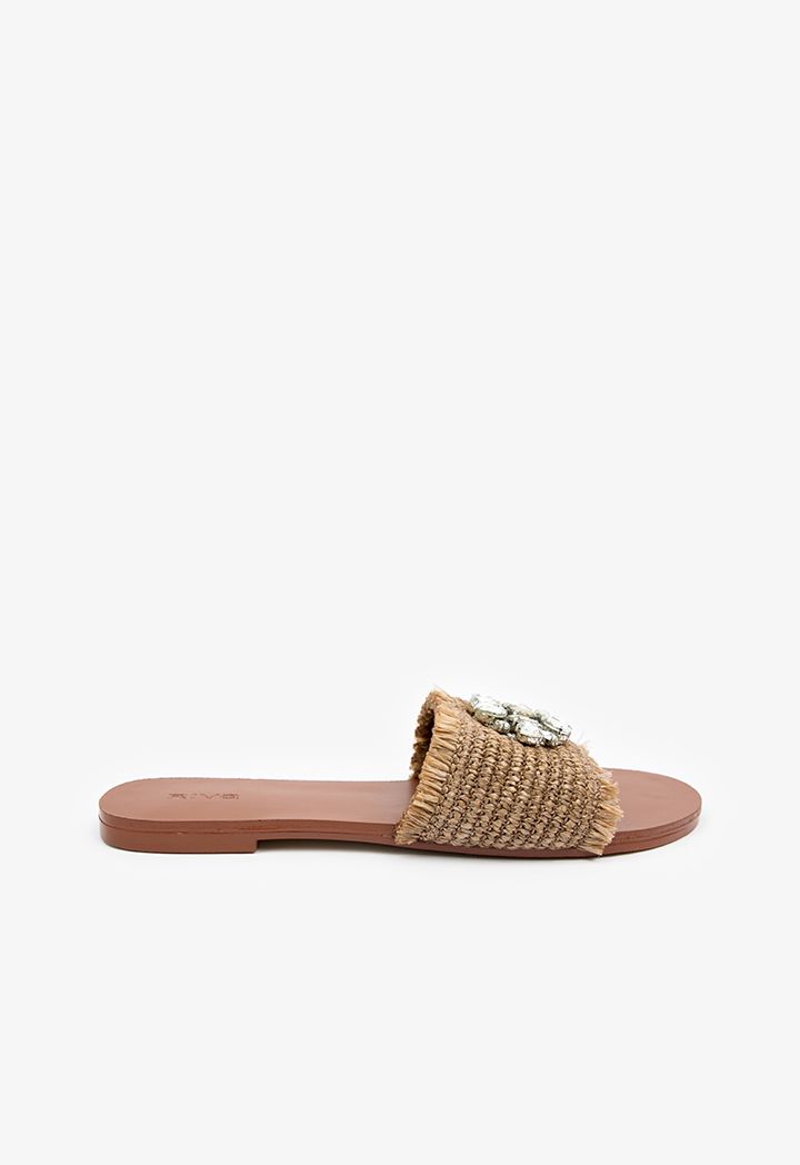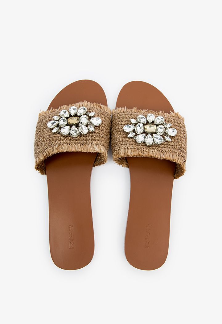 Design : Embellished, Faux Straw, Rhinestones, Branded Sole